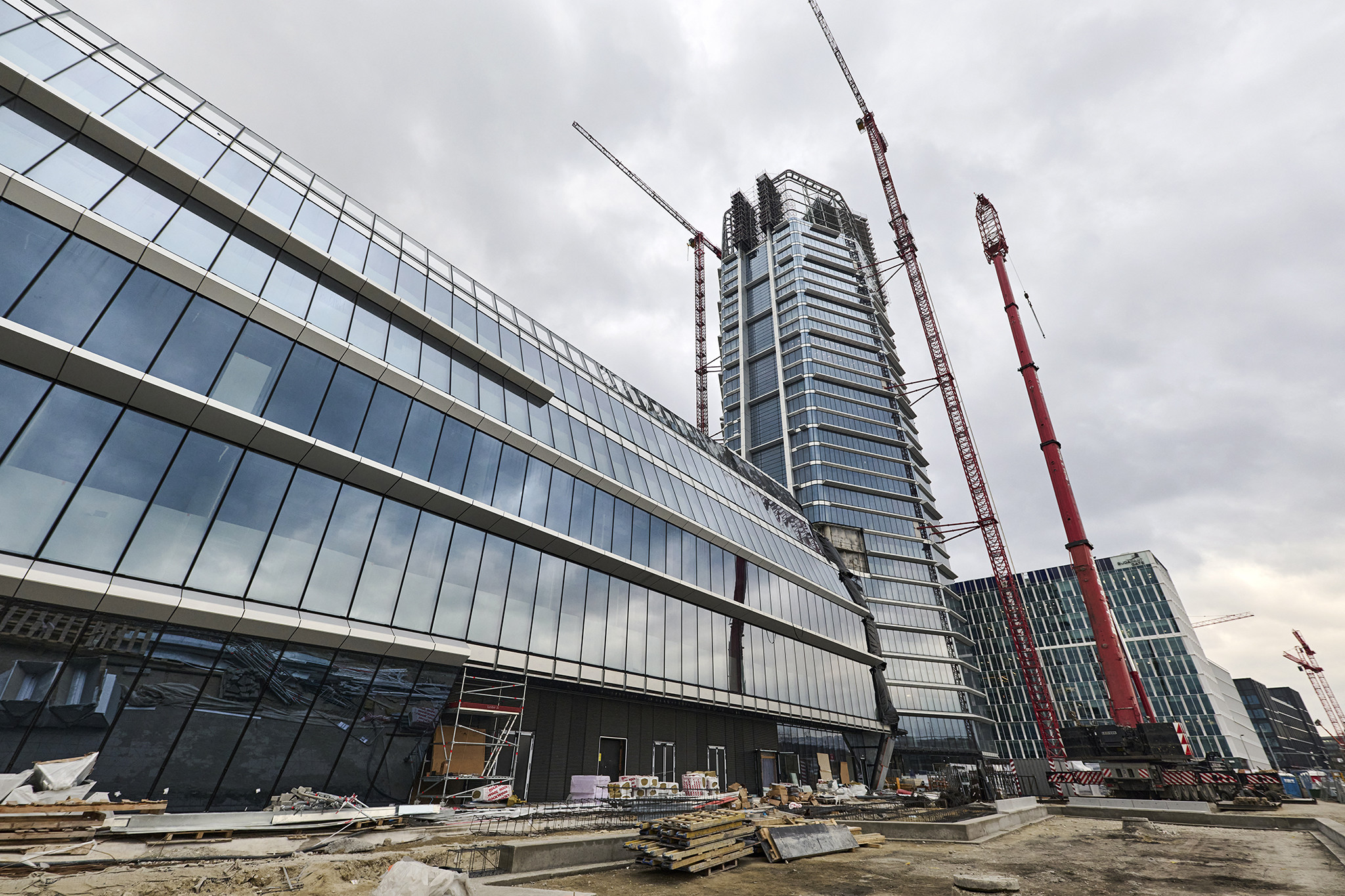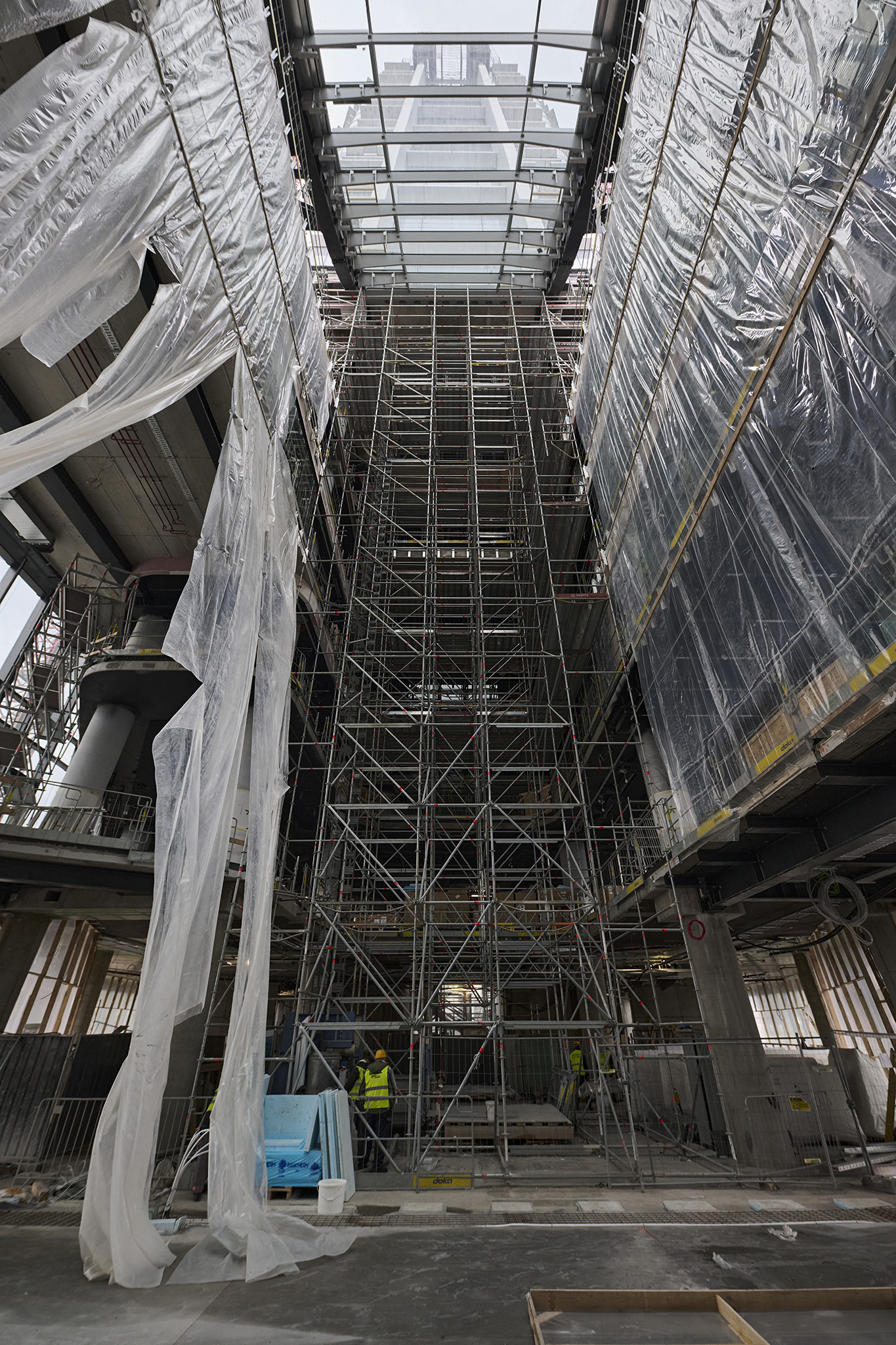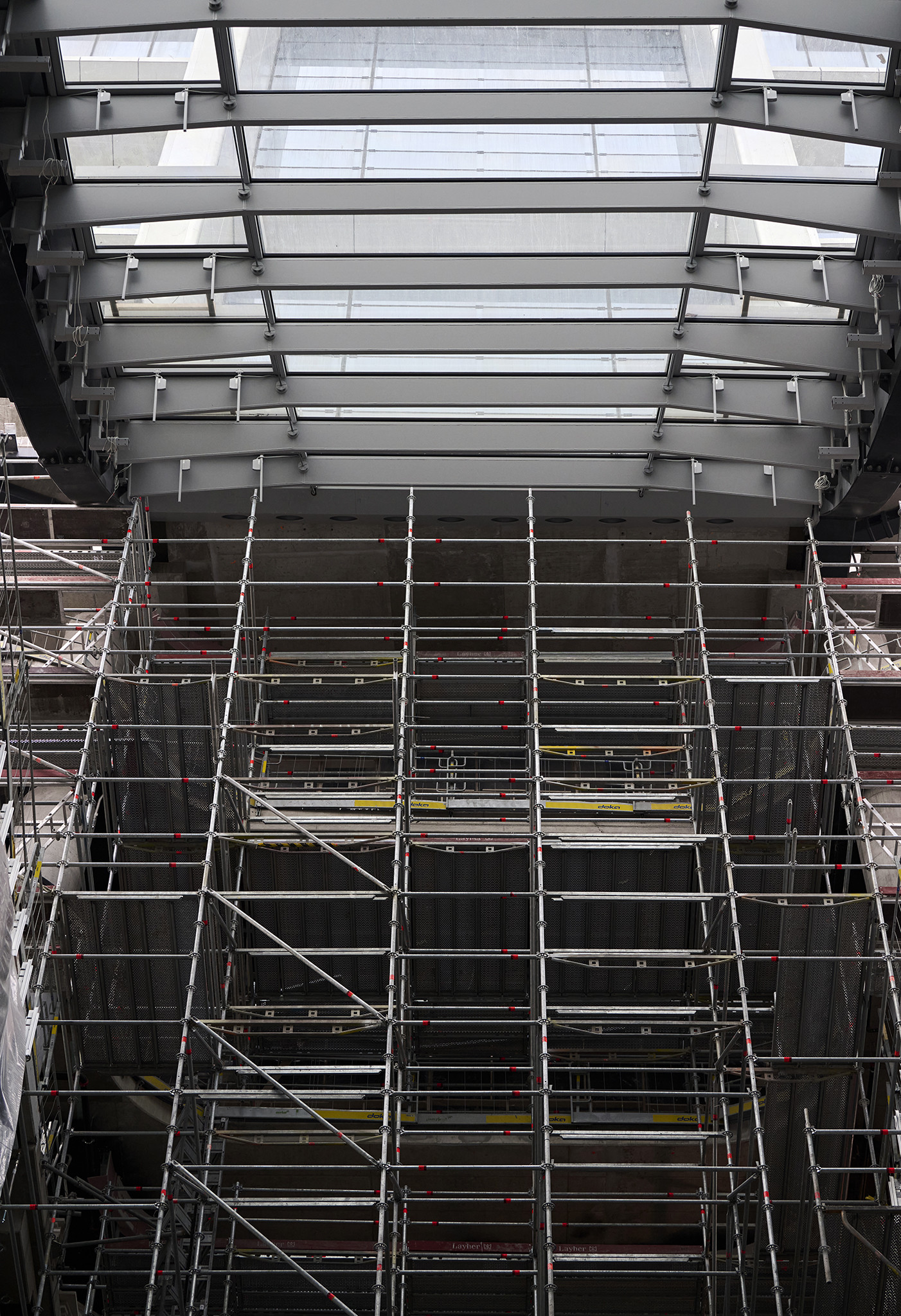 Nemcsak a magasban, a földszinten is megtalálhatók a Layher állványai, az előcsarnokban a födémek kötényfalainak kiépítését és szerelését segítve épült fel a 33 méter magas Allround térállvány.