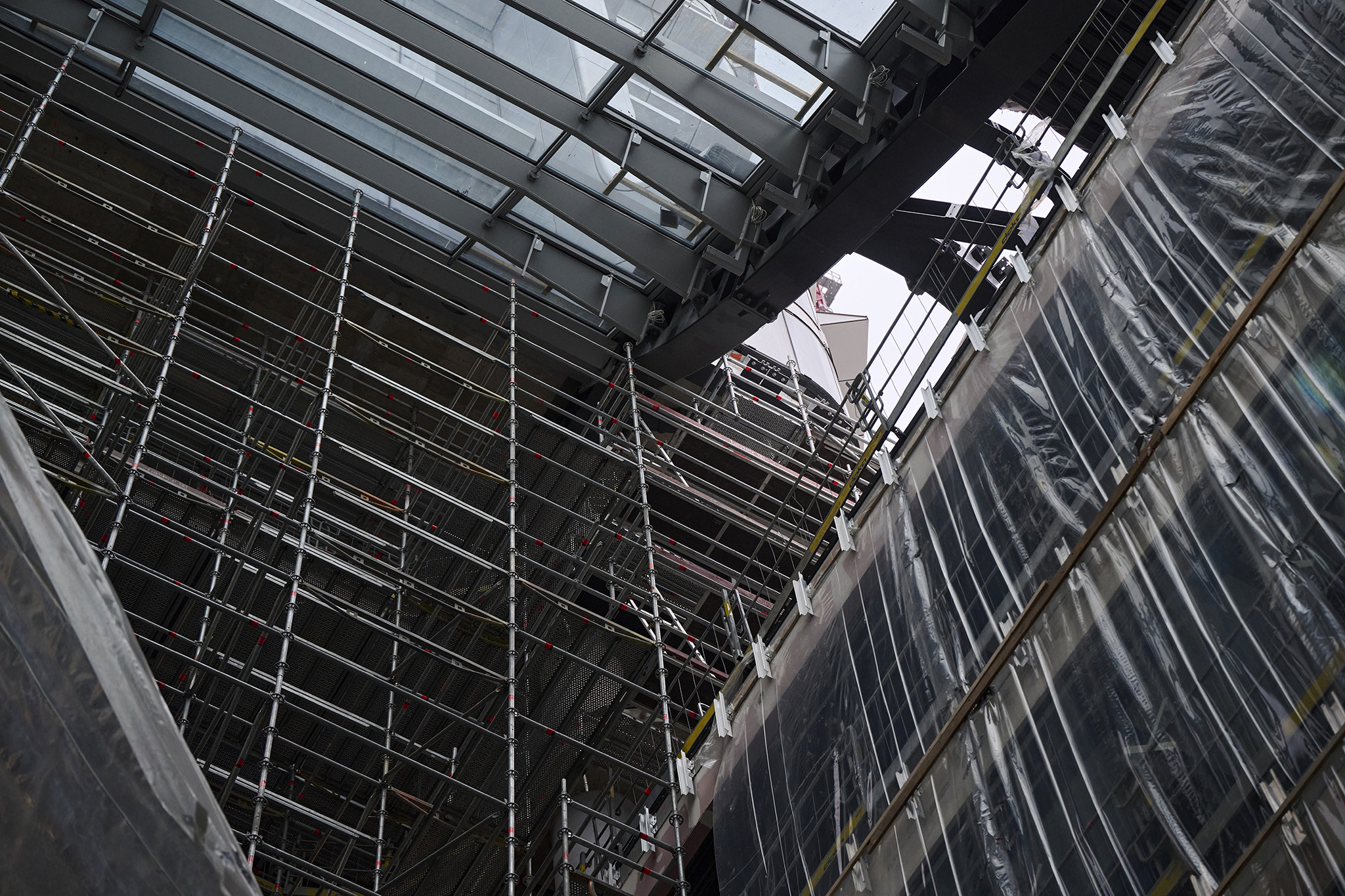 Az állványon belüli közlekedést létrás feljárók segítik. Emellett az állványra vonatkozó súlycsökkentési lehetőségek ekkora magasságban, ilyen szélteher mellett rendkívül fontosnak bizonyultak, ezért számos, ilyen szempontból is előnyös megoldást lehetett alkalmazni ezen állványzat építése során. Ilyen az úgynevezett ’lightweight’, vagyis könnyített súlyú állványelemek használata, amelyek akár 10%-kal könnyebbek a standard elemeknél, valamint kedvezőbb az elemek ergonómiája és logisztikája. Továbbá a kilógó állványrészen Robust (alu/fa) járólapokat alkalmaztak, aminek előnye - kis súlya mellett - a zárt felület, így nagyobb munkabiztonság érhető el a leeső tárgyakkal szemben. Az állványzat alatt helyezkedik el az épület előcsarnokának üveg tetőszerkezete, ennek védelme kiemelkedő fontosságú.