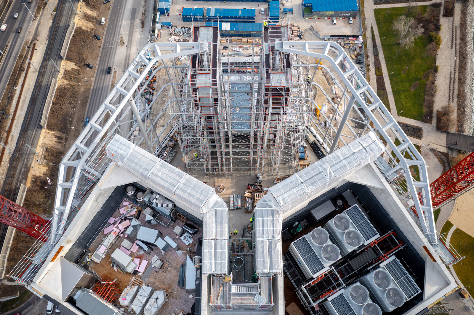 Az állványzaton lépcsős feljáró segíti a kényelmes közlekedést és a hatékony munkavégzést. További igényként felmerült, hogy az állványzaton rakodószinteket alakítsanak ki az építési anyag tárolására. A két merevítő mag közötti szakaszon a két szomszédos Allround állványzat rácsos tartókkal való összeköttetésével és járólapozásával rakodó pódiumokat sikerült kialakítani. Ezek a pódiumok kellő teherbírást nyújtanak a toronydaruval mozgatott építőanyagok és állványanyagok fogadására. A zárt padozatnak és a 3 soros oldalvédelemnek köszönhetően a rajta tartózkodó személyek biztonságos munkavégzése is garantált. A szerelés előrehaladtával a pódiumok szükség szerint gyorsan átépíthetők magasabban lévő munkaszintekre.