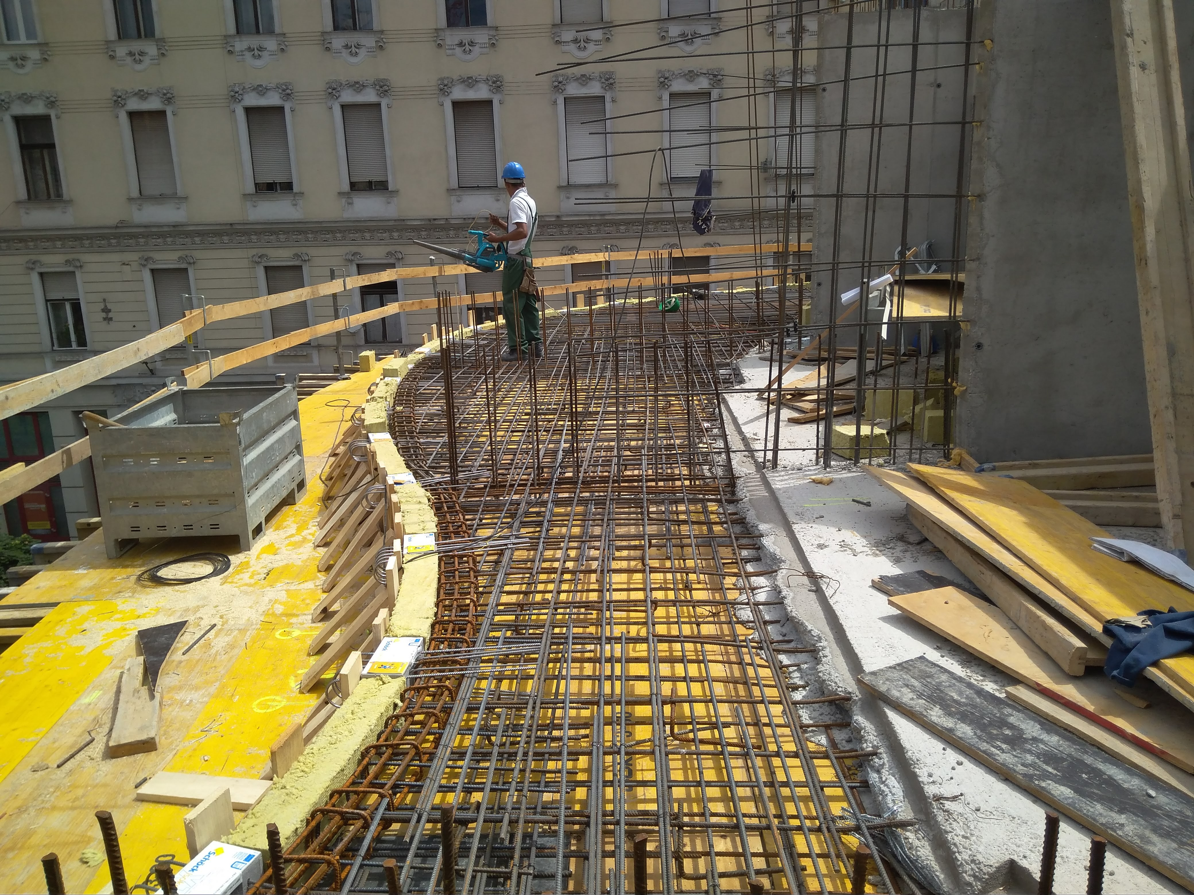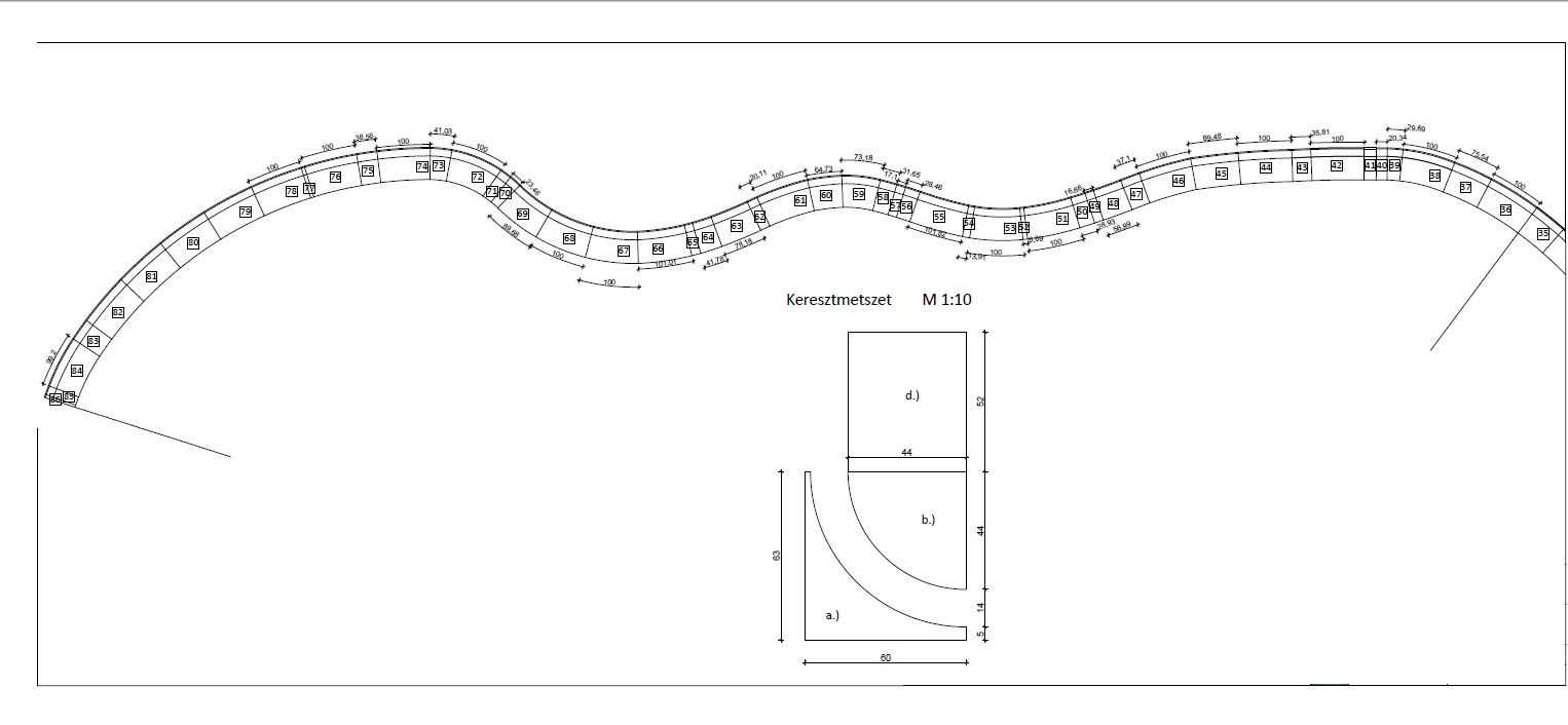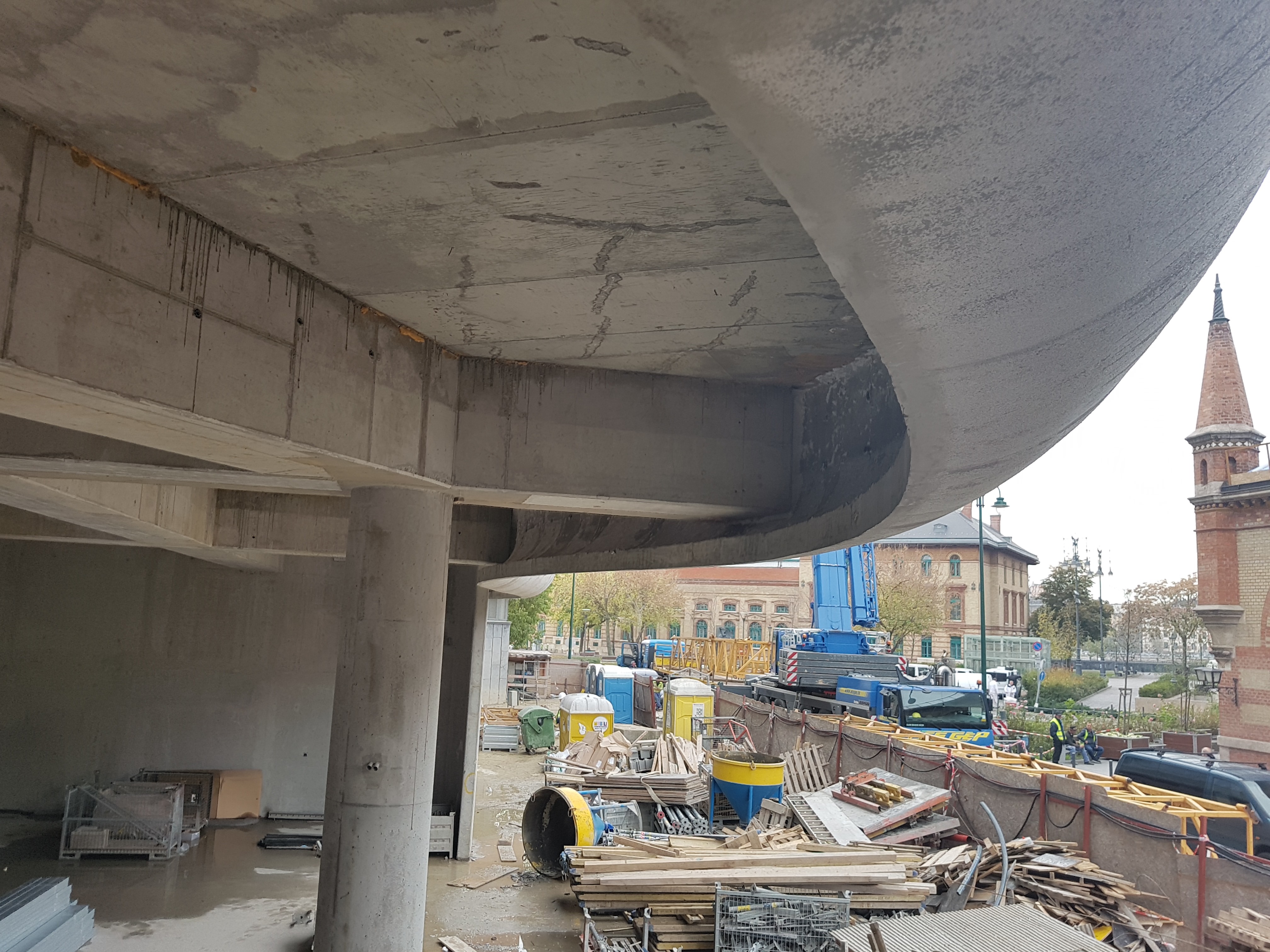 „Teoretikusan két sor hálóval kellett volna ezt elvégezni. De ez a betontakarások és a kétszer görbült forma miatt reménytelennek bizonyult. A kétsoros vasalásra elsősorban a repedéstágasság miatt lett volna szükség. Mivel statikailag az egysoros vasalás is megtartotta a szerkezetet, ezért ezt választottuk, kiegészítve az AVERS-től vásárolt Concrix ES bikomponensű makrószállal, 3 kg/m3 adagolásban. Ezzel kicsit vékonyabb, így könnyebb szerkezetet értünk el” – ismertették a szakemberek.