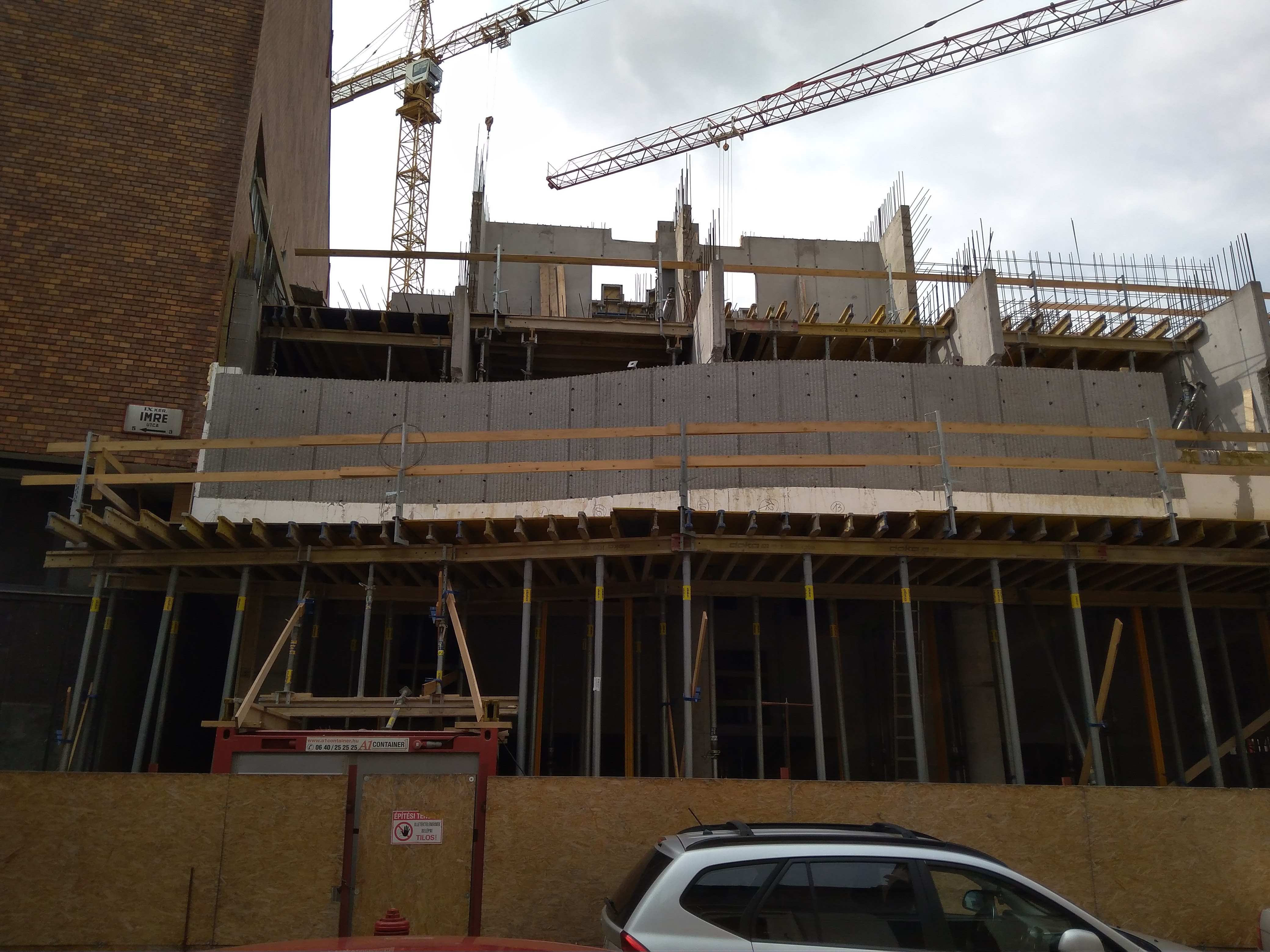 A parapetek külön ütemben készültek a födémektől. A szerkezet kivitelezésekor először gerenda fenékzsaluzat készült, hogy a későbbiekben a födémzsaluzat és mellvédzsaluzat bontása egymástól függetlenül végezhető legyen. A gerenda lelógó, födém alatti része befordult a födém alá.