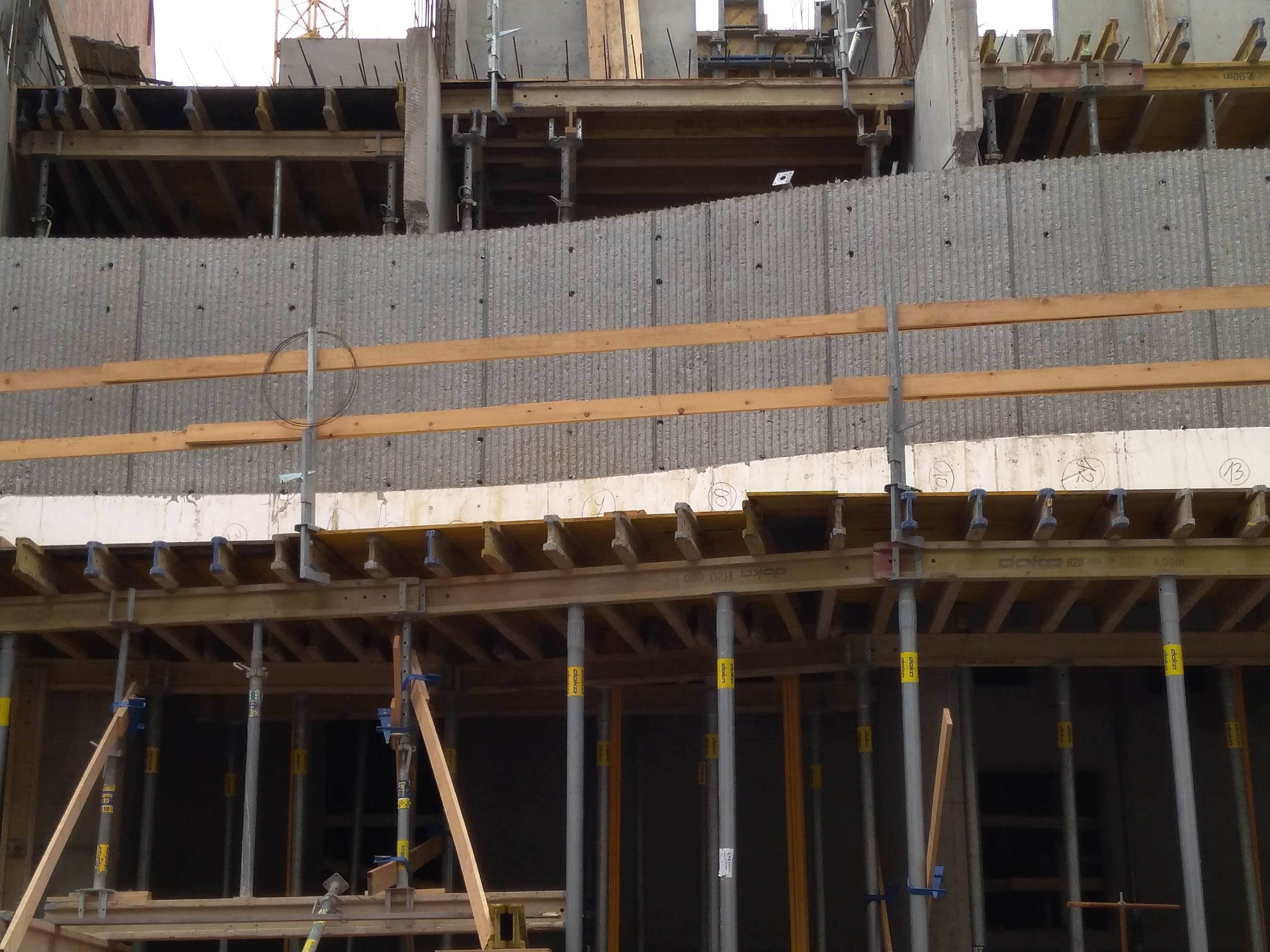 A mellvéd további zsaluzata a PERI cégtől bérelt Rundflex íves zsaluzattal készült, amelyet egyedi méret alapján, kimondottan az épület geometriájához készített el a cég. A tervező a felületeket látszóbetonból tervezte, ám ezek nem sima felületűek, hanem az általa kiválasztott lenyomati képpel rendelkeznek.