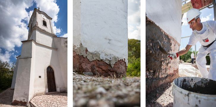 Csereklye József a Baumit területi képviselője mintát vesz a lábatlani Református Templom homlokzatáról.