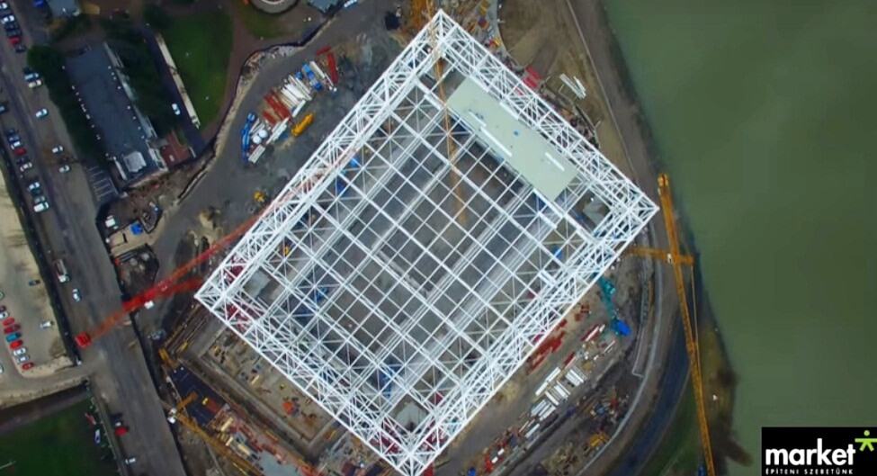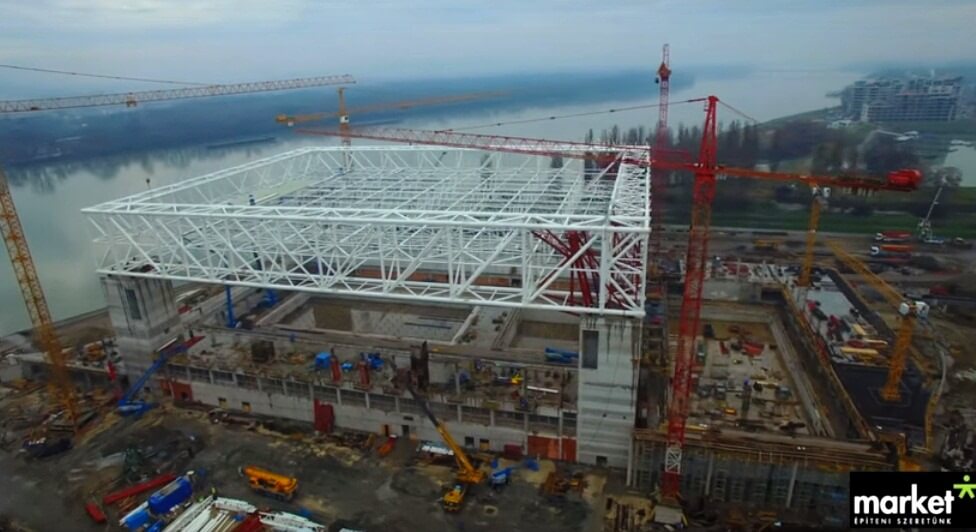 A Market Építő a honlapján tett közzé drónnal készített légifelvételt az általa épített Dagály Úszóarénáról. A videón több szögből is szemügyre vehető a februárban hat órán át tartó emeléssel helyére tett, 2400 tonnás acél tetőszerkezet, amit egy hazánkban eddig nem alkalmazott technológiával helyeztek fel. A magyar kivitelező másokhoz képest feleannyi idő alatt építi a vizes vb helyszínét, de februárig erre a feszes ütemtervre is rávert hat hetet.