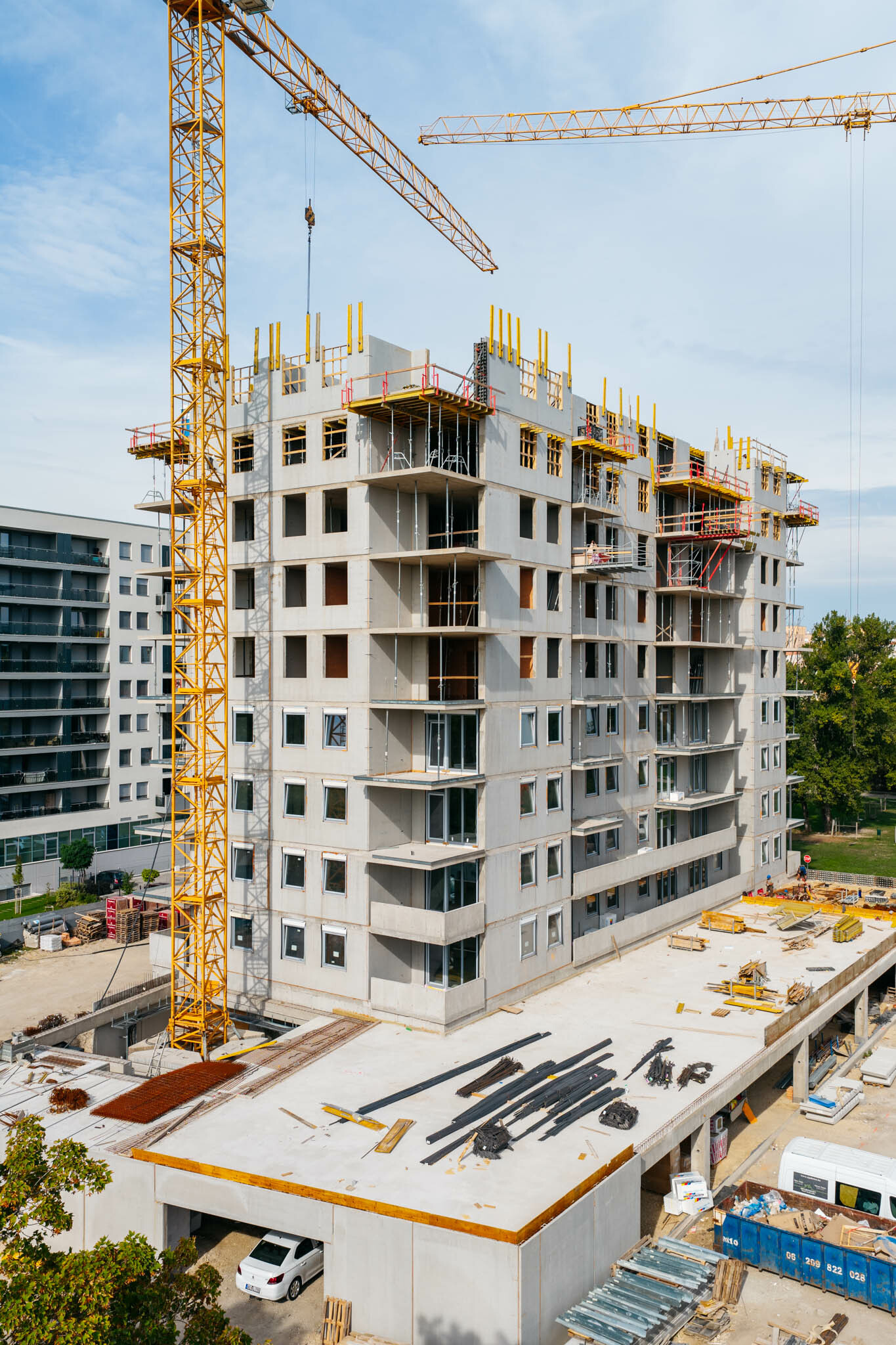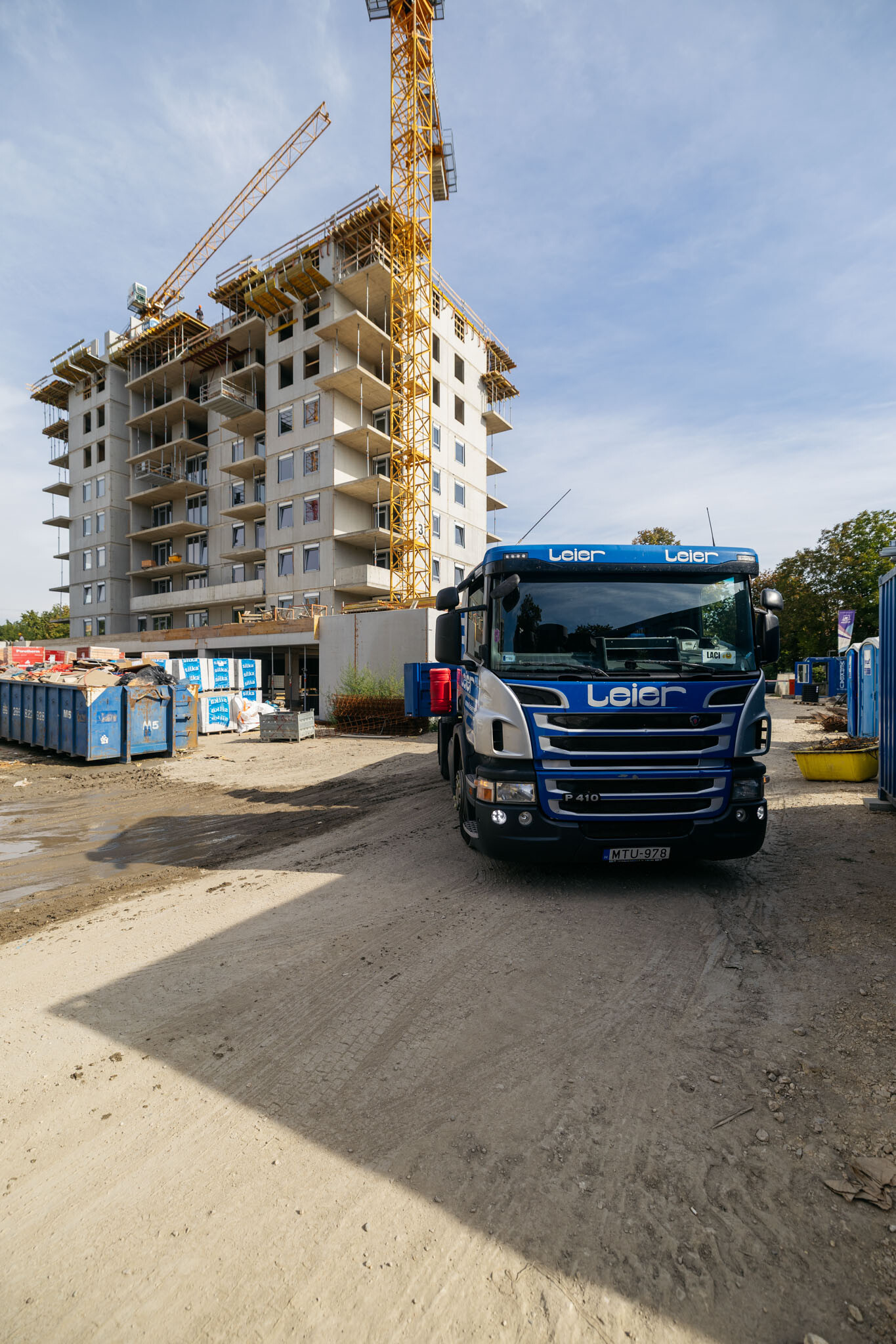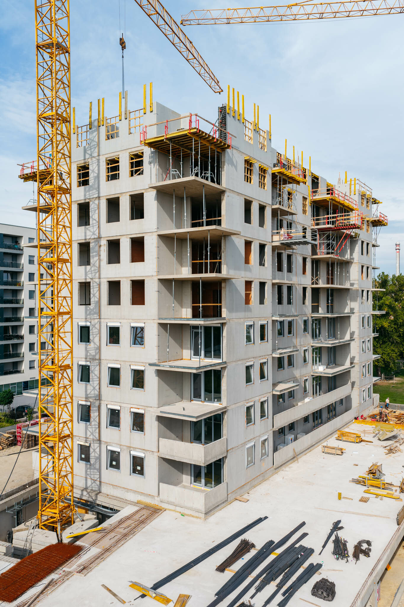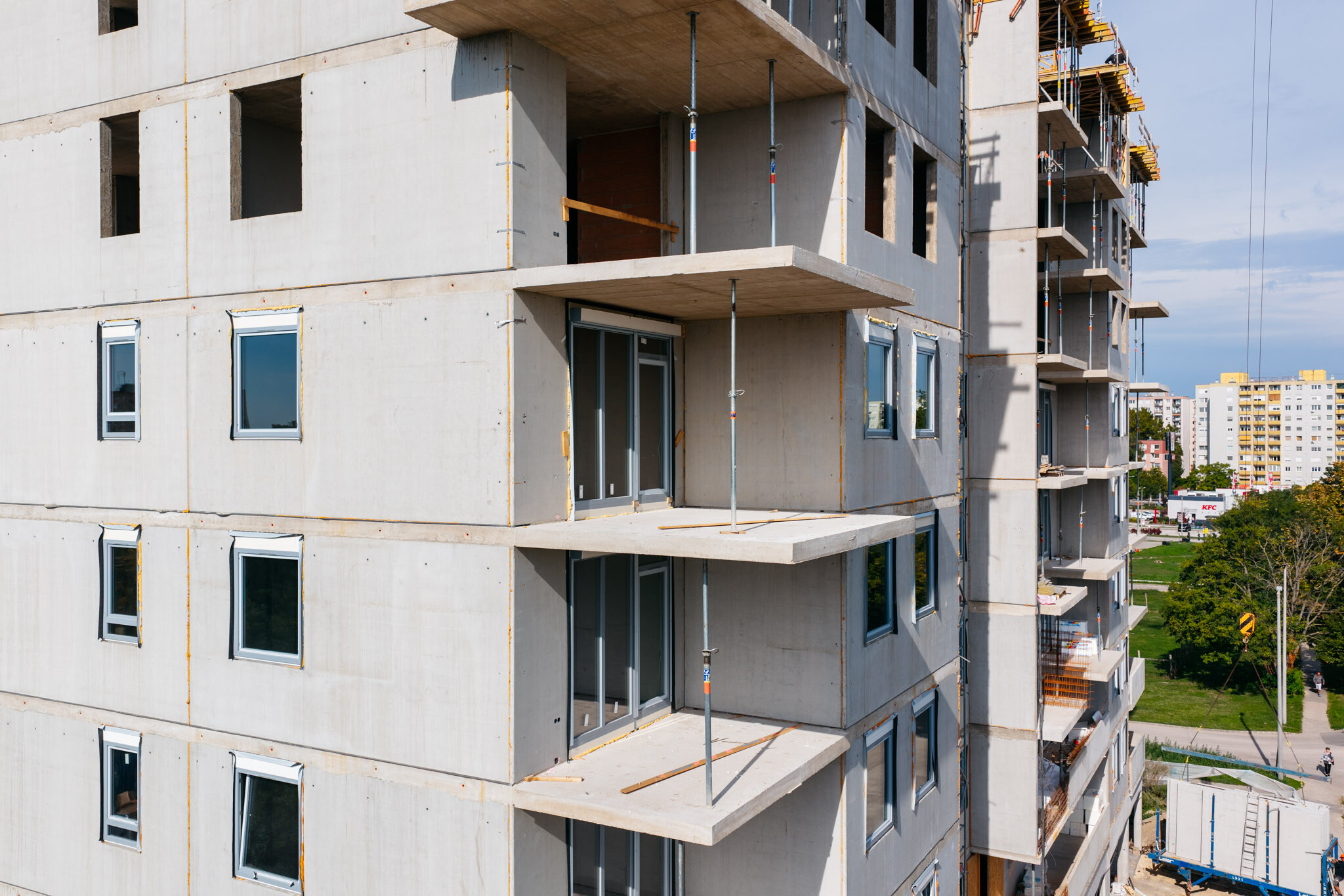 Egyrészt szó szerint értve, másrészt pedig a cég megoldásai teszik lehetővé a megvalósítás sebességét és minőségét is: az A és B épületek 2x10 szintnyi szerkezetépítése kifejezetten gyors, eddig összesen alig több mint 30 hetet vett igénybe: az első szállítások idén február második felében indultak. A földszint a parkolóé, a többi 9 szinten vannak a lakások, összesen 162 darab.