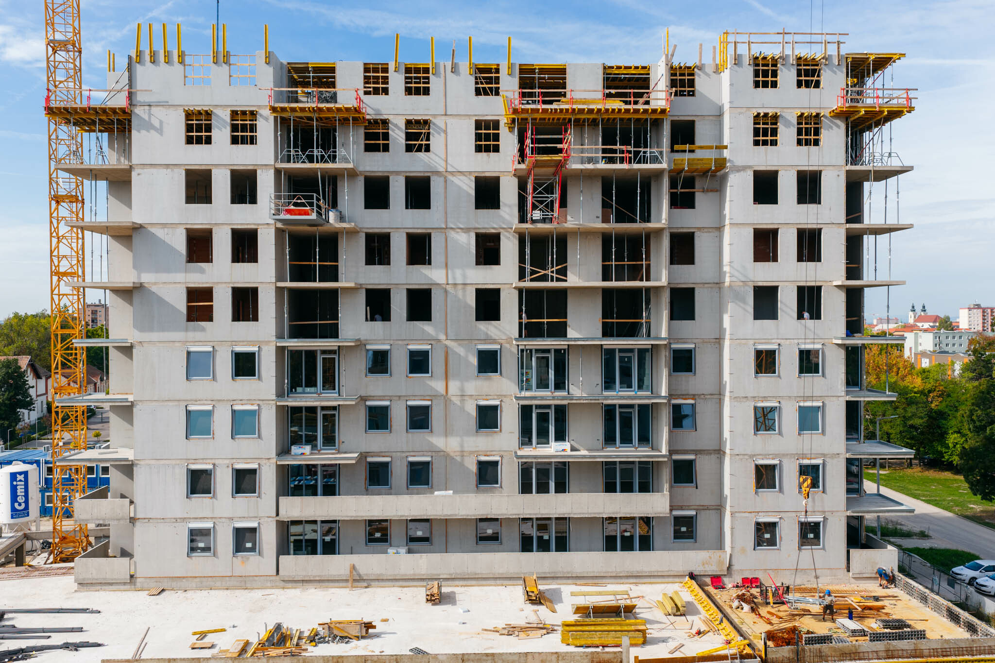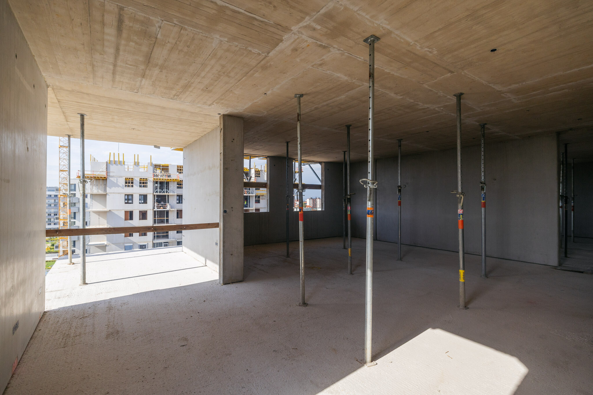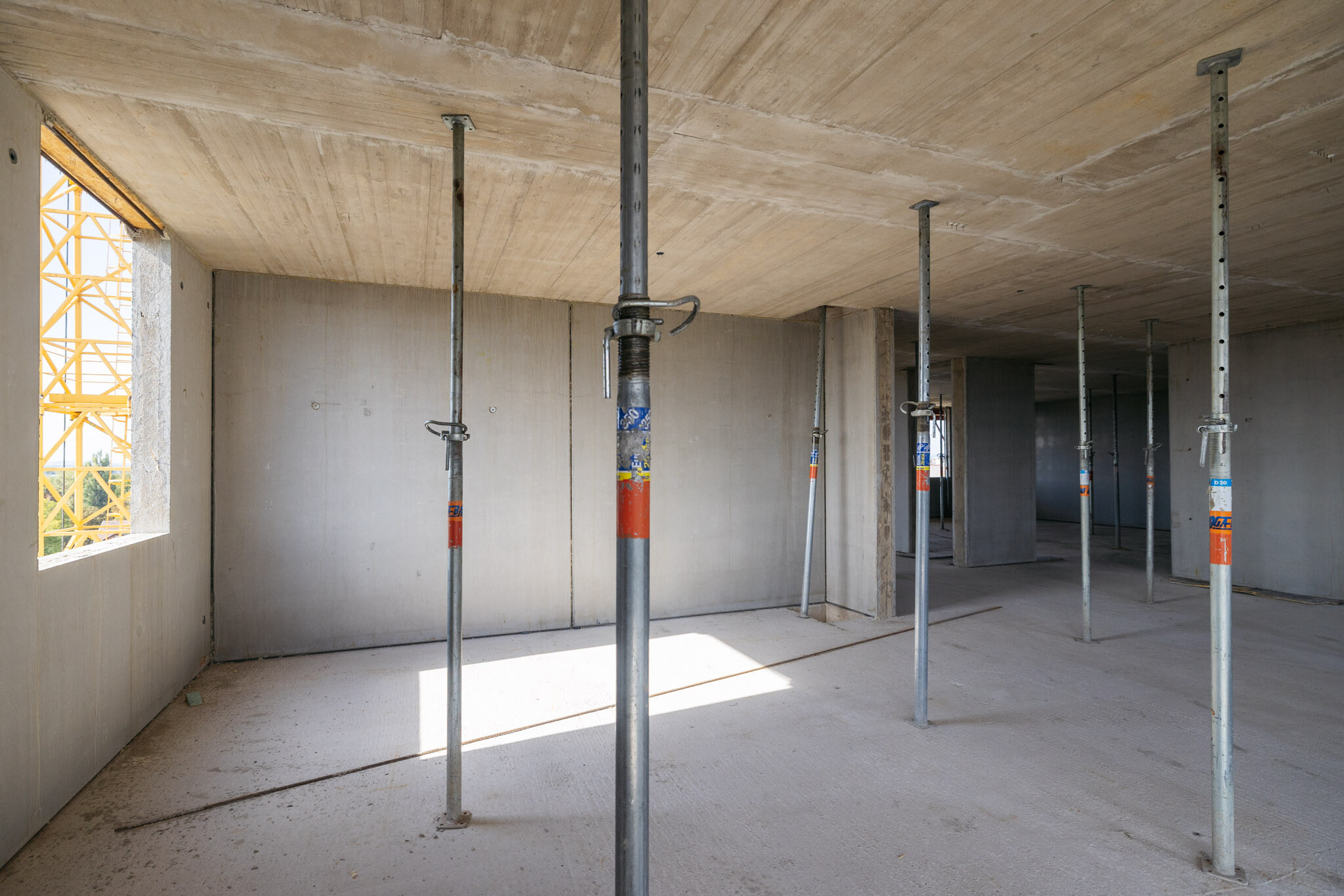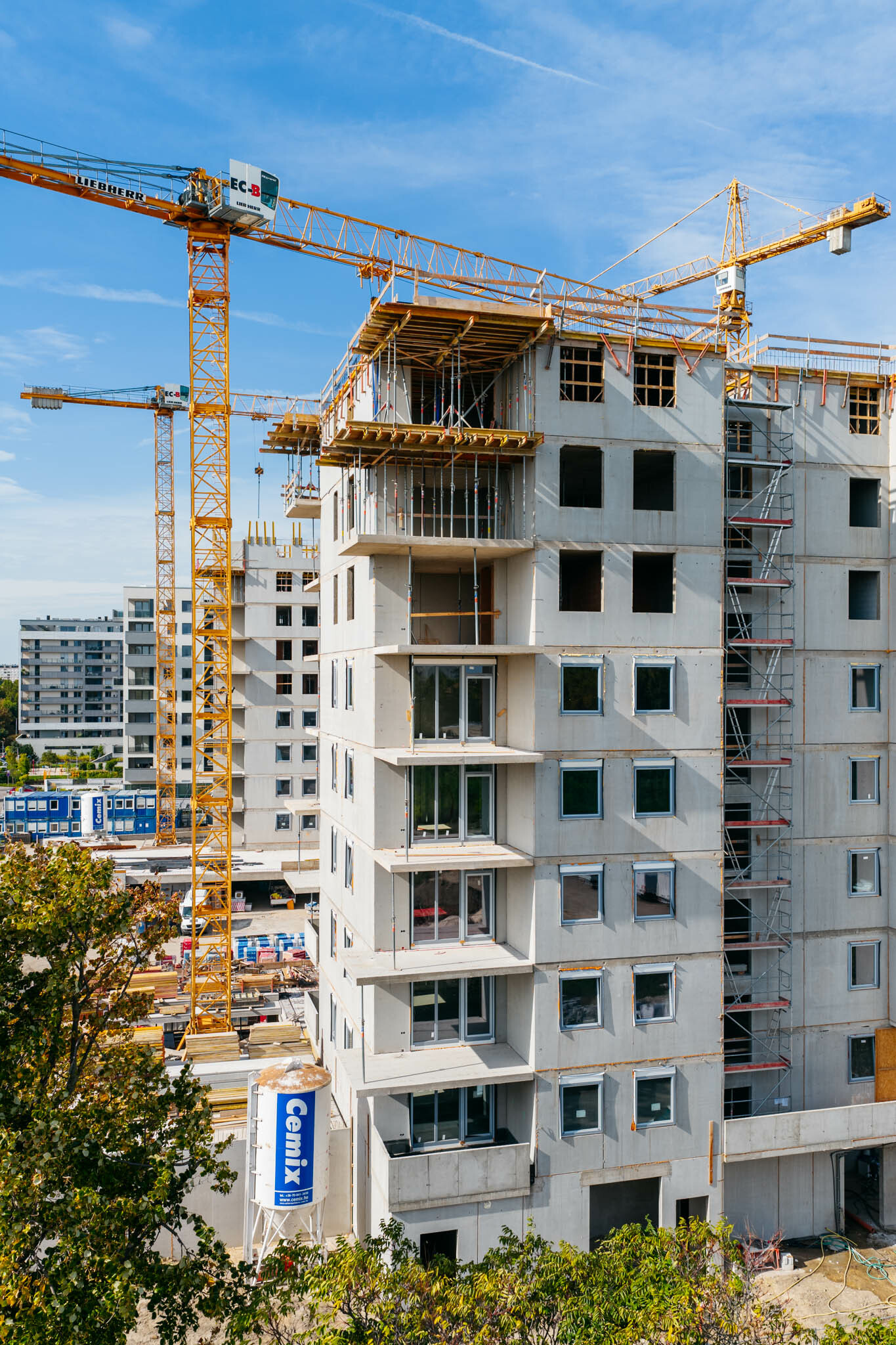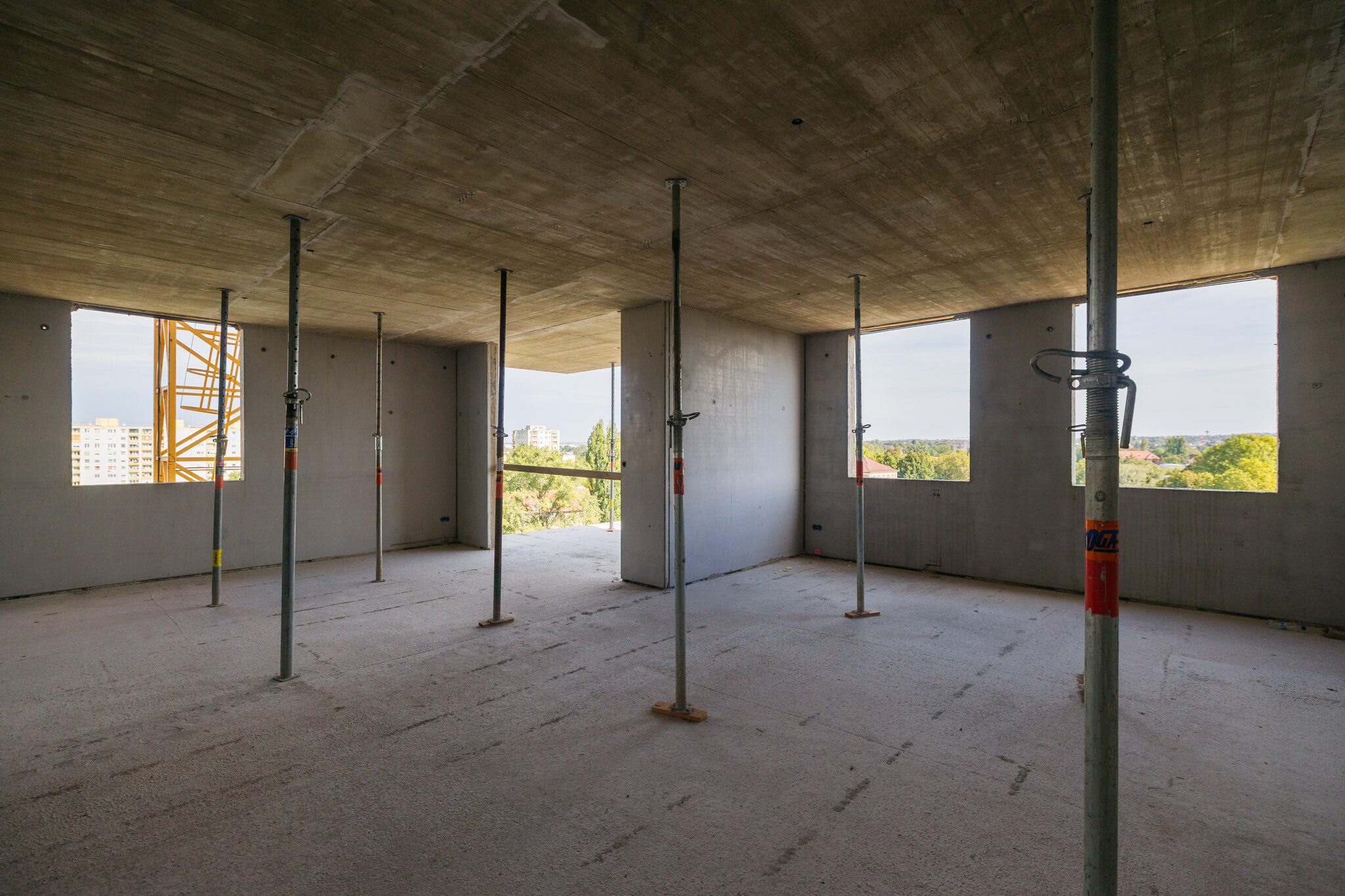 Egyrészt szó szerint értve, másrészt pedig a cég megoldásai teszik lehetővé a megvalósítás sebességét és minőségét is: az A és B épületek 2x10 szintnyi szerkezetépítése kifejezetten gyors, eddig összesen alig több mint 30 hetet vett igénybe: az első szállítások idén február második felében indultak. A földszint a parkolóé, a többi 9 szinten vannak a lakások, összesen 162 darab.