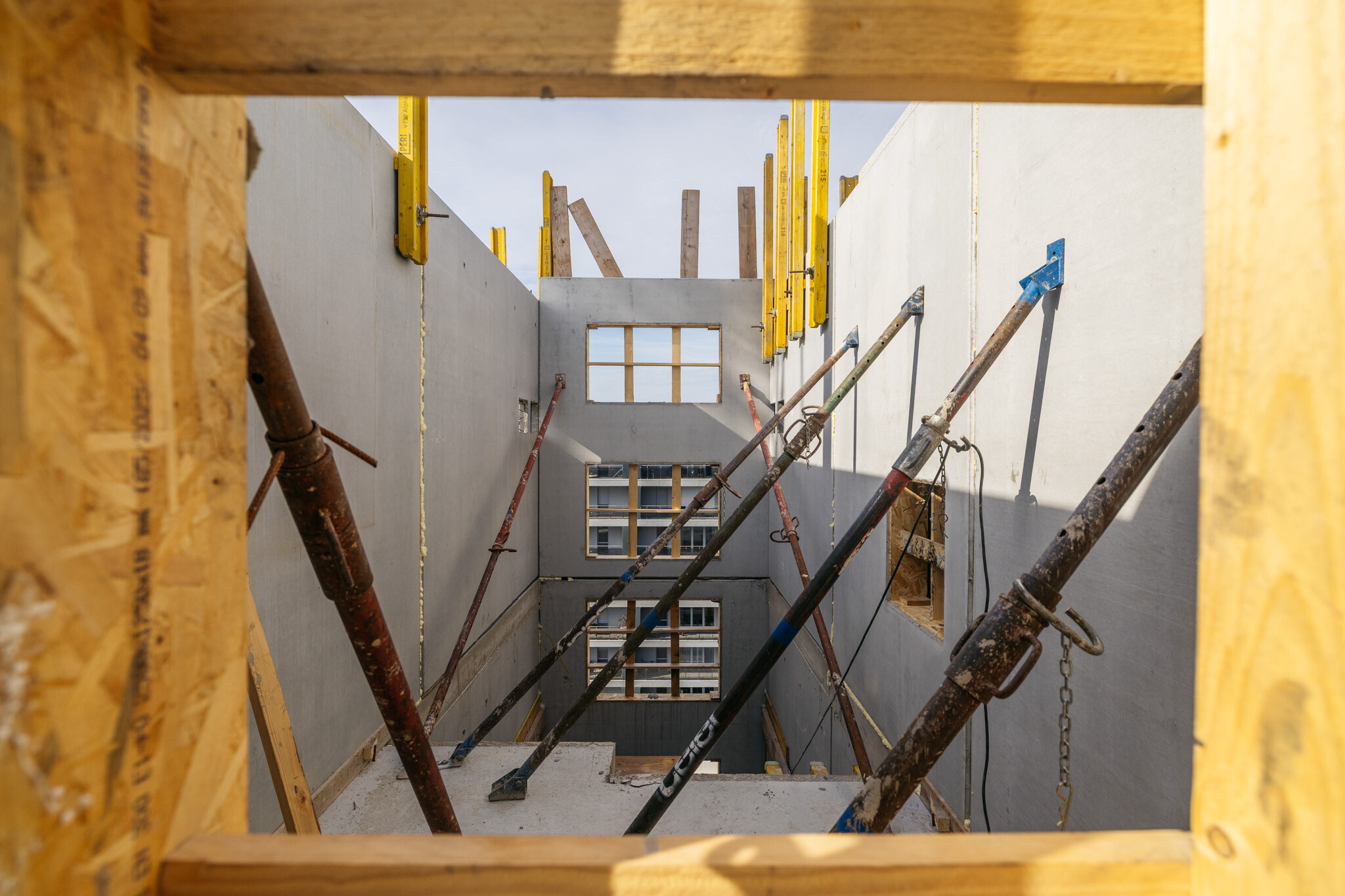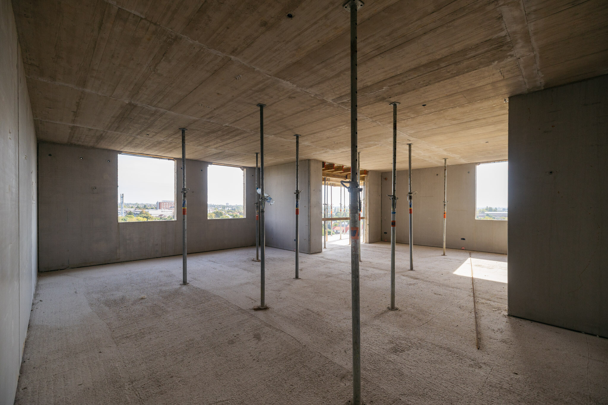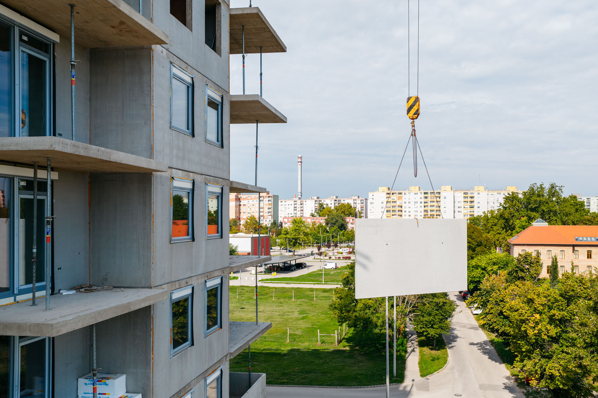 Hozzátette, hogy a lakáselválasztó falak mindössze 20 centiméter vastagok, mégis kiváló, 56 dB-es hangszigetelő képességgel rendelkeznek, ami az egyik legnagyobb előnyük. Kiemelte azt is, hogy a külső falakban a nyílászárók helyeit már gyárilag méretpontosan kialakították, így azok gyártása és szerelése már az épület szerkezetépítésével egy időben elindulhatott. Mint mondta, a nyílászárók beépítése a fotózáskor az ötödik szintnél tartott.