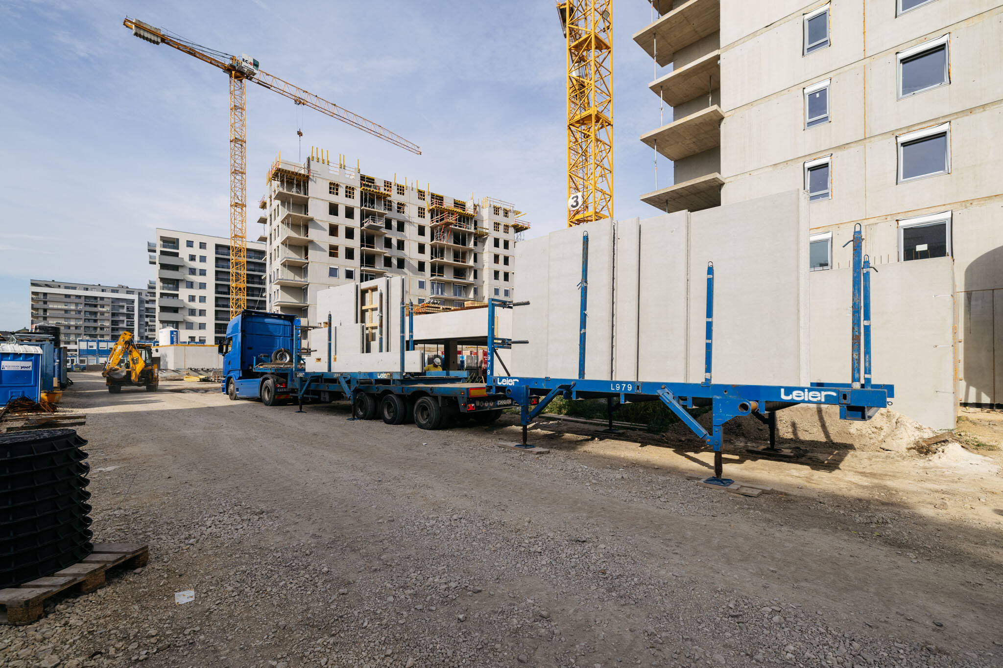 Szintén a logisztikai tervezés része volt az időablakok szigorú ütemezése: a projekt méretre gyártott kéregfalait a Leier győri üzeméből közvetlenül szállították az építkezésre. A gyártónak is fontos szempont volt, hogy a helyszíni raktározási kapacitás korlátai miatt az elemeket a lehetőségek szerint egyből beépítsék.