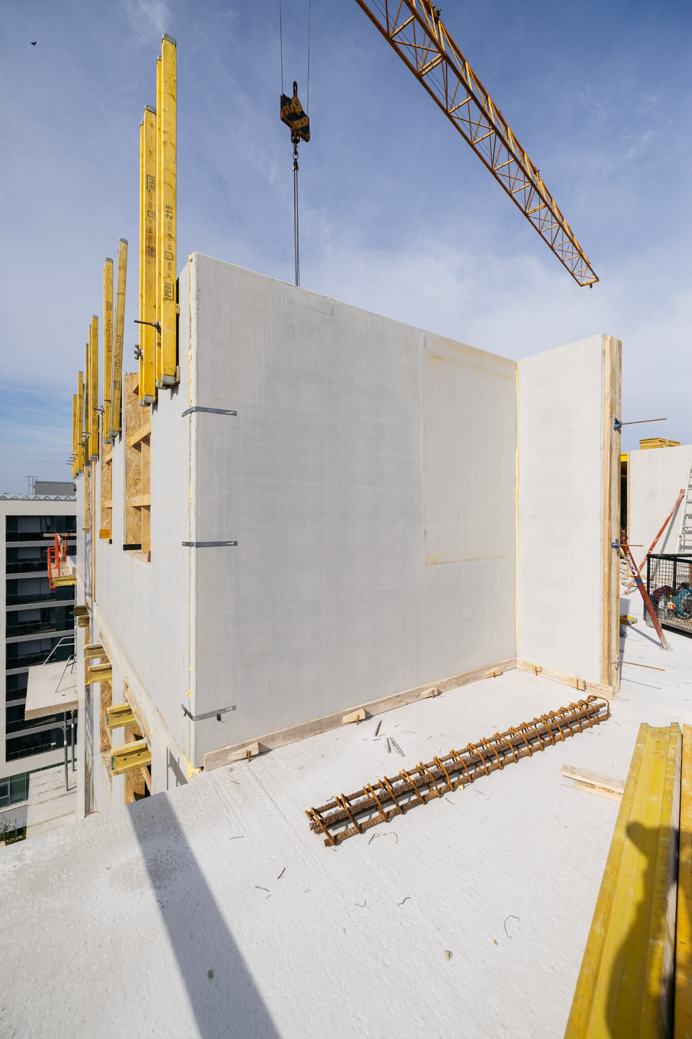 A Leier részéről az előnyöket sorolva Takács Gábor kifejtette: a méretre gyártott elemekkel többféle, szerkezetileg eltérő megoldást is meg tudnak valósítani. Példaként említette, hogy az épület fő merevítő szerepét betöltő lépcsőházi és liftmag, valamint a középső tengelyben elhelyezkedő pillérszerű falszakaszok is kéregfalból készültek.