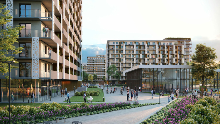 Játszóterek, szabadtéri sportpark, futópálya, napozóterületek és közhasználatú kutyafuttatók teszik teljessé a képet. A parkolók épületen belül kapnak helyet, így a felszíni zöldterületek nem sérülnek.
