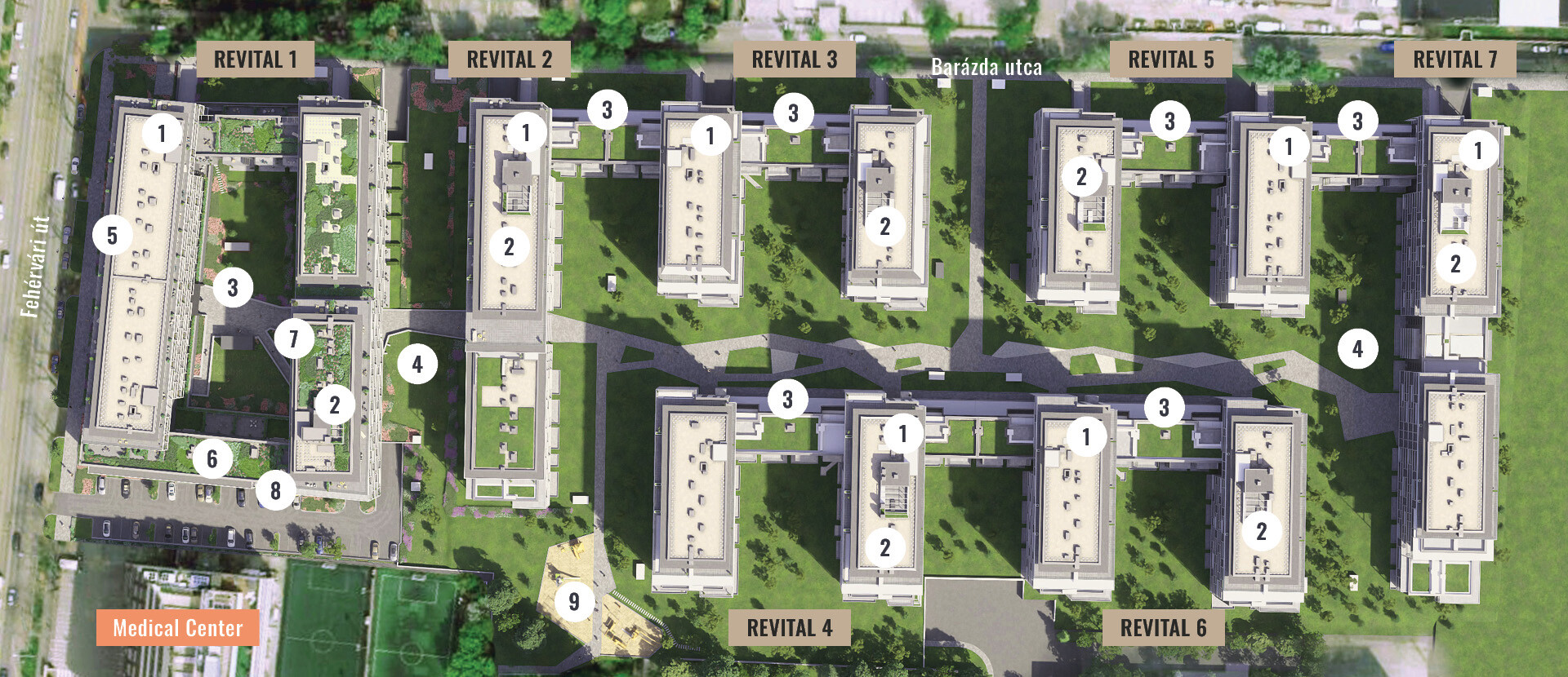 A Rezideo Revital Park lakónegyedét a „15 perces város” urbanisztikai szemlélet szerint tervezték: a közelben minden lényeges szolgáltatás könnyen elérhető tömegközlekedéssel, kerékpárral és gyalog: közszolgáltatások, óvodák, iskolák, egyetemek, orvosi rendelők, bevásárlási és szórakozási lehetőségek, minőségi kulturális helyszínek.