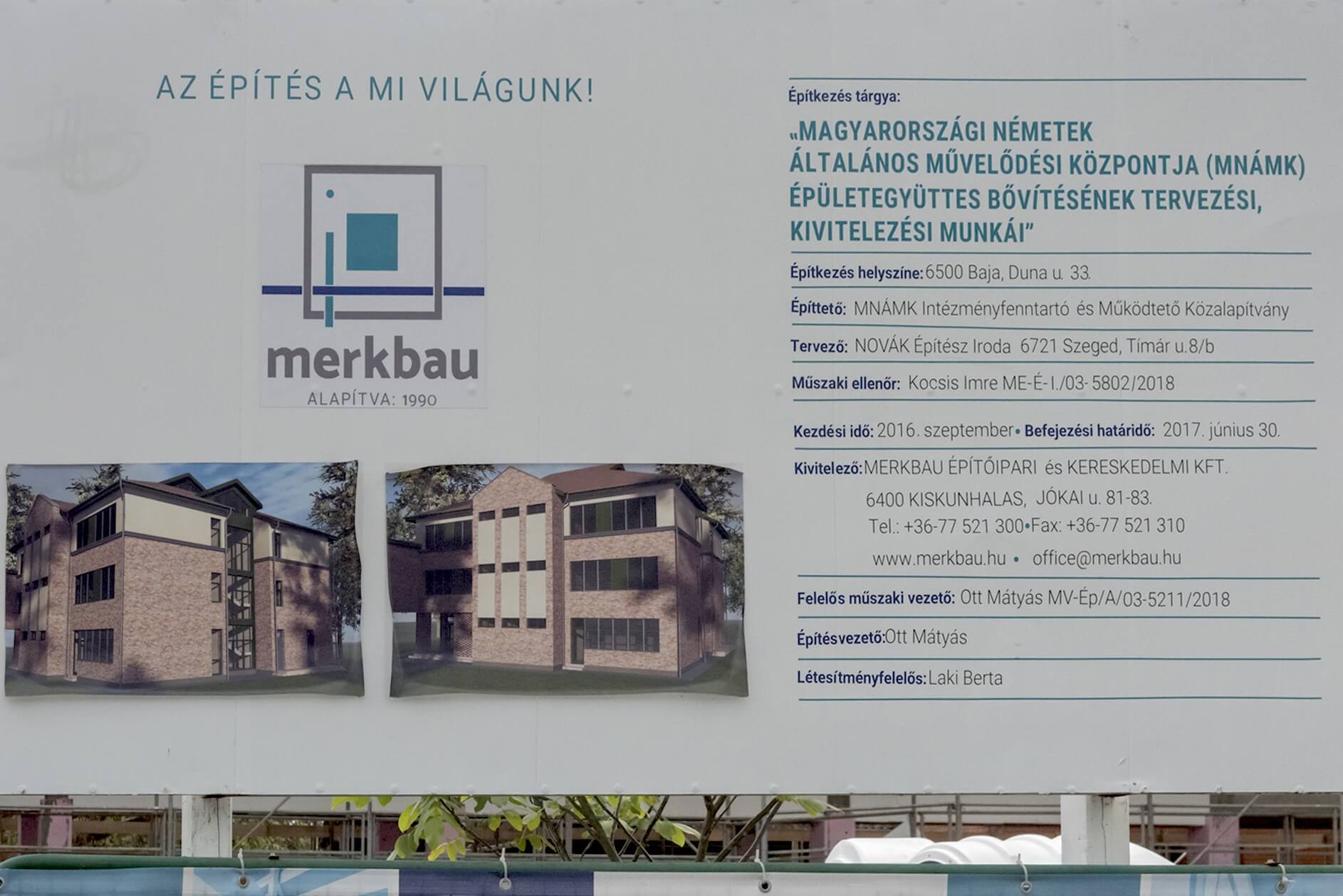 Megtartották a Magyarországi Németek Általános Művelődési Központjában (MNÁMK) épülő új iskola bokrétaavató ünnepségét Baján. A Merkbau Kft. által kivitelezett új épület a jelenlegi általános iskolai szárnyhoz kapcsolódik, abból emelt szintű zárt folyosón lesz megközelíthető. A kiskunhalasi magasépítő cég a beruházásban három szinten 8 tantermet, 2 csoportszobát, tanári szobát és konyhát épít meg, valamint az ezeket kiszolgáló helyiségeket és közösségi tereket.