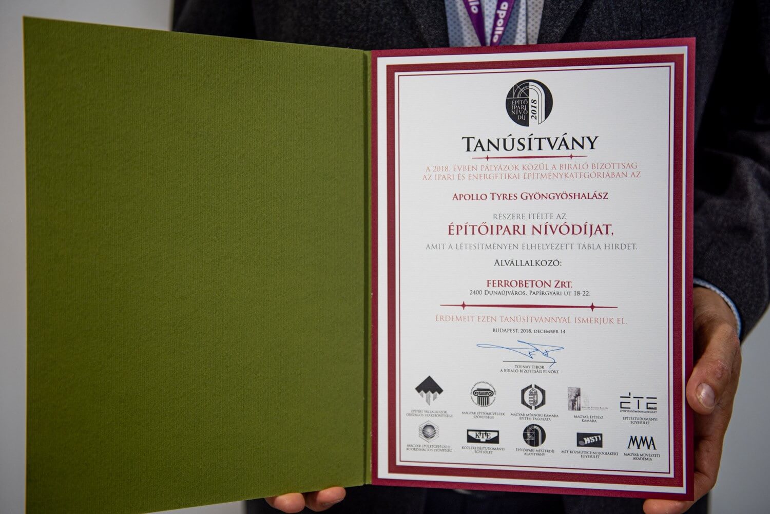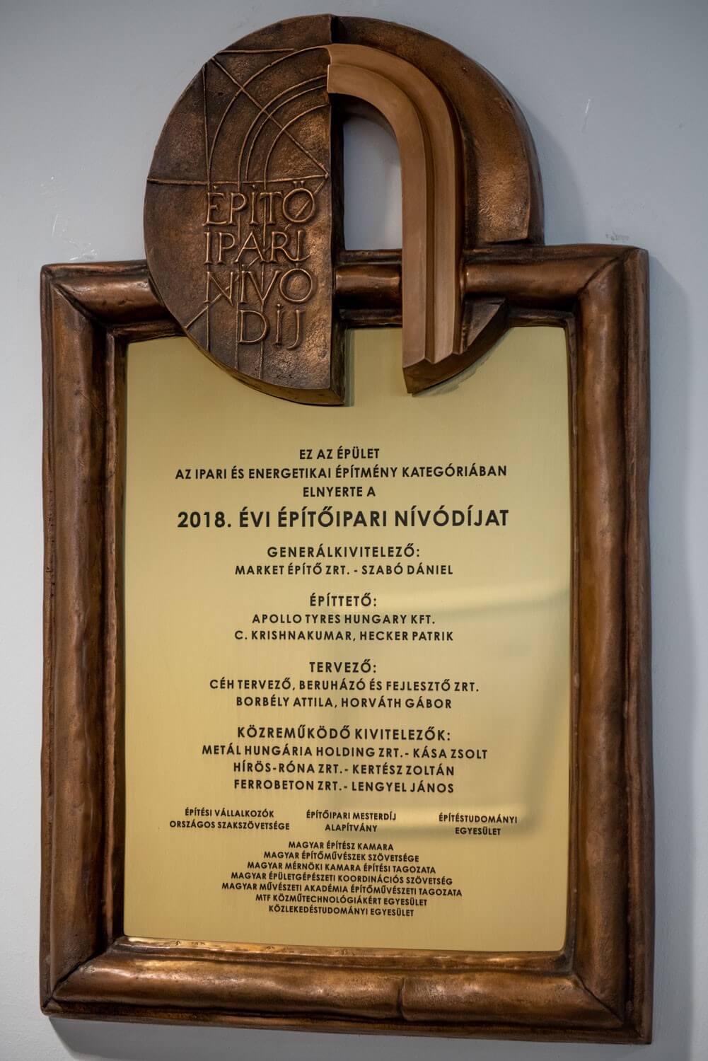 Ahogy azt korábban már megírtuk, az Építési Vállalkozók Országos Szakszövetsége (ÉVOSZ) budapesti évzáró ünnepségén kihirdették az Építőipari Nívódíj és a Lechner Ödön Díj 2018-as nyerteseit. A díjazottak között szerepelt az Apollo Tyres 2017-ben átadott zöldmezős gyára is, ami közel 155 milliárd forintból valósult meg, a Market Építő Zrt. kivitelezésében.