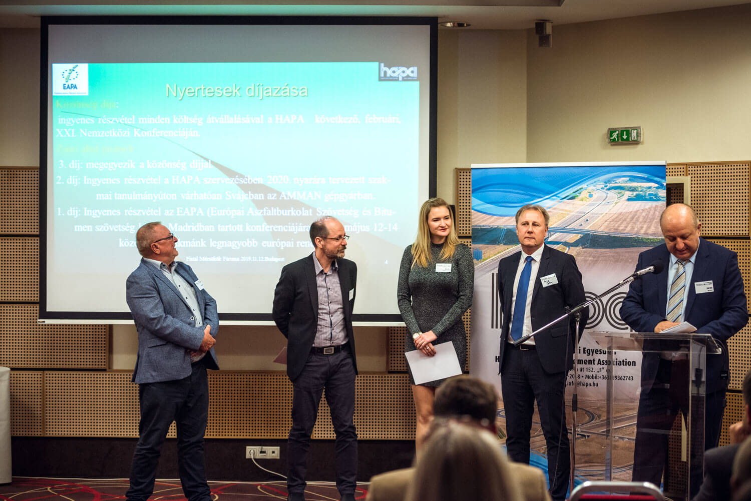 A különdíjat pedig Torák Márta, a Magyar Közút Nzrt. munkatársa kapta meg. A győztesek értékes jutalmakat is kaptak. Az első helyezett az EAPA (European Asphalt and Pavement Association) 2020-as madridi konferenciájára nyert utat, a második a svájci Amman gyárába látogathat el a HAPA költségén, a harmadik díjazott és a különdíj nyertese pedig szintén a HAPA következő siófoki konferenciájára látogathat el díjmentesen. Emellett természetesen mind a négy előadó megtartja előadást ezen az eseményen is.