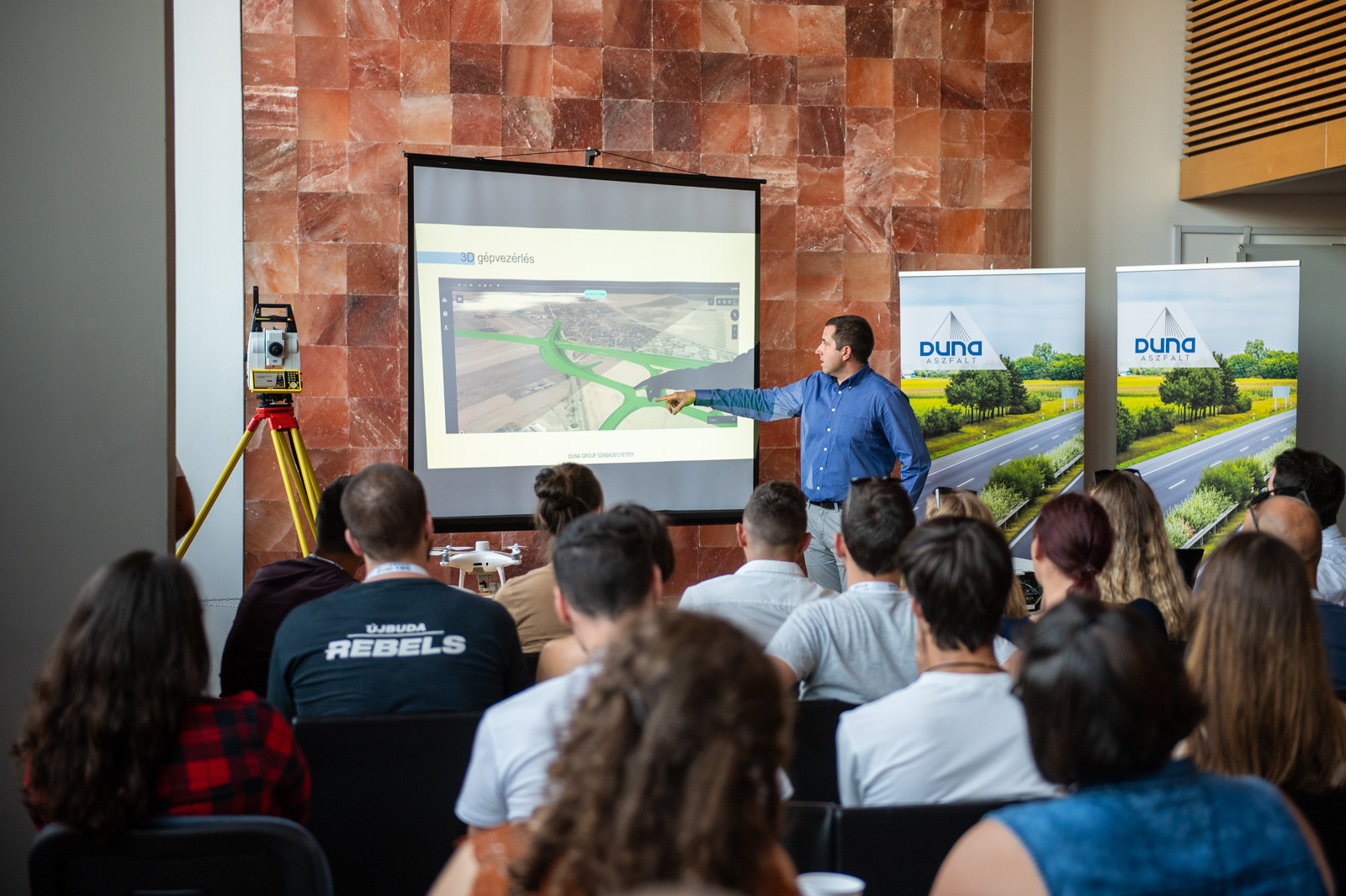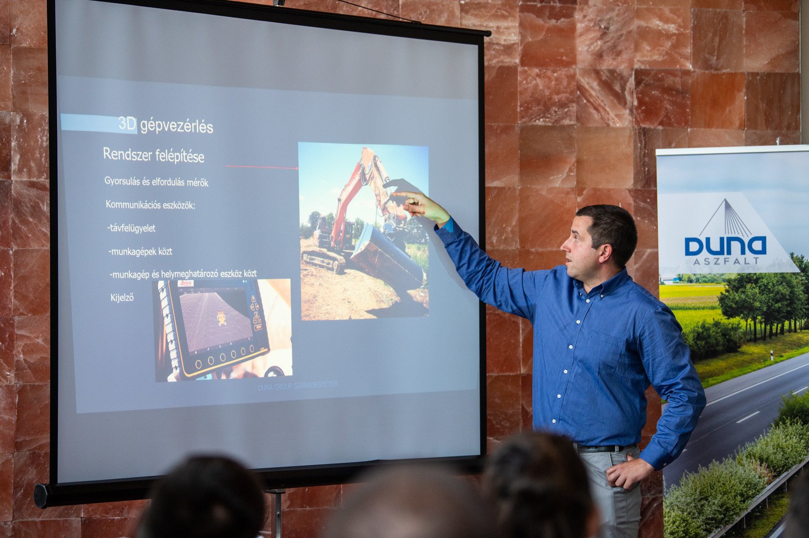 A 3D-felmérések során használt innovatív eszközökről – melyeket nem mellesleg részben a fent említett pályázati forrásból szerzett be a Duna Aszfalt Kft. – Vass Imre geodéta tartott előadást, míg Fatér Gábor, a, szintvezérelt automata gépek vezetője a 3D vezérelte útépítés előnyeit mutatta be a hallgatóságnak. Mindkét szakember hangsúlyozta, hogy az új eszközök, gépek beszerzése során kialakult kapcsolat a gyártókkal, szállítókkal lehetővé tette azt is, hogy a jövőben még szorosabb legyen az együttműködés, egyre gyakrabban kérik ki véleményüket, javaslataikat az új megoldások fejlesztésekor.