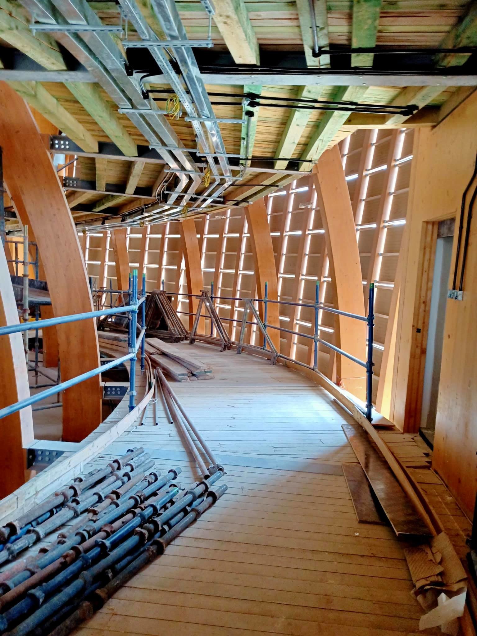 Továbbá megkezdődött már a keményfa-távtartók elhelyezése is, melyek megadják a hullámzó hatást a 14-15 méter hosszú LVL burkolatnak.