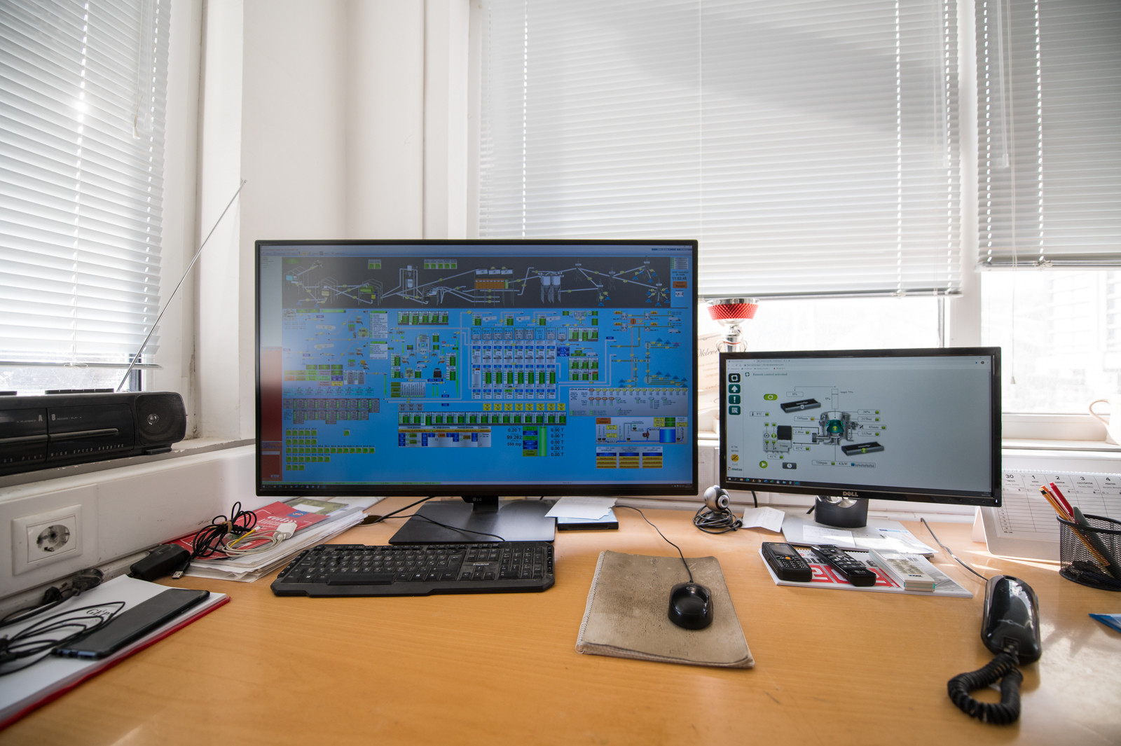 A vezérlő helyiségben a szakvezető diszpécser a teljes gyártási folyamatot figyelemmel kíséri monitoron.
