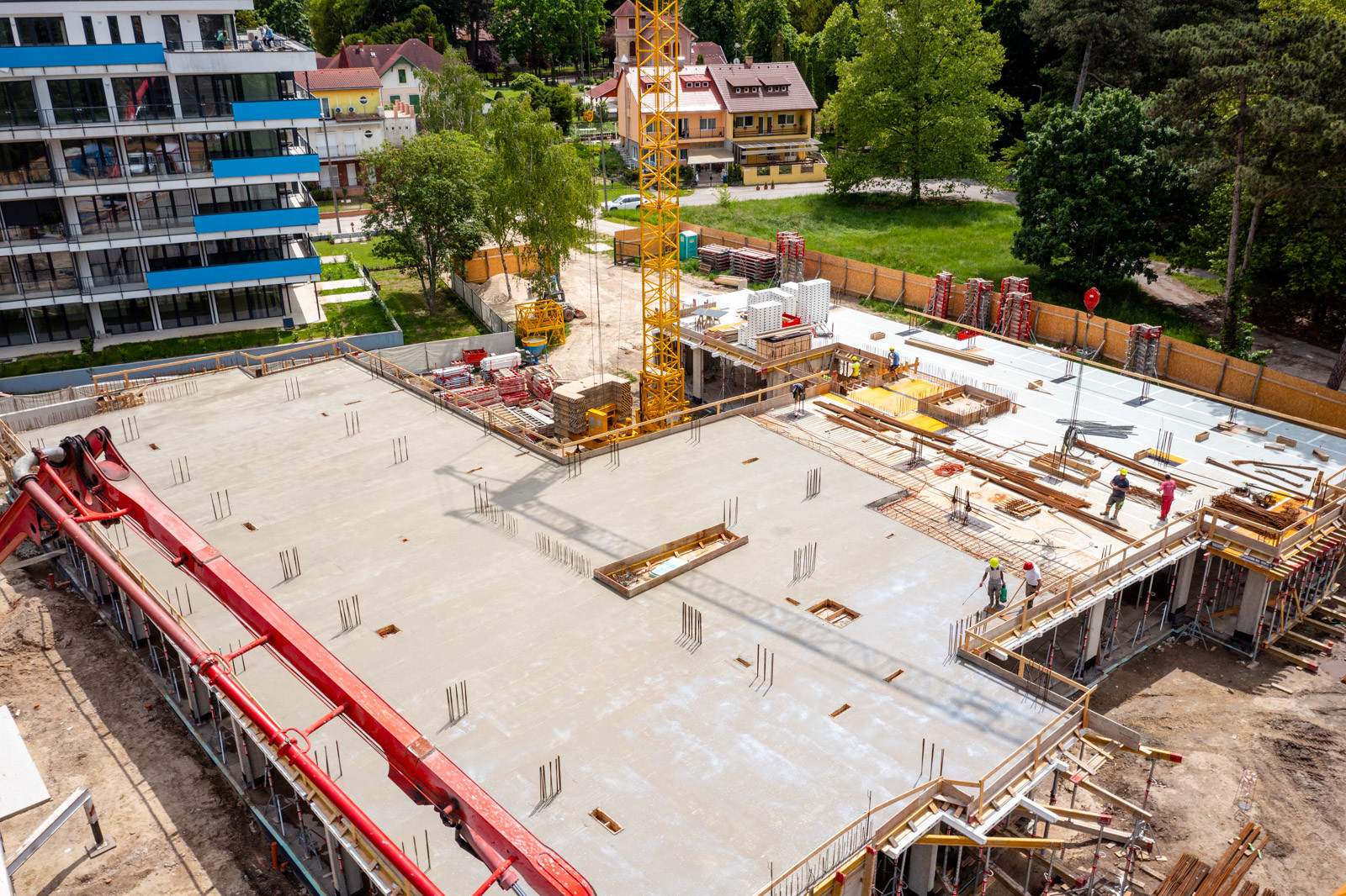 „A vállalkozásunknak is és a kivitelezőiparnak is egy újabb fejlődési állomása volt, hogy a jelentősen megdráguló fa alapanyagot már nem tartalmazó, és a legkevesebb élőmunkával építhető MevaDec ejtőfejes födémrendszert vásároltuk meg és alkalmazzuk. Ezzel a rendszerrel 35 százalékkal kisebb létszám mellett is 10 százalékkal gyorsabb a kivitelezés.” Jelenleg az Egyetem Tower mellett már ezzel a rendszerrel épül a Geronto-Med Kft. 180 férőhelyes Ápolási Intézete Balatonföldváron is.