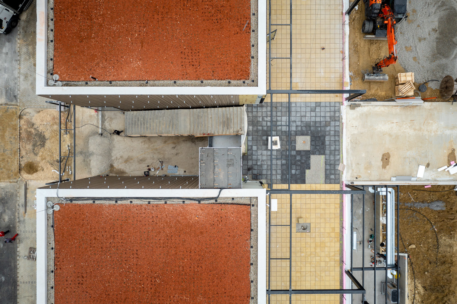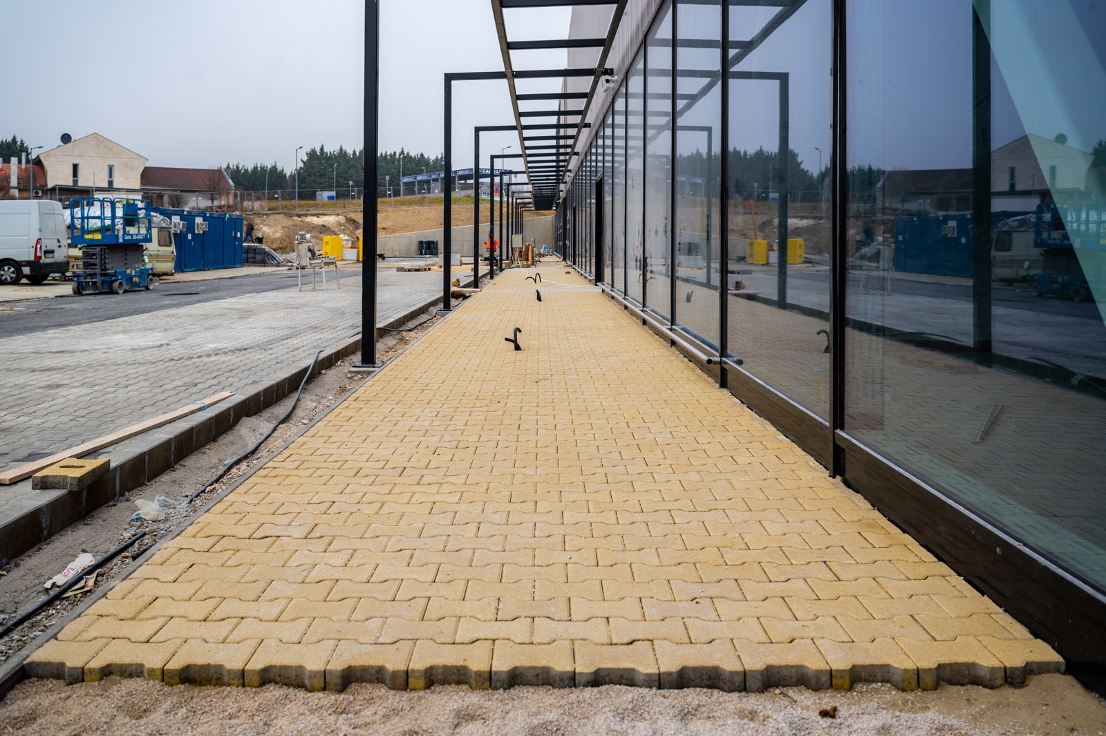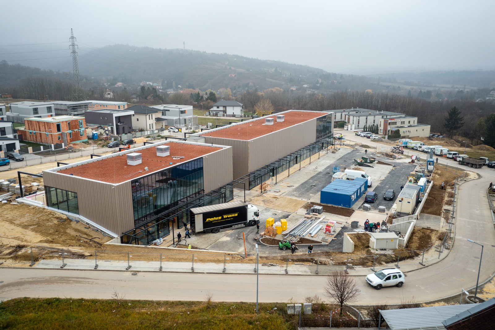 A külső területen a parkolóépítés, a térkövezés, valamint a tetőn az extenzív zöldtető kiépítése volt folyamatban.