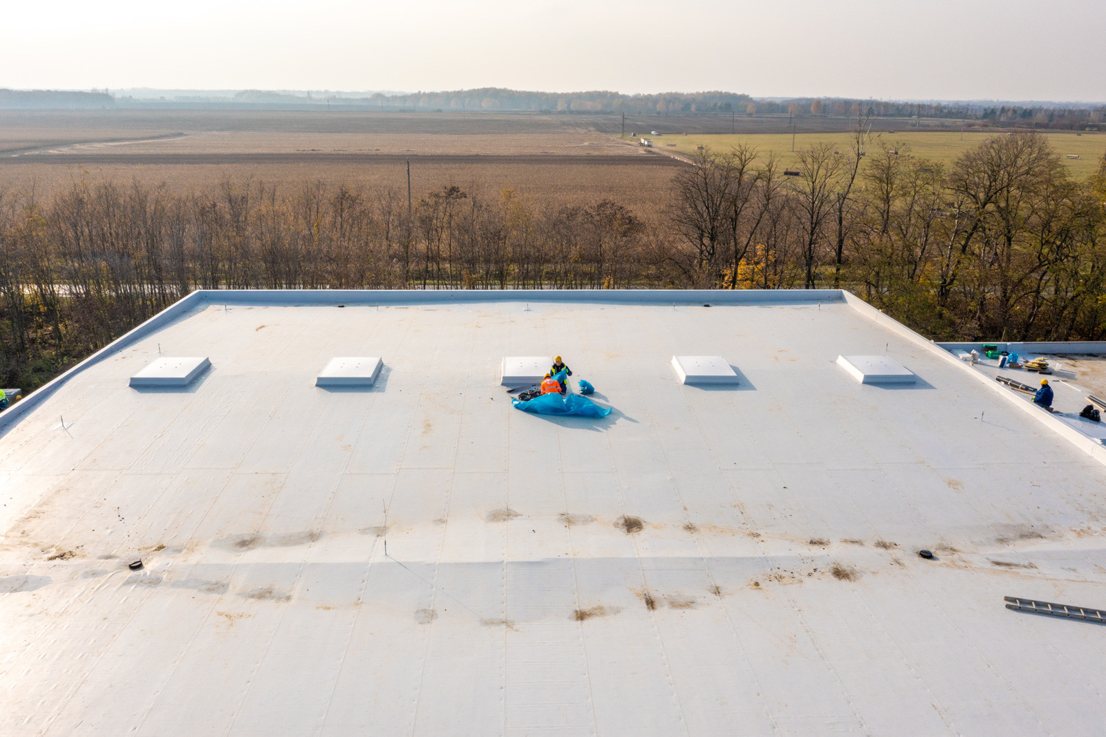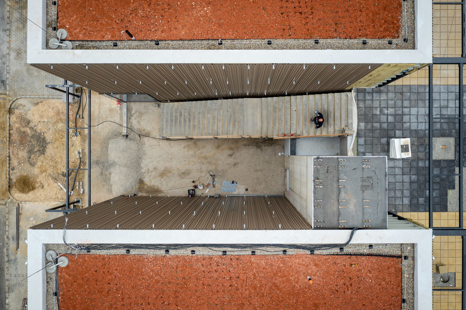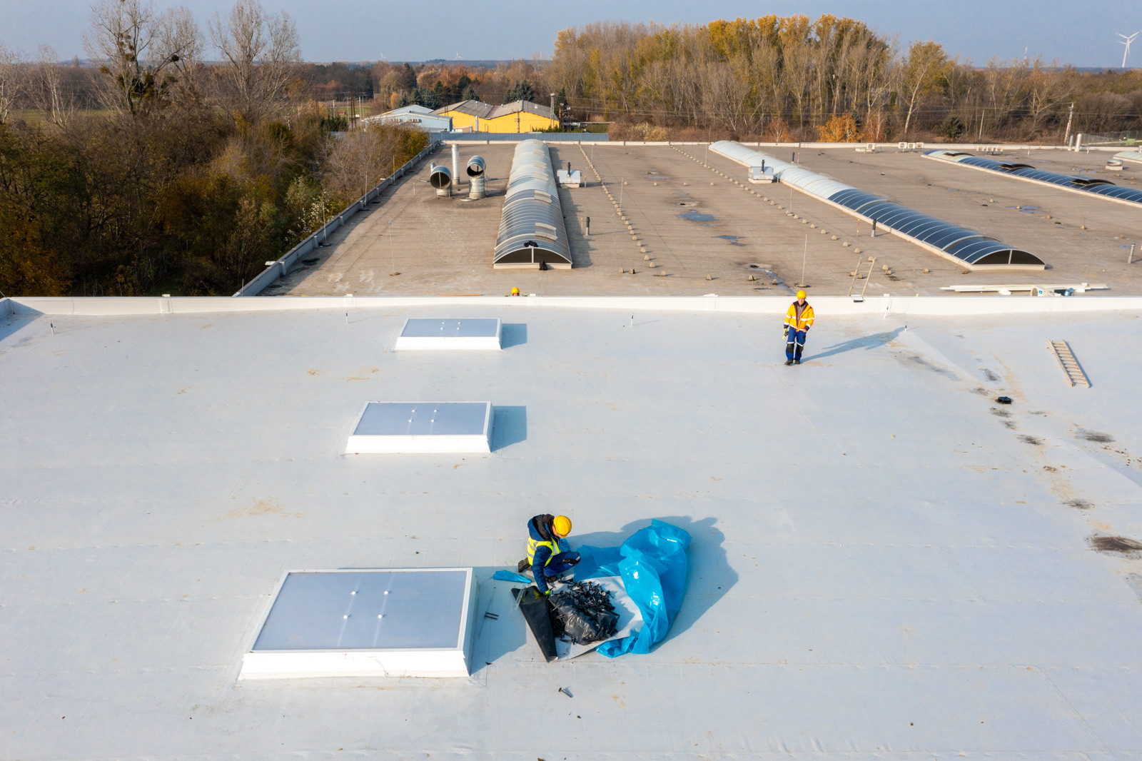 A külső területen a parkolóépítés, a térkövezés, valamint a tetőn az extenzív zöldtető kiépítése volt folyamatban.