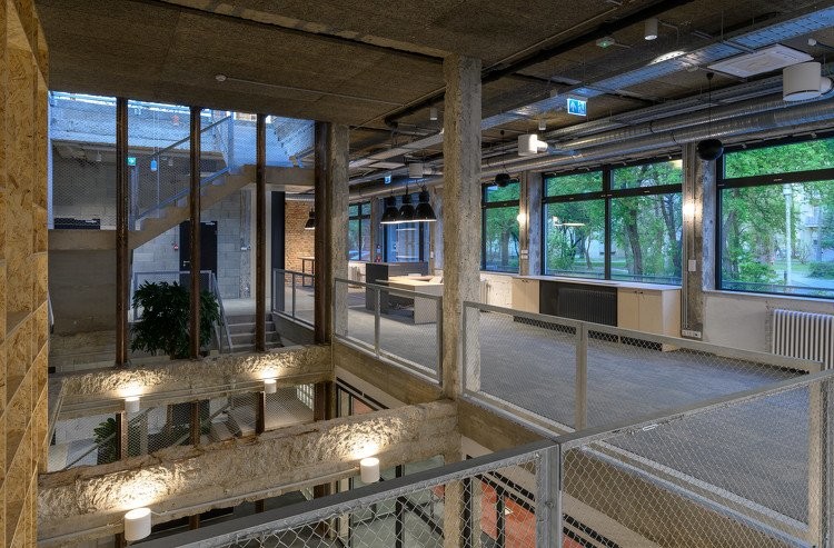 A 950 négyzetméteres belső tér kialakítása során a korábbi épületből egy nem szokványos, az industrial látvány-kialakítások között is sok egyedi megoldást tartalmazó formavilágot alkotott meg az EBH csapata.