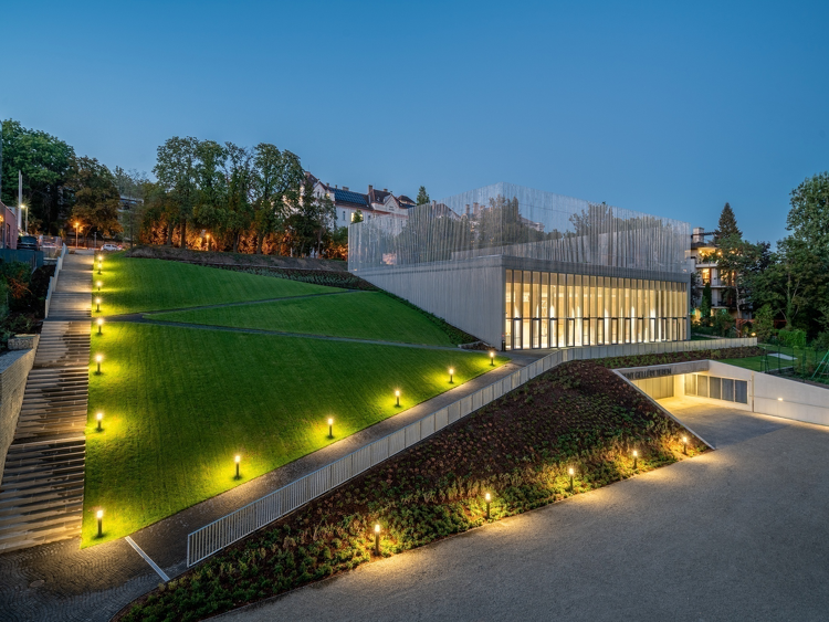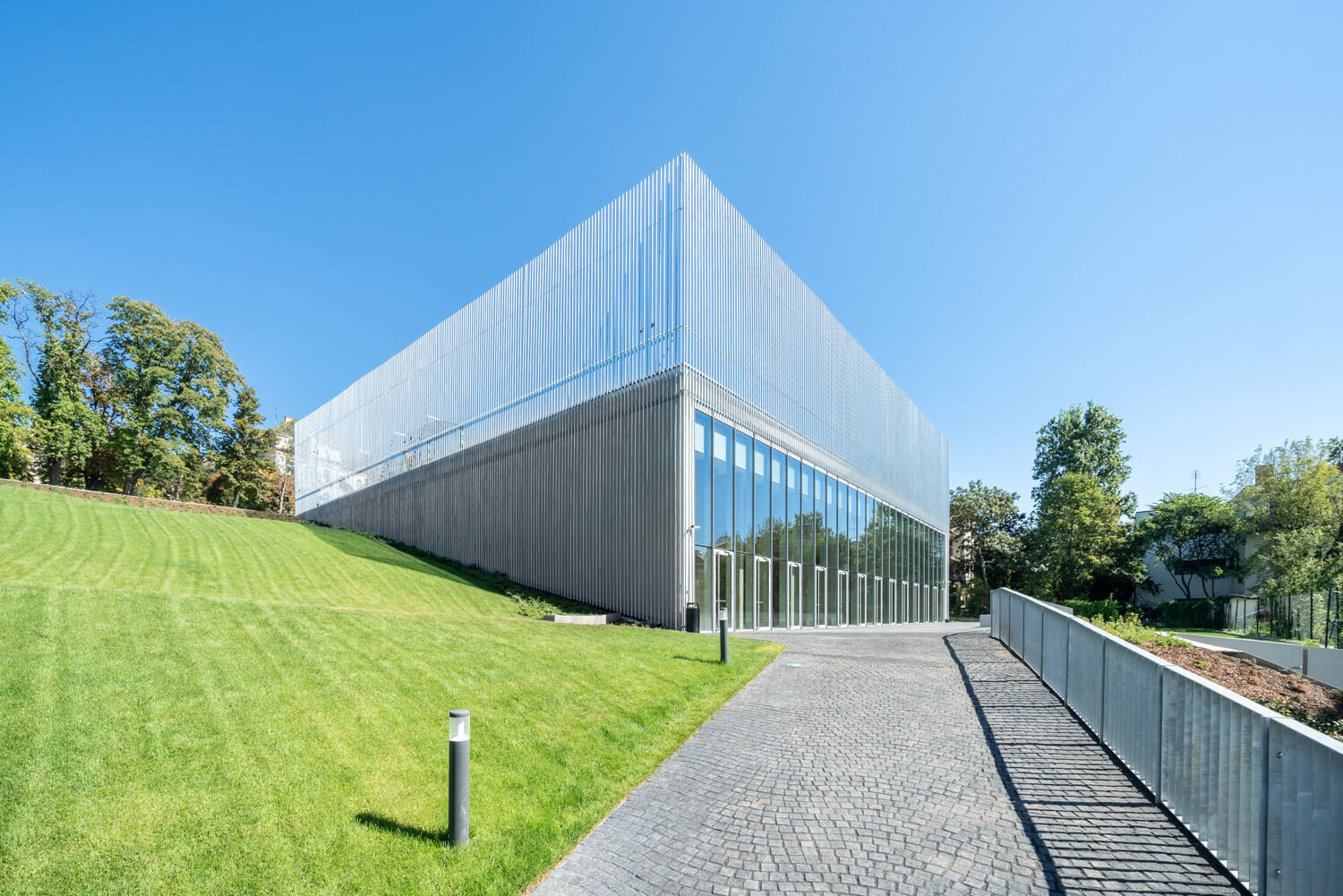 a hegyoldalban fekvő épület északi oldala teljesen a föld alatt van. Kialakítása terén lapos-tetős, a tetején kültéri sportpályával, amelyeket az épület raszteréhez igazodó, finoman áttört felületi megjelenést biztosító acél oszlopok határolnak.