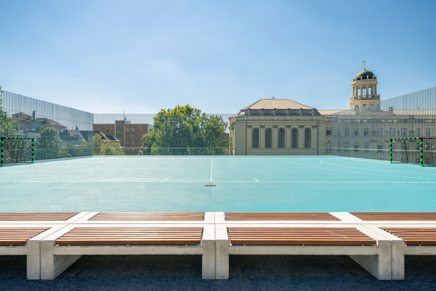 a zárófödémre épített élénk kék EPDM kézilabda pályát határoló „labdafogó háló”, mely 11 centiméterenként kiosztott 1240 db (összesen 6500 folyóméter) 42 mm átmérőjű horganyzott cső-elemből készült.