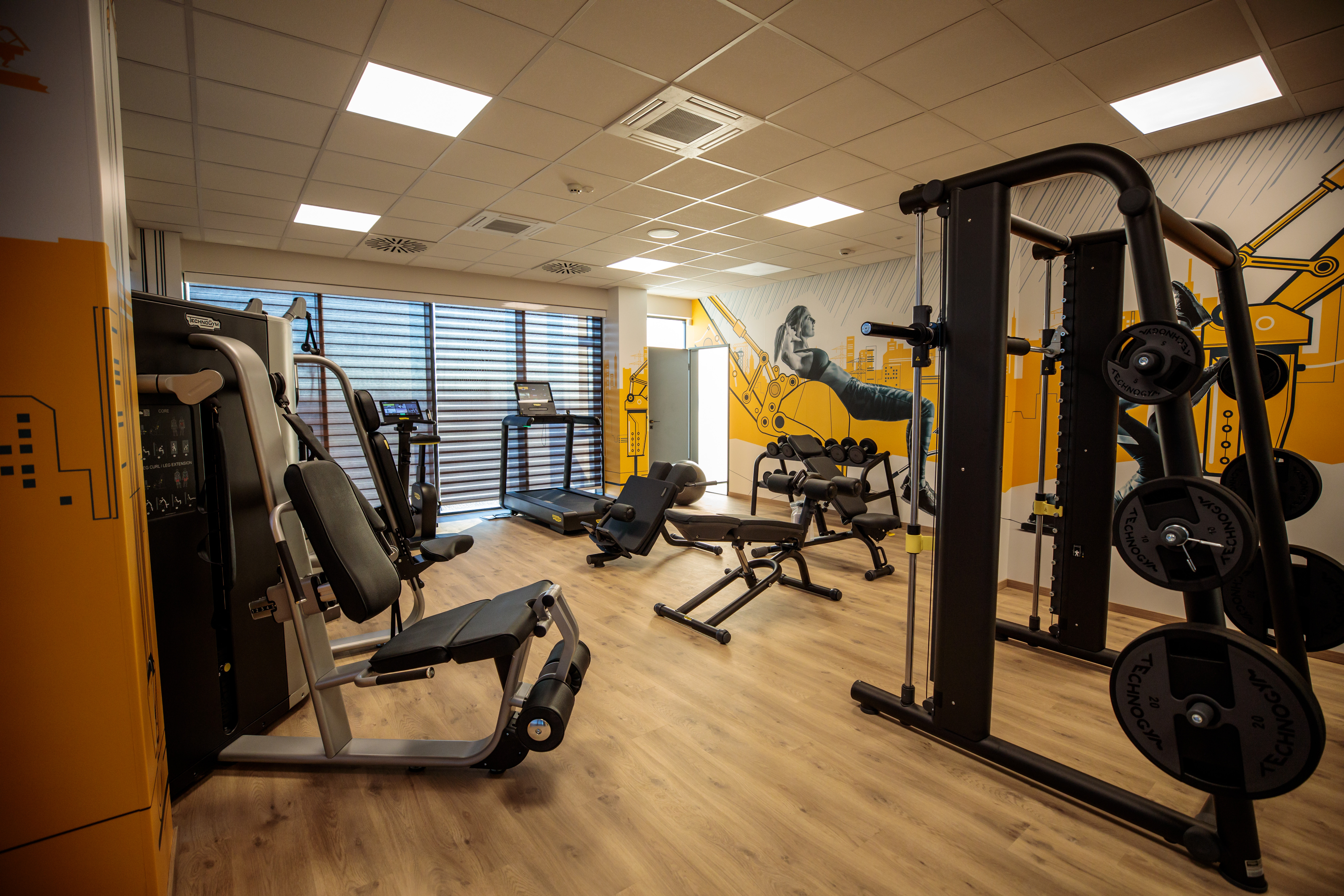 A jól felszerelt edzőterem hozzájárul a kollégák egészségének megőrzéséhez, regenerálódásához, biztosítja a szellemi-fizikai feltöltődést, emellett edzés közben a falakon elhelyezett dinamikus építőipari jelenetek motiválják a munkatársakat.