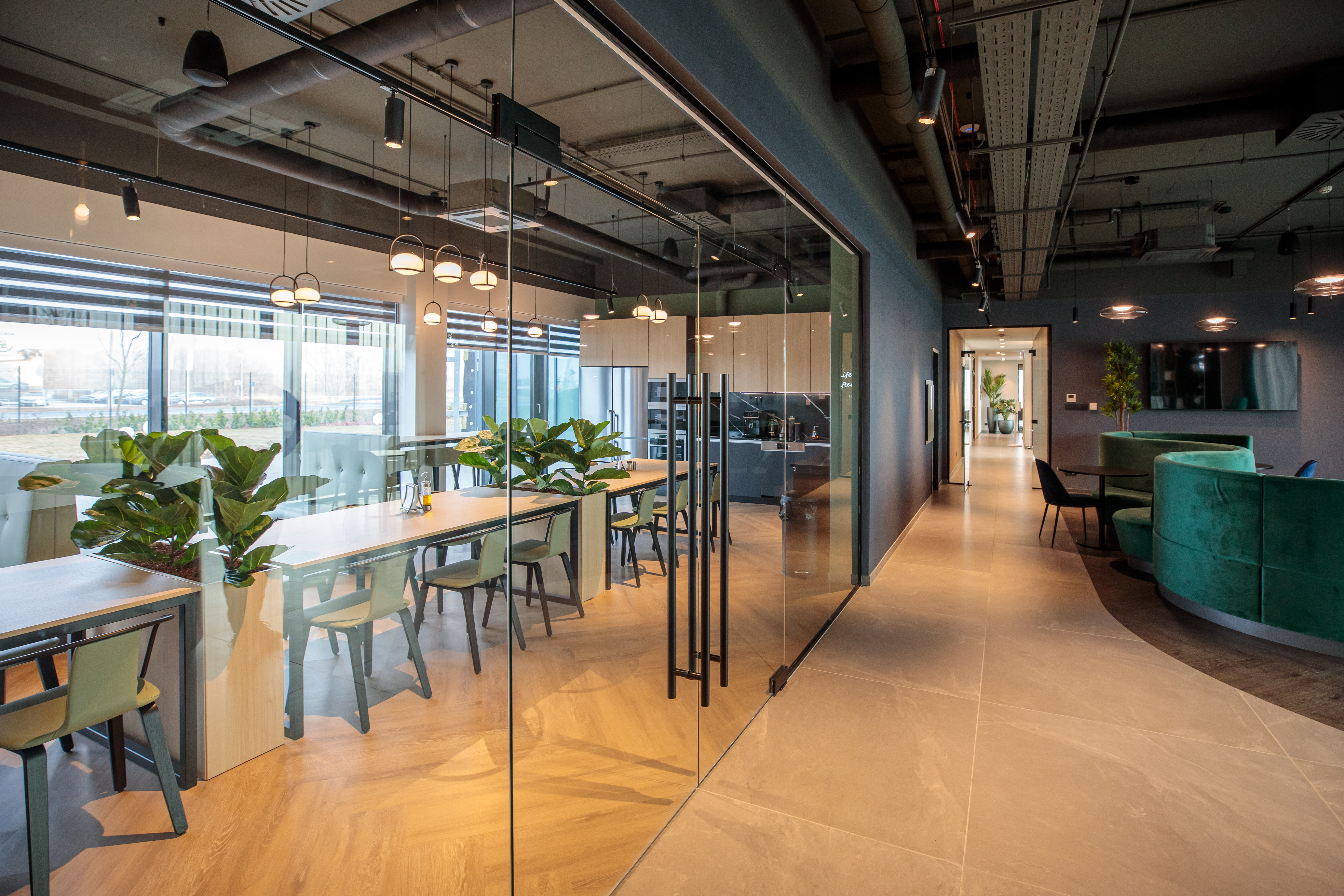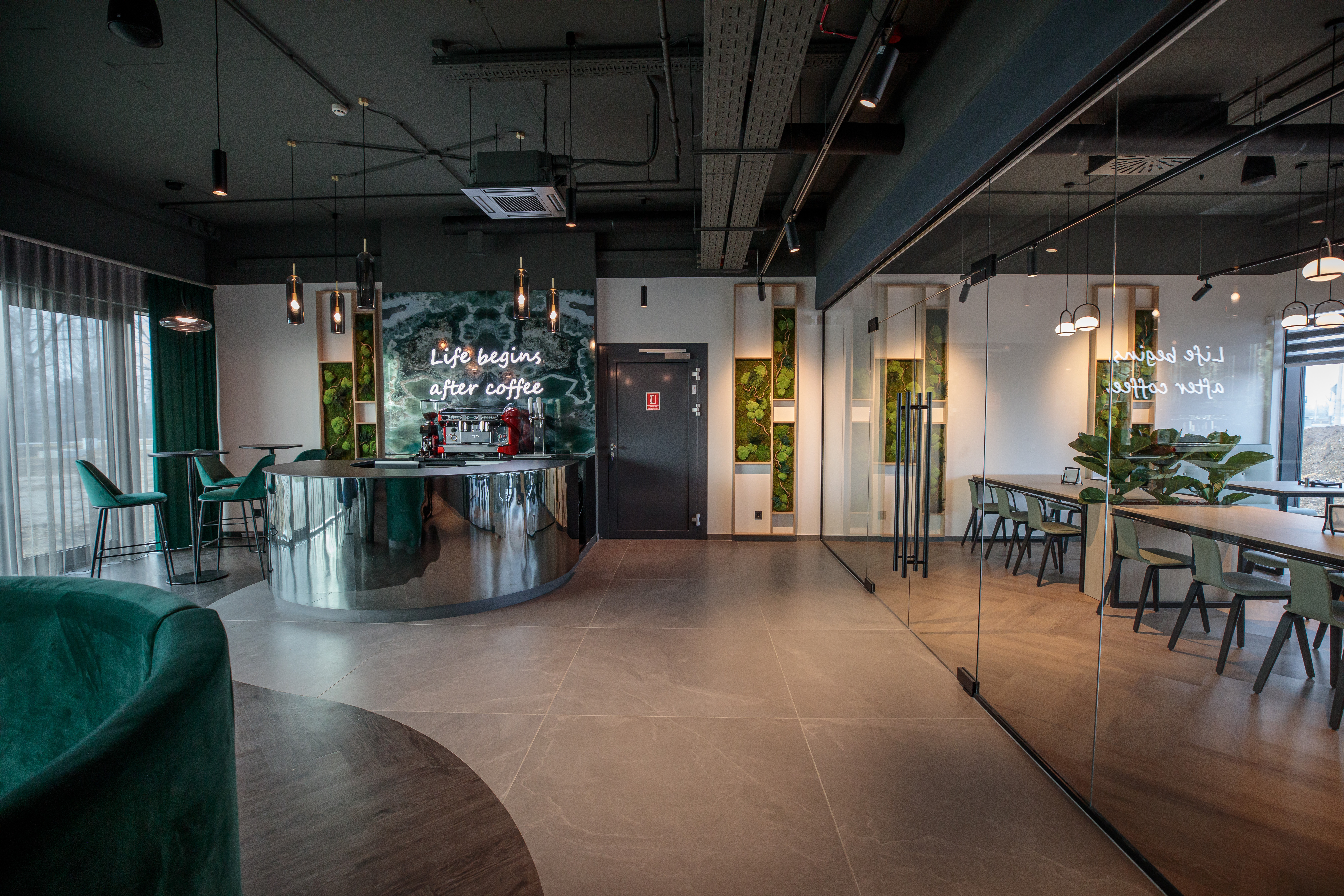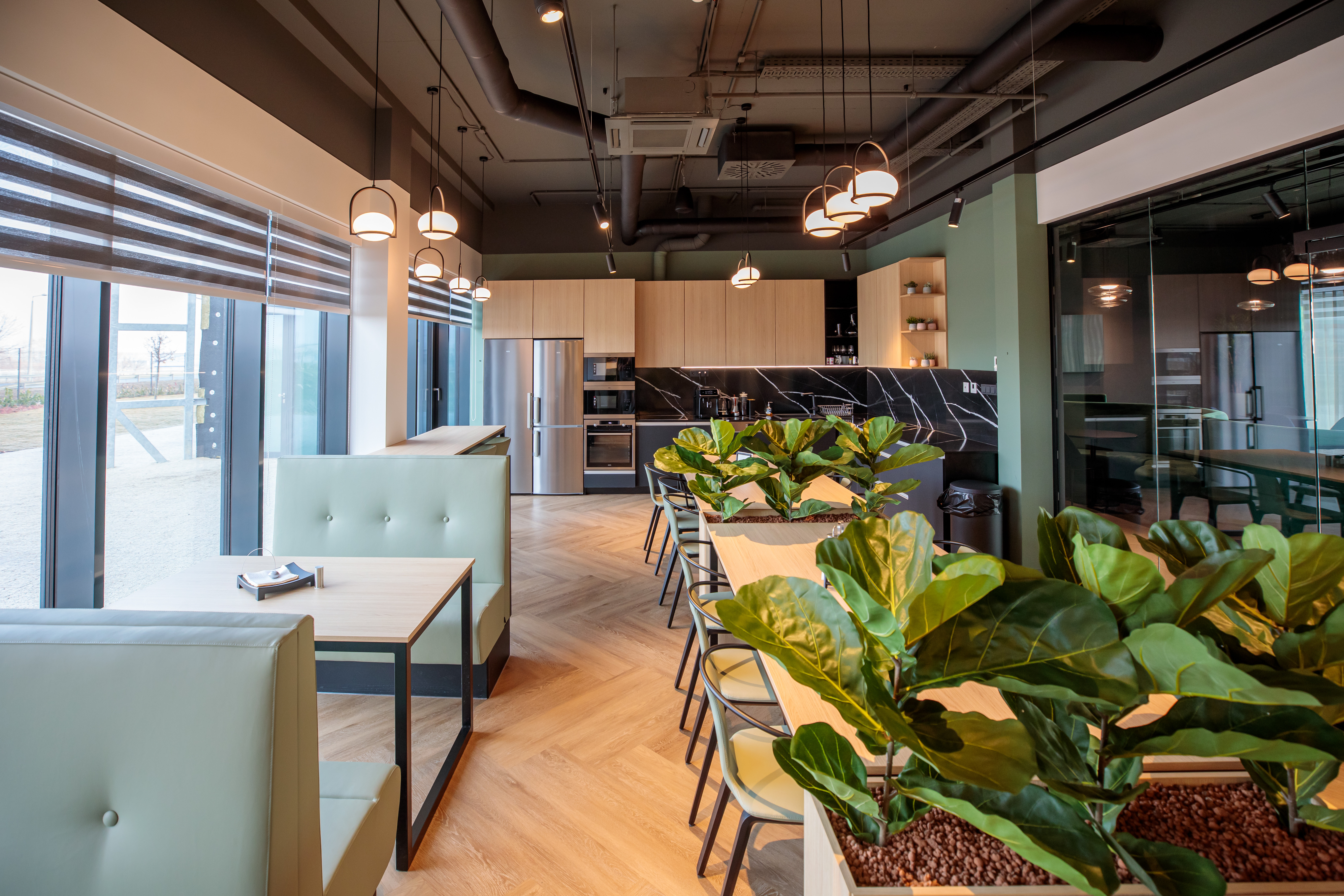 Fontos szempont volt, hogy a munkavégzés helyiségei mellett közösségi tereket is kialakítsanak, ezért a földszinten kávézósarok, egy átlagosnál nagyobb konyha és egy éttermeket idéző étkező várja kollégákat és a partnereket.