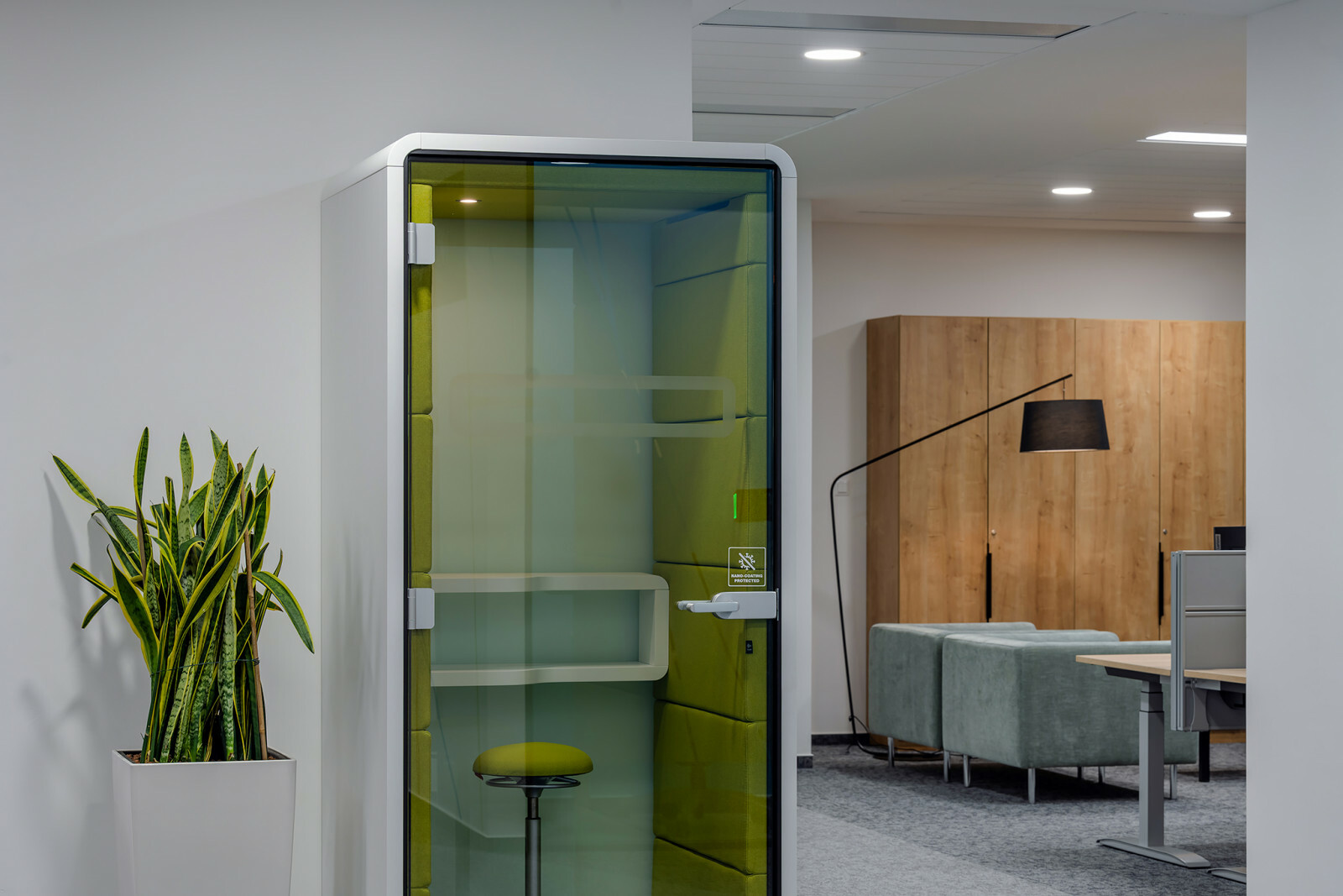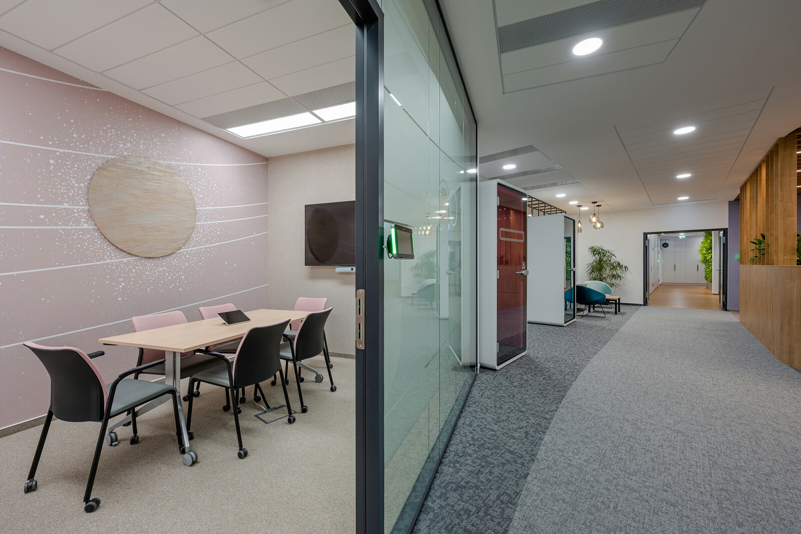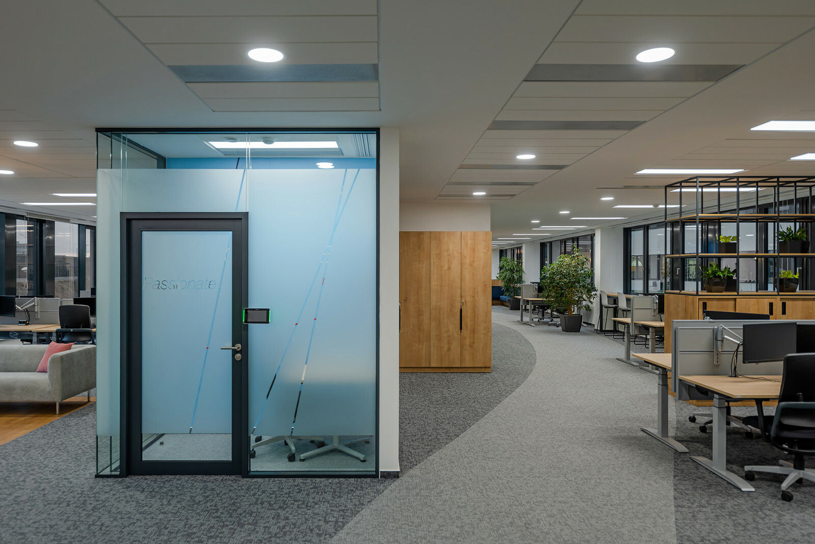 Egy olyan belsőépítészeti koncepciót dolgoztak ki, melynek központjában egy „shared desk” rendszer áll. A munkaállomások, zárt tárgyalóblokkok és nyílt kollaborációs terek egyaránt megtalálhatóak az új irodában, így minden munkafázist kiszolgáló, agilis munkahelyet tudott teremteni a vállalat.