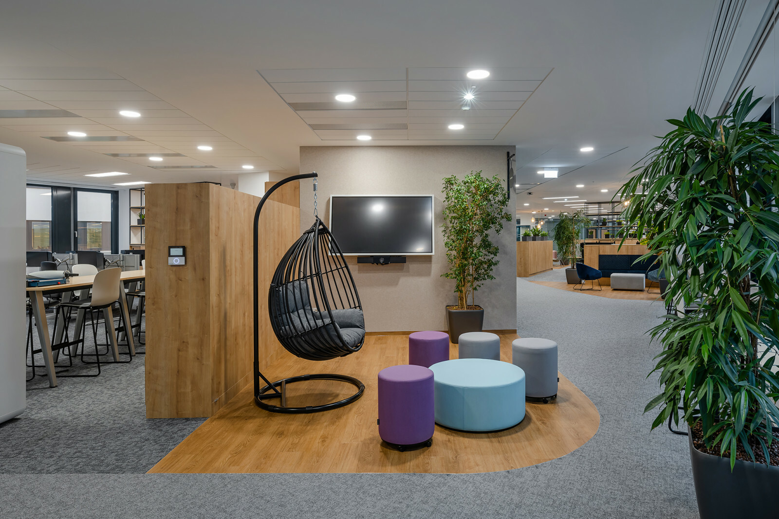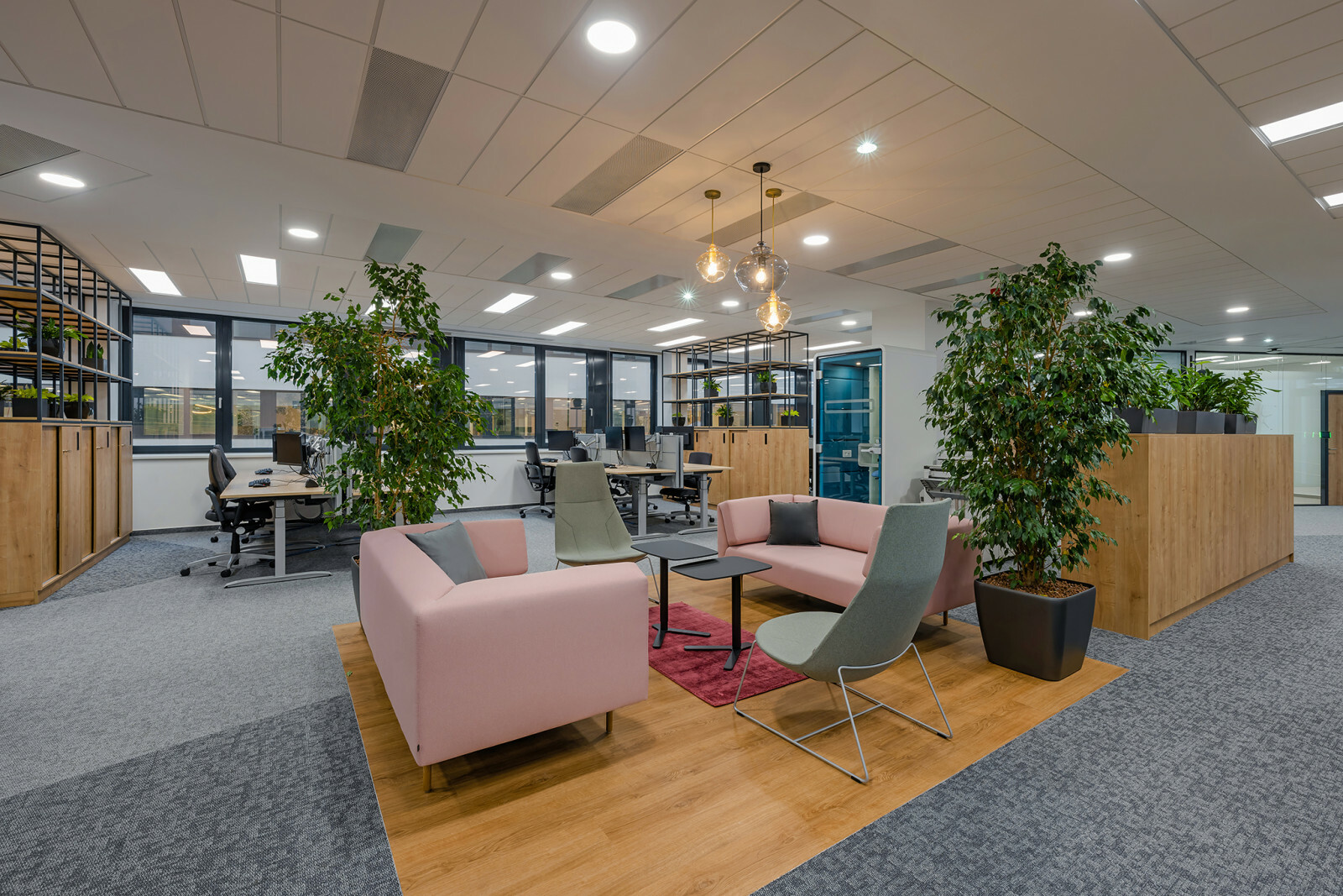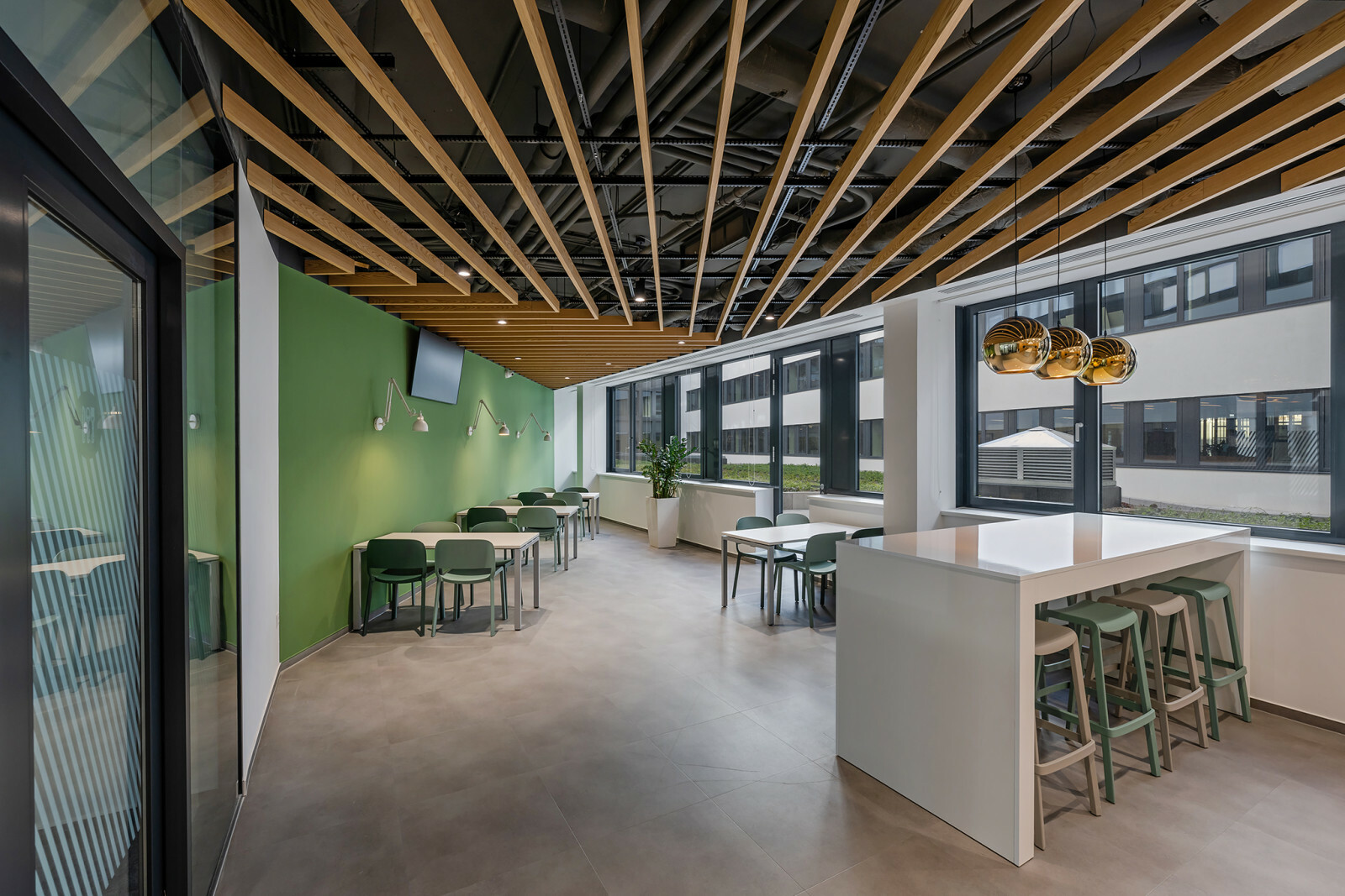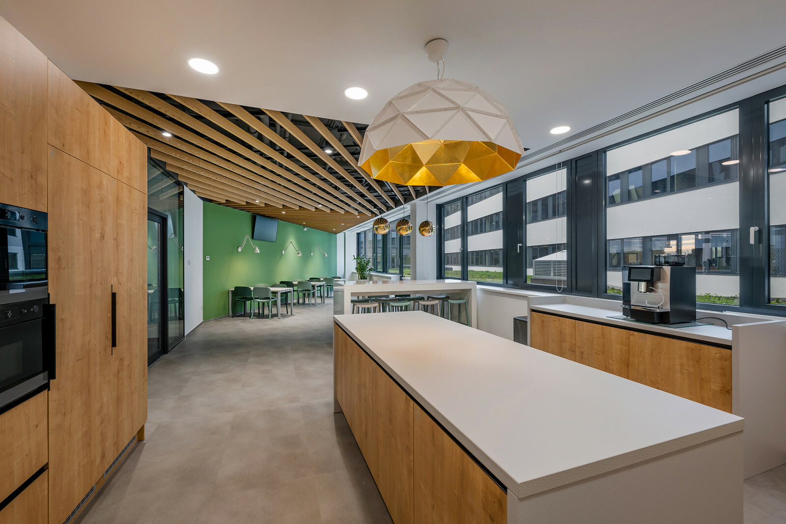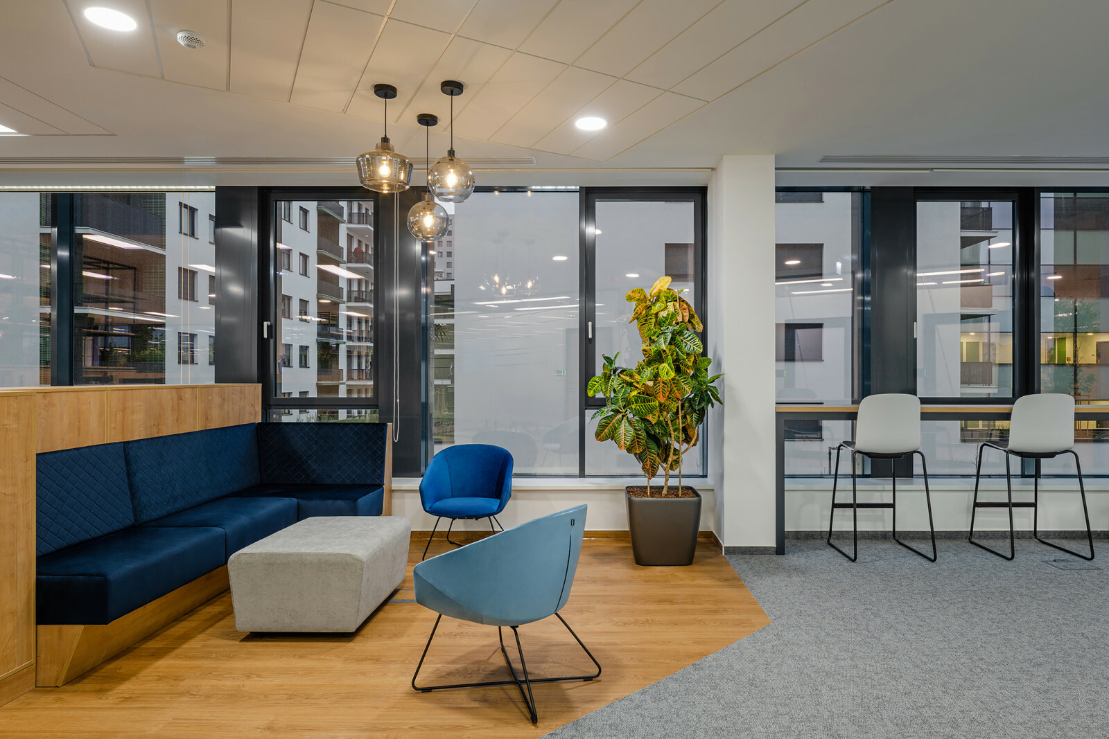 Az irodában mindemellett kiemelt szerepet kaptak a közösségi terek, melyek a munkavégzés mellett a szabadidős tevékenységeknek is kedveznek. A kellemes környezet kialakítása érdekében a nyugtató szürkés színvilágot élő növényfallal, zöld felületekkel és belső kerttel dekorálták. Ugyanakkor a cég társadalmi felelősségvállalásának és üzleti stratégiájának a fenntarthatóság is fontos részét képezi, így a bútorok java a már meglévő bútorok újrahasznosításaként került az új irodába.