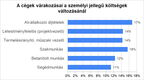 Komoly kihívást jelent a munkaerő megtartása, képzése, továbbképzése. Csak a válaszadók 27%-a számol a foglalkoztatottak átlagos állományi létszámának növelésével a következő fél évben. 2021-ben a KSH adatai szerint átlagosan 9%-kal nőtt a havi bruttó átlagkereset, 2022 év végéig a felmérésben részt vevő cégek közel 15%-os átlagos bérköltség növekedéssel számolnak.