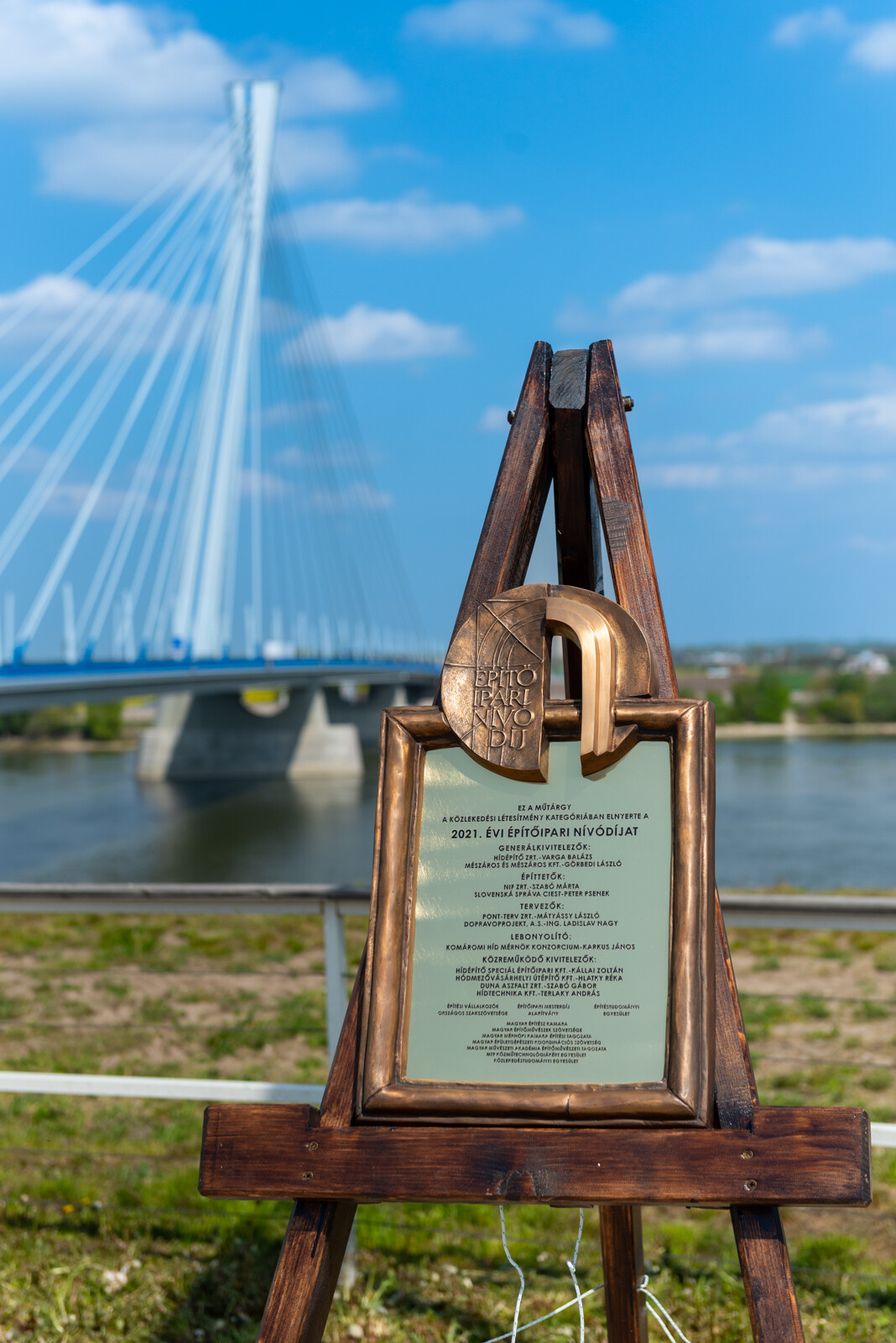 A nívódíjat még 2021 decemberében kapta meg a különleges, egypilonos szerkezetű híd, most április utolsó napjaiban pedig ennek alkalmából avattak táblát az Új Komáromi Duna-híd Látogatóközpont mellett.