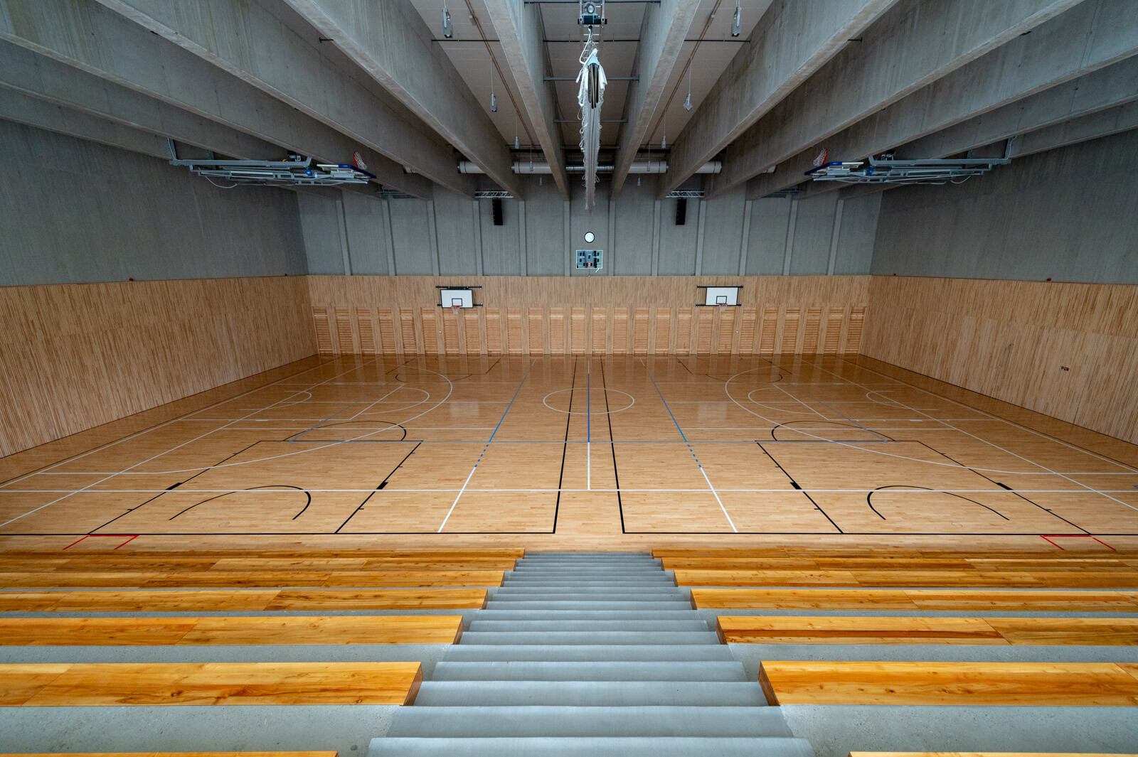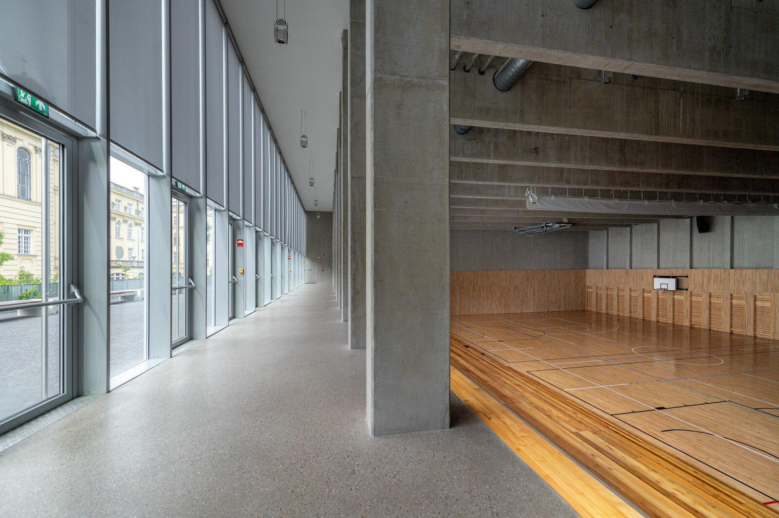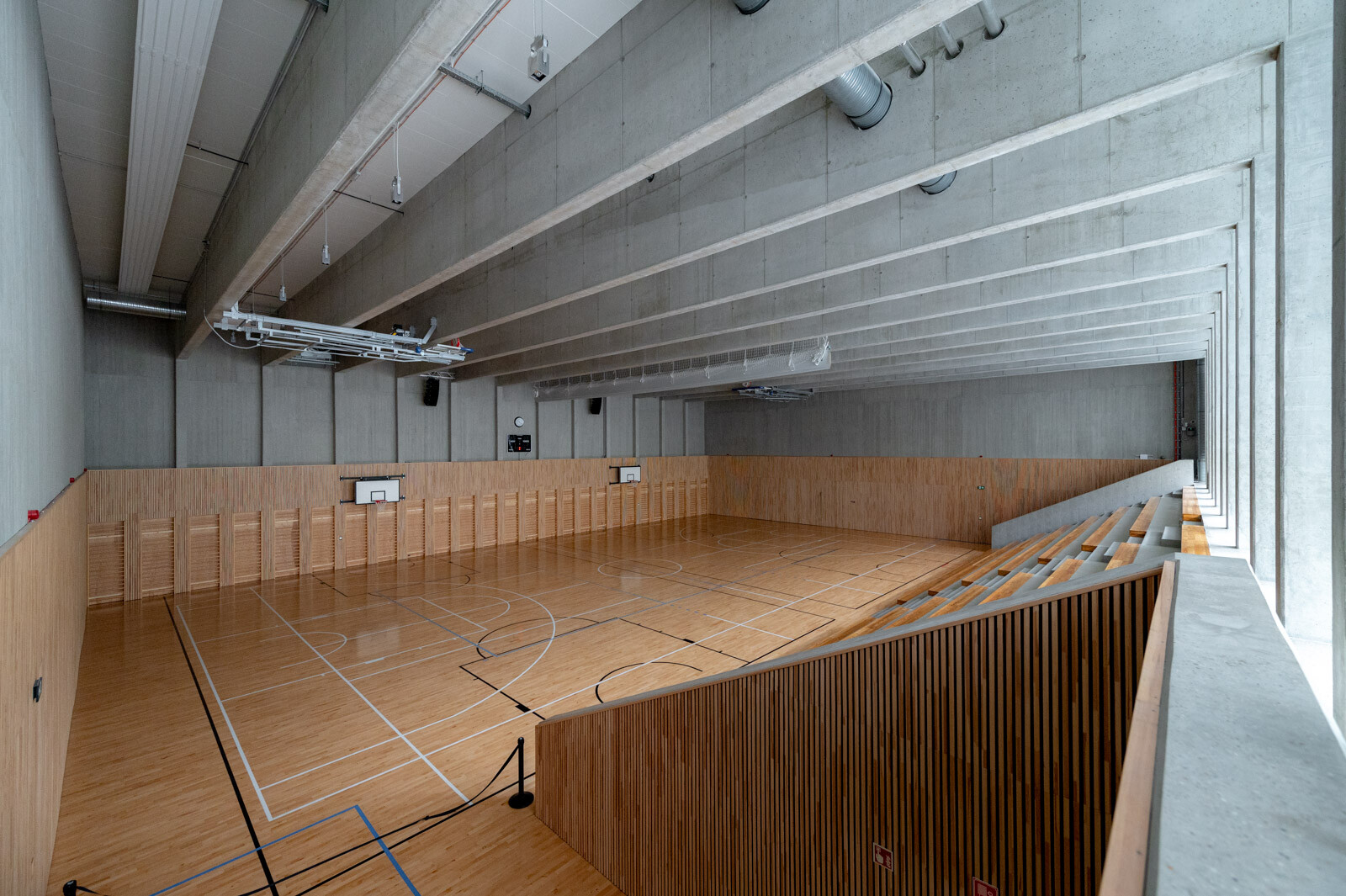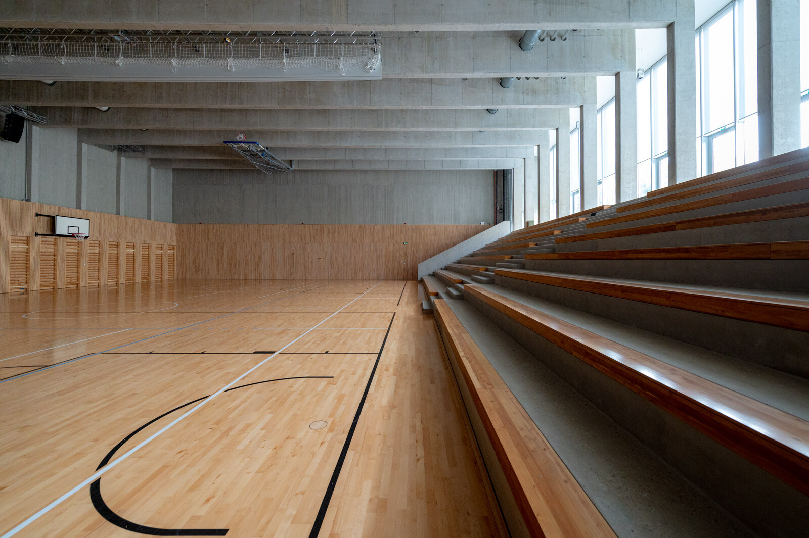 A lapostetős épület a tetején kültéri sportpályákkal jött létre, amelyeket a csarnok raszteréhez igazodó, finoman áttört felületi megjelenést biztosító acél oszlopok határolnak. Az épület déli oldalán transzparens üveghomlokzatot kapott. Az összegzés ugyanakkor azt is méltatta, hogy az építmény kivitelezése általánosan magas minőségű: „A naturális burkolatok, a látszóbeton szerkezetek különösen igényesen kerültek megvalósításra.”