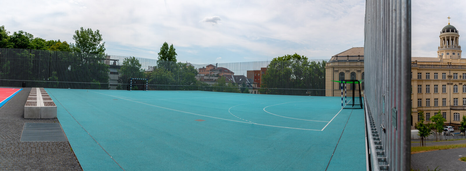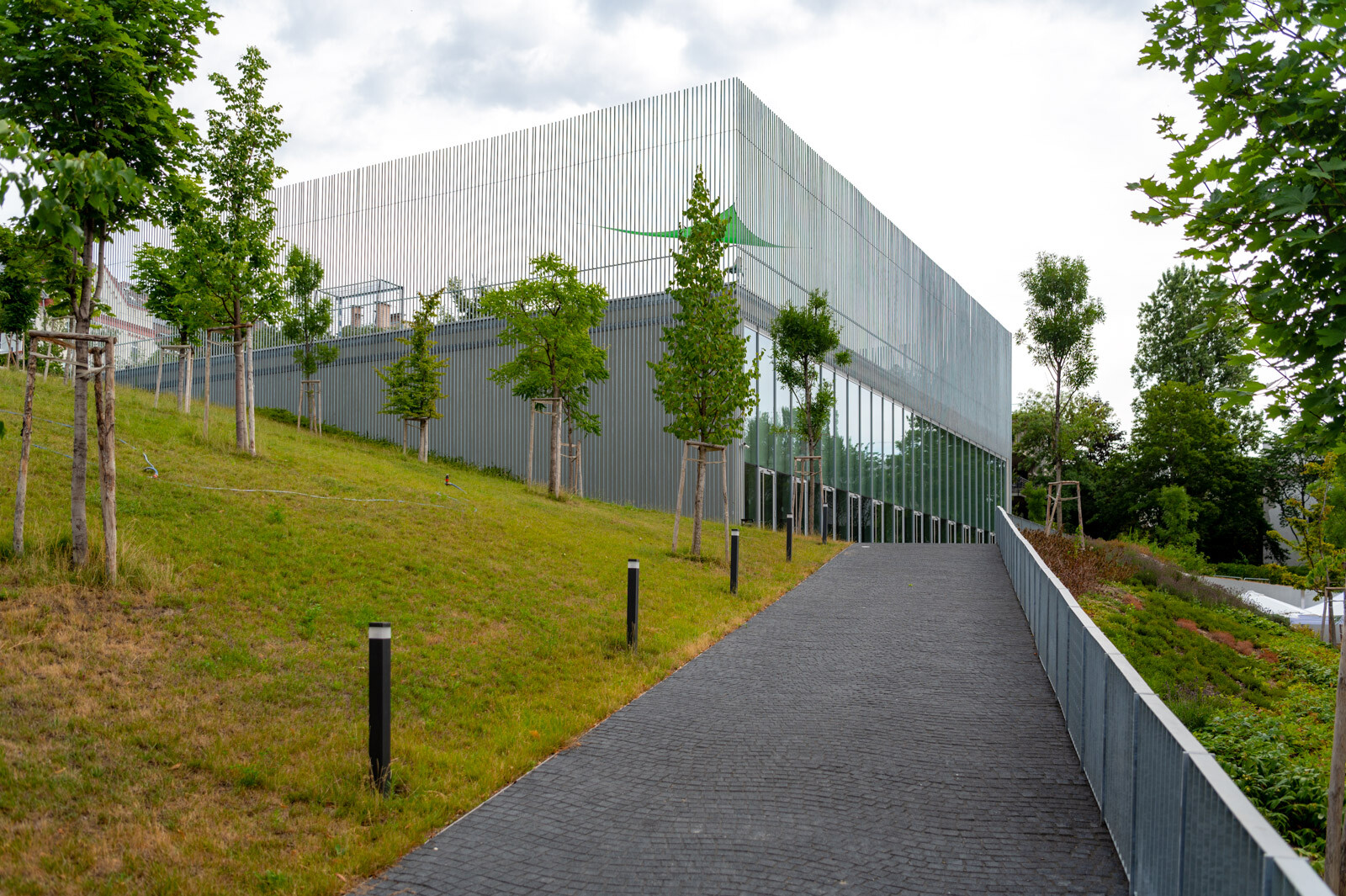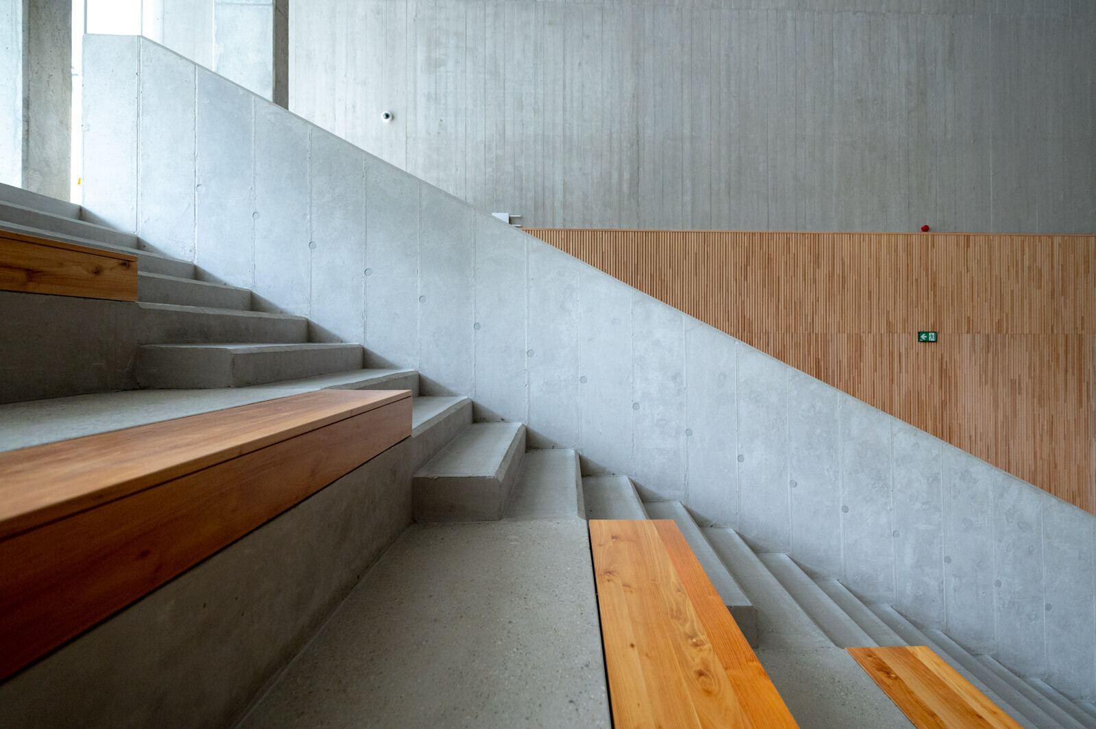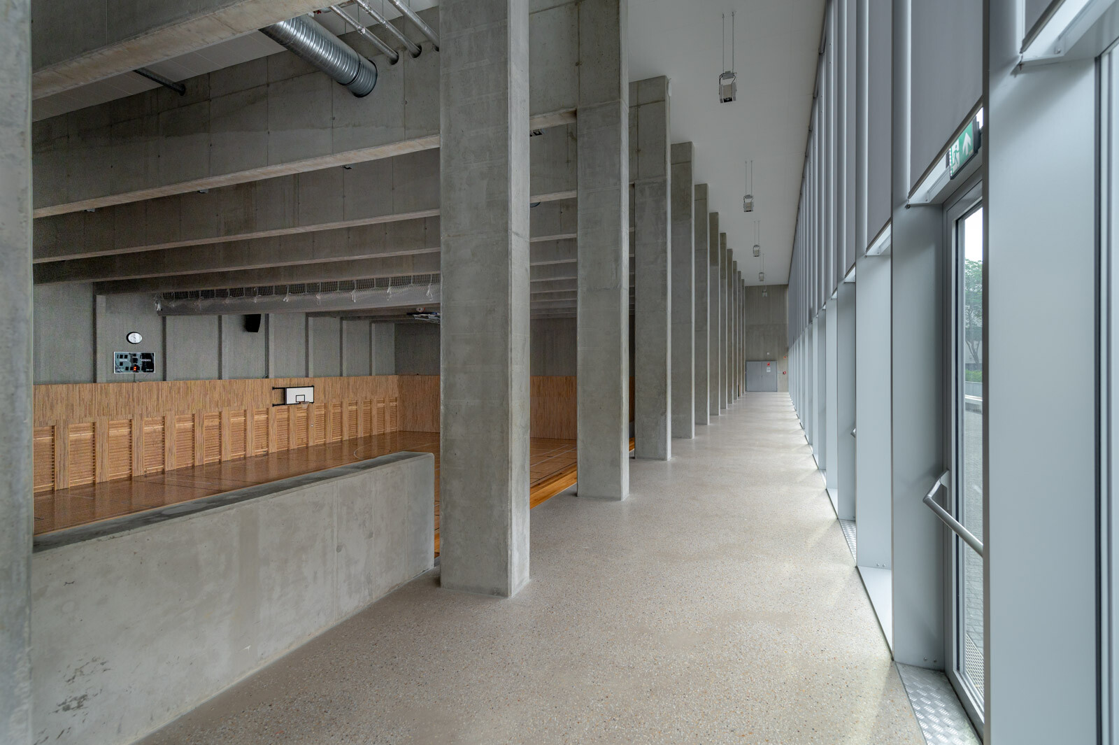 A lapostetős épület a tetején kültéri sportpályákkal jött létre, amelyeket a csarnok raszteréhez igazodó, finoman áttört felületi megjelenést biztosító acél oszlopok határolnak. Az épület déli oldalán transzparens üveghomlokzatot kapott. Az összegzés ugyanakkor azt is méltatta, hogy az építmény kivitelezése általánosan magas minőségű: „A naturális burkolatok, a látszóbeton szerkezetek különösen igényesen kerültek megvalósításra.”