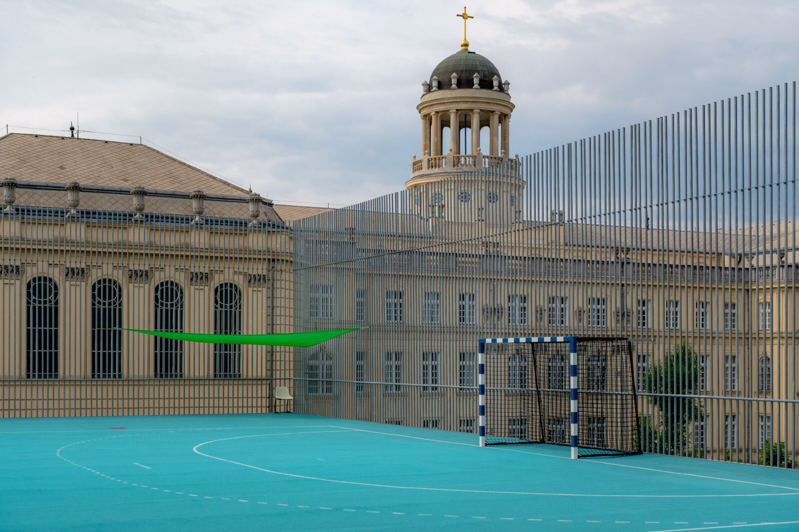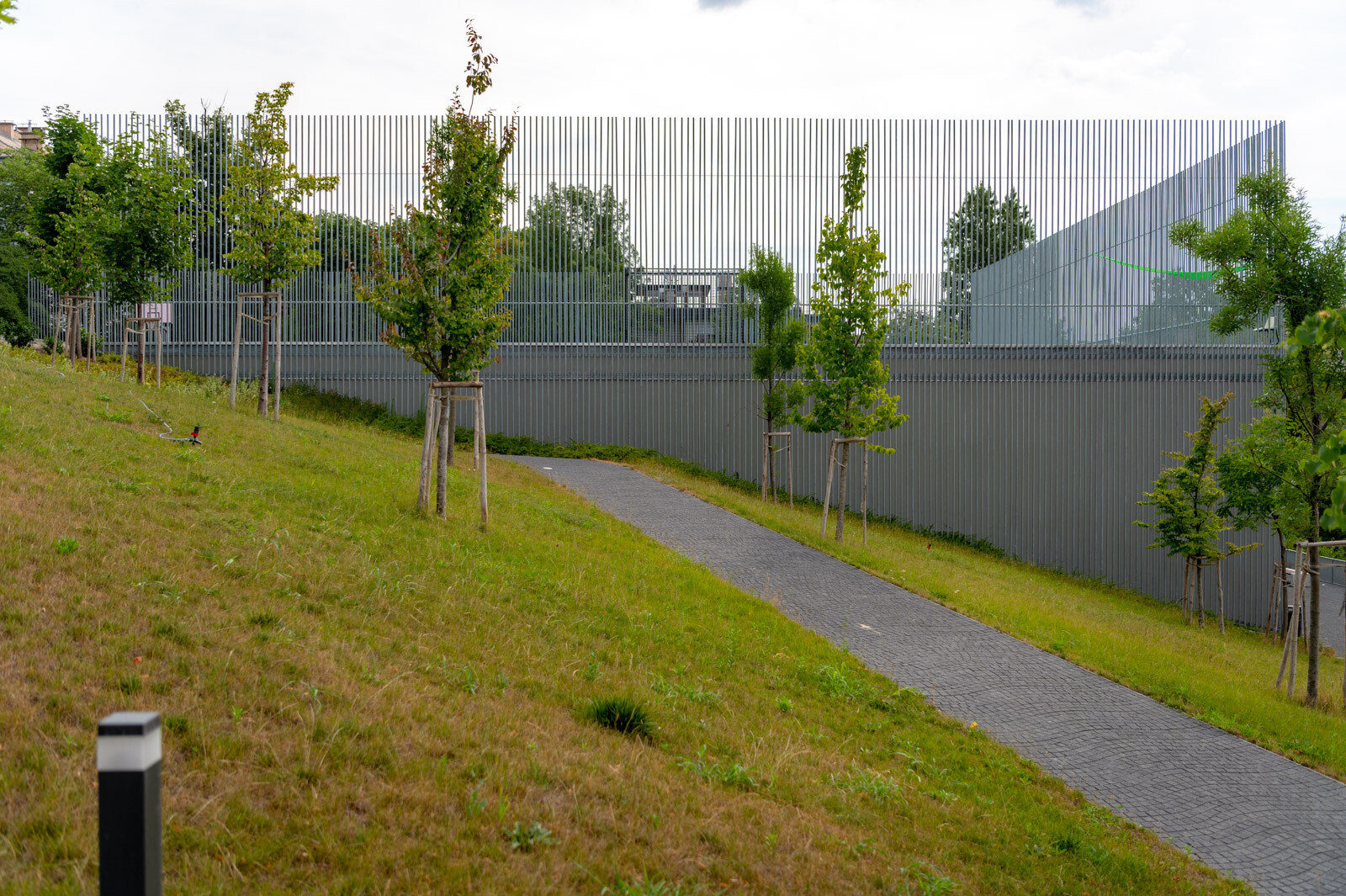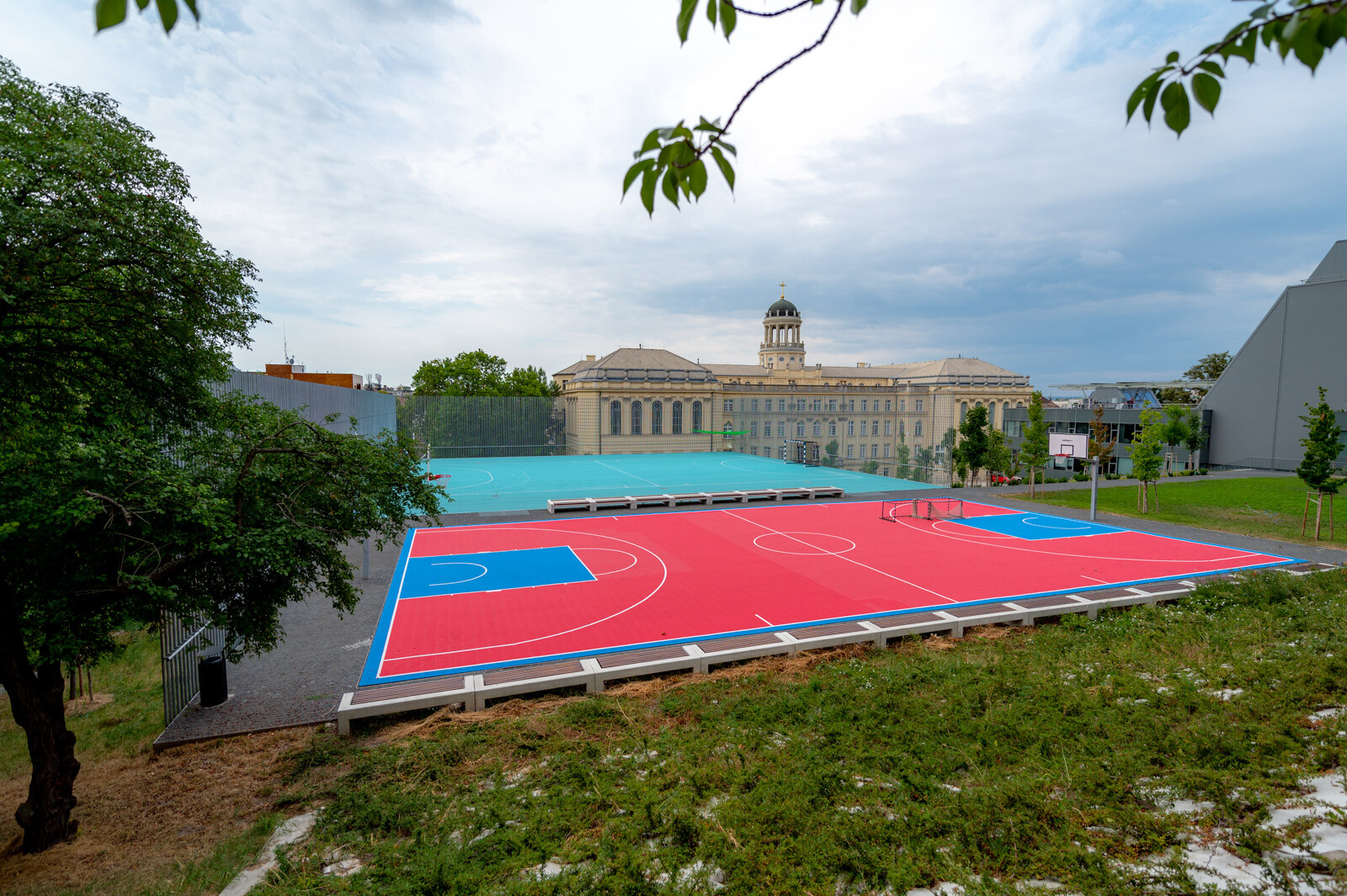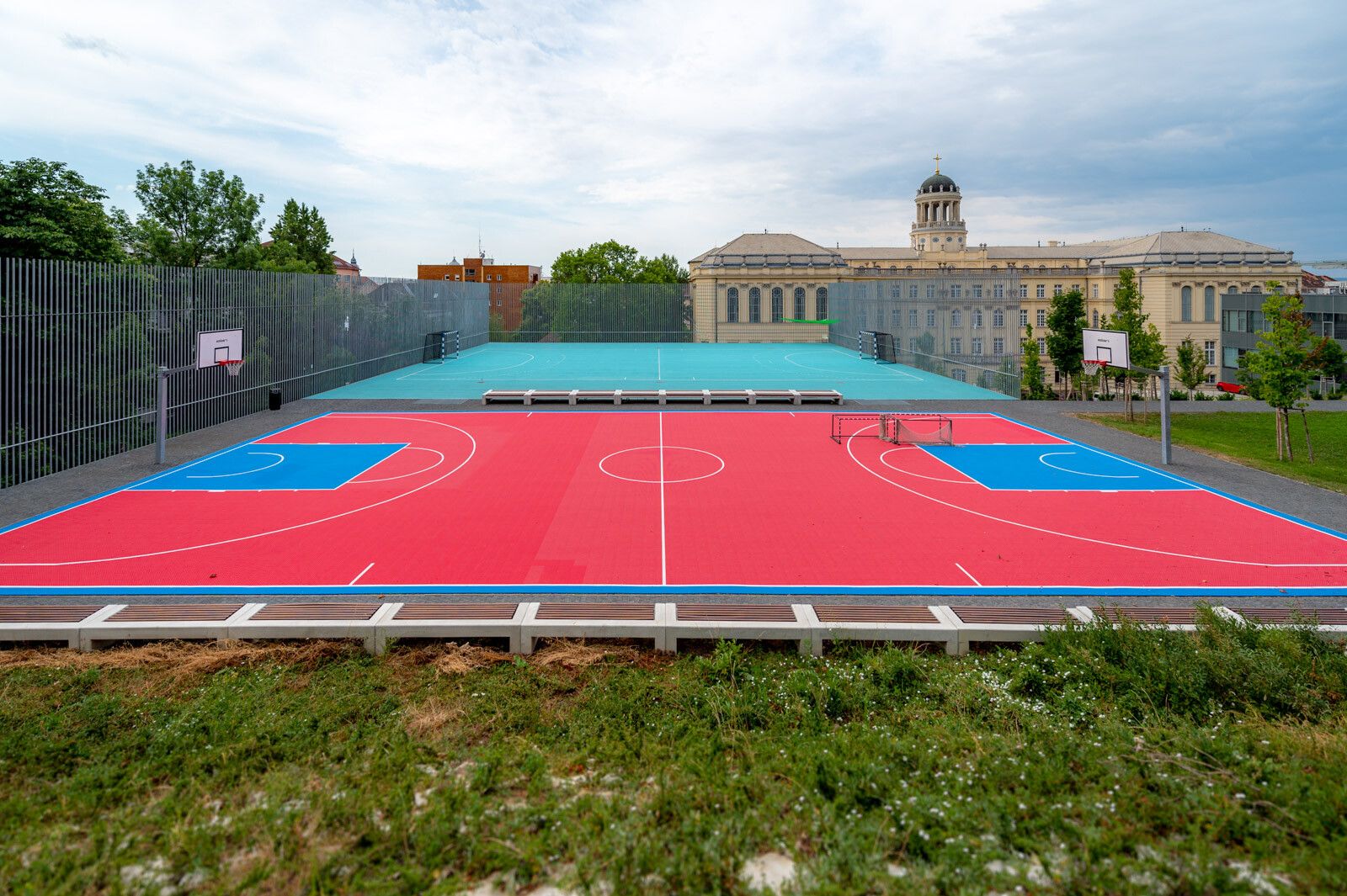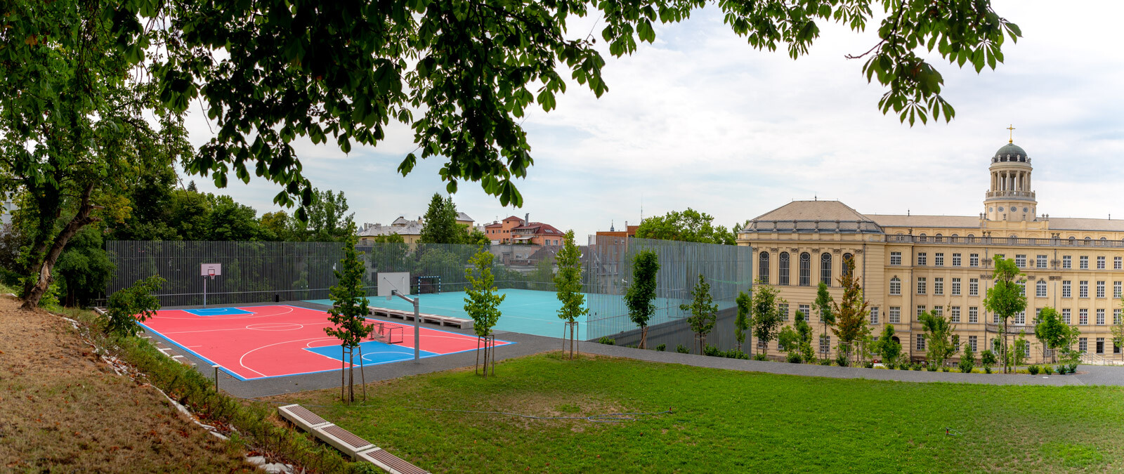 A Szent Margit Gimnázium mögötti új csarnokot a lejtős terephez alkalmazkodva, a tetején kültéri sportpályákkal hozta létre a LATEREX Építő Zrt. és a Possibuild Kft konzorciuma.