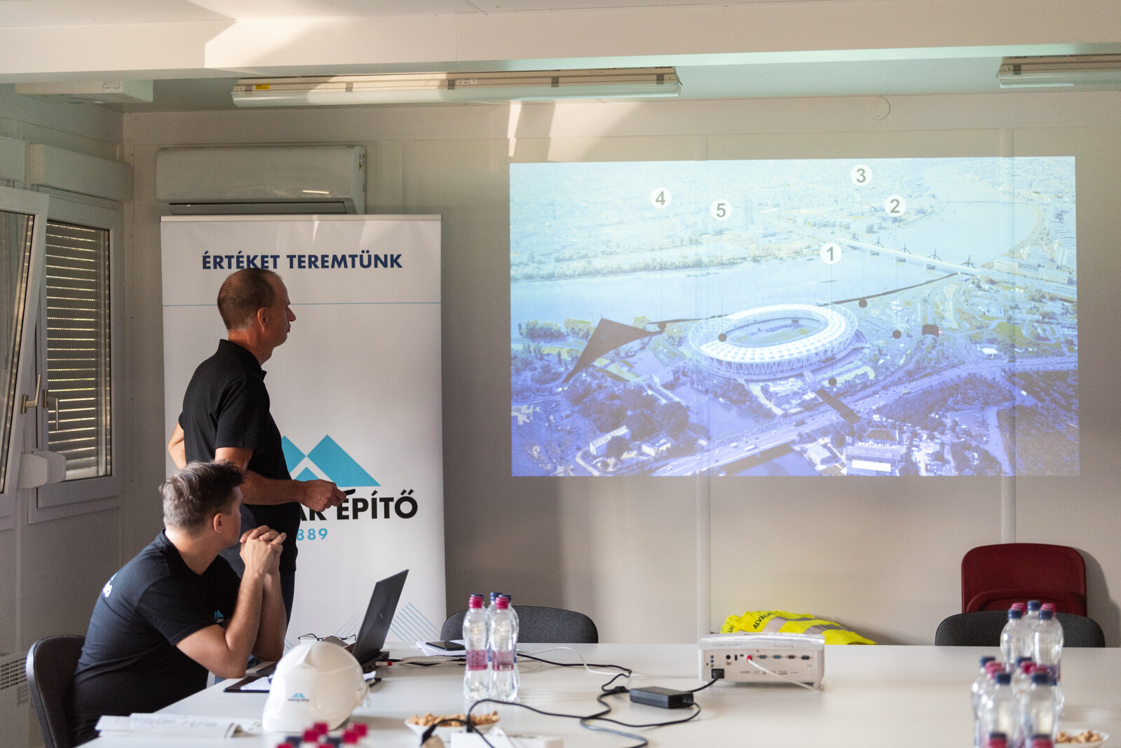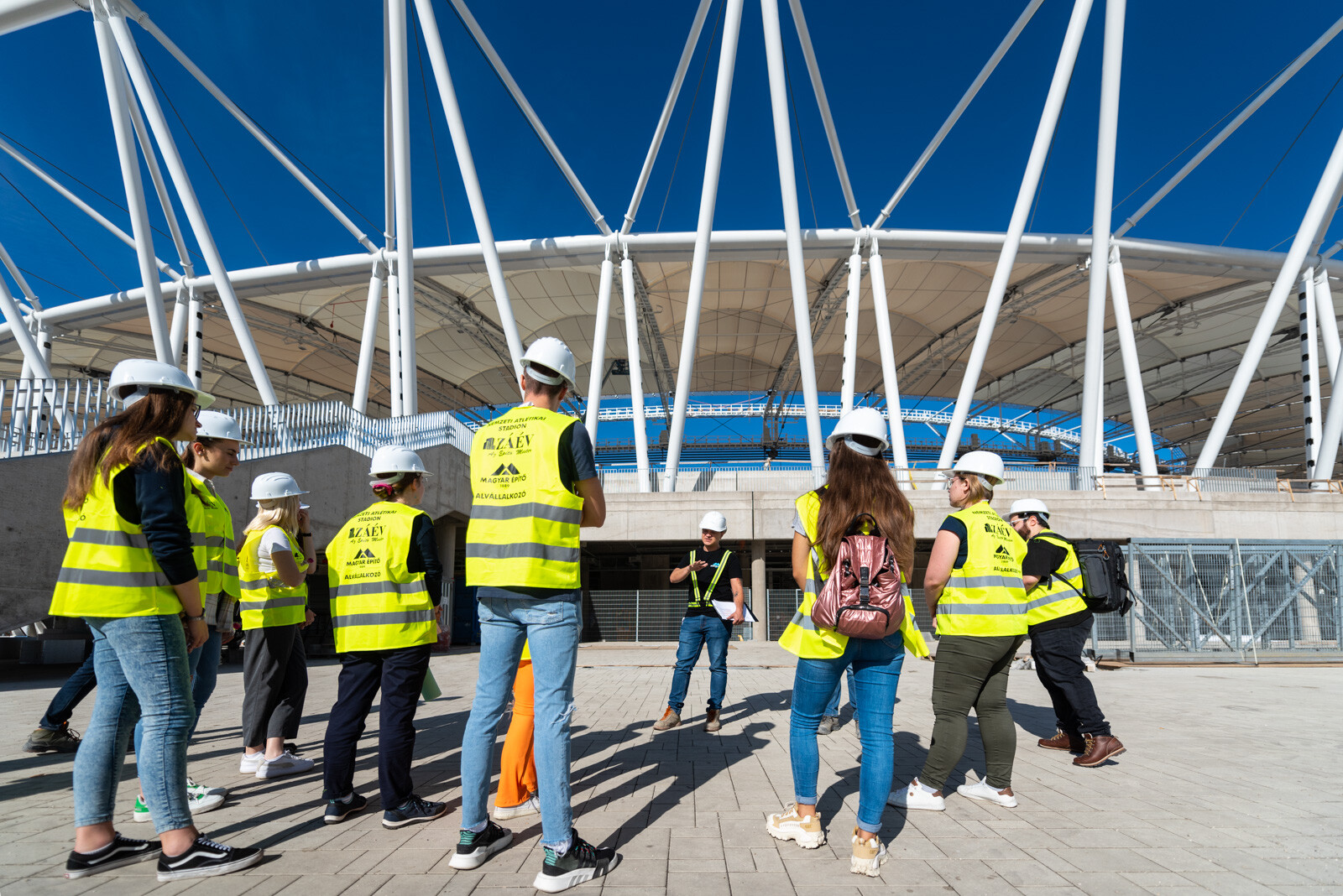 A stadionban a bejárás alatt is zajlottak a munkálatok. A hallgatókat szakmai vezetés kísérte végig a projekt helyszínén: Balás Ákos projektigazgató-helyettes, Győry Csaba Dávid projektvezető-helyettes, és Vedres Béla vállalkozásvezető-helyettes. A projektlátogatás keretein belül első körben egy rövid cégismertetőt és a projektelemekről szóló előadást tartottak, majd ezt követte az egész területre kiterjedő bejárás.