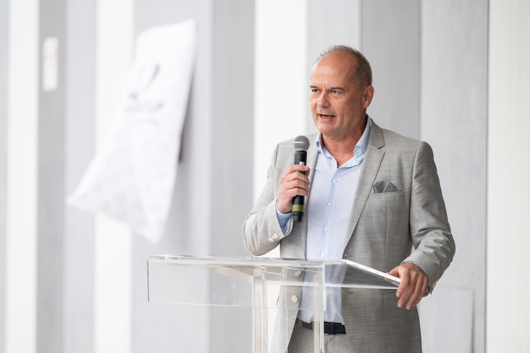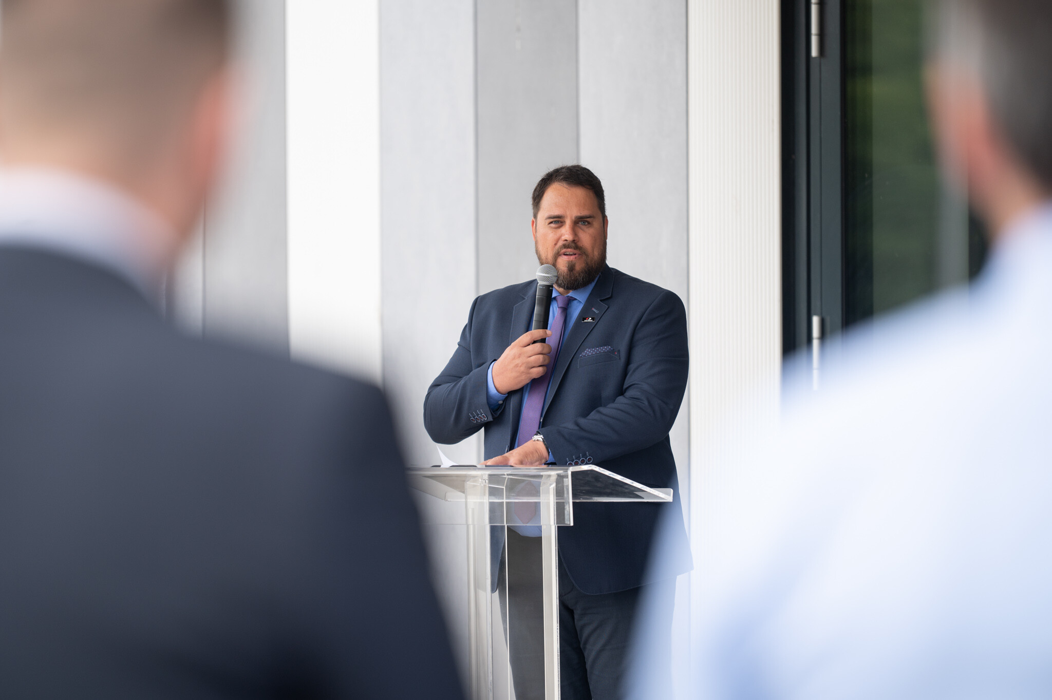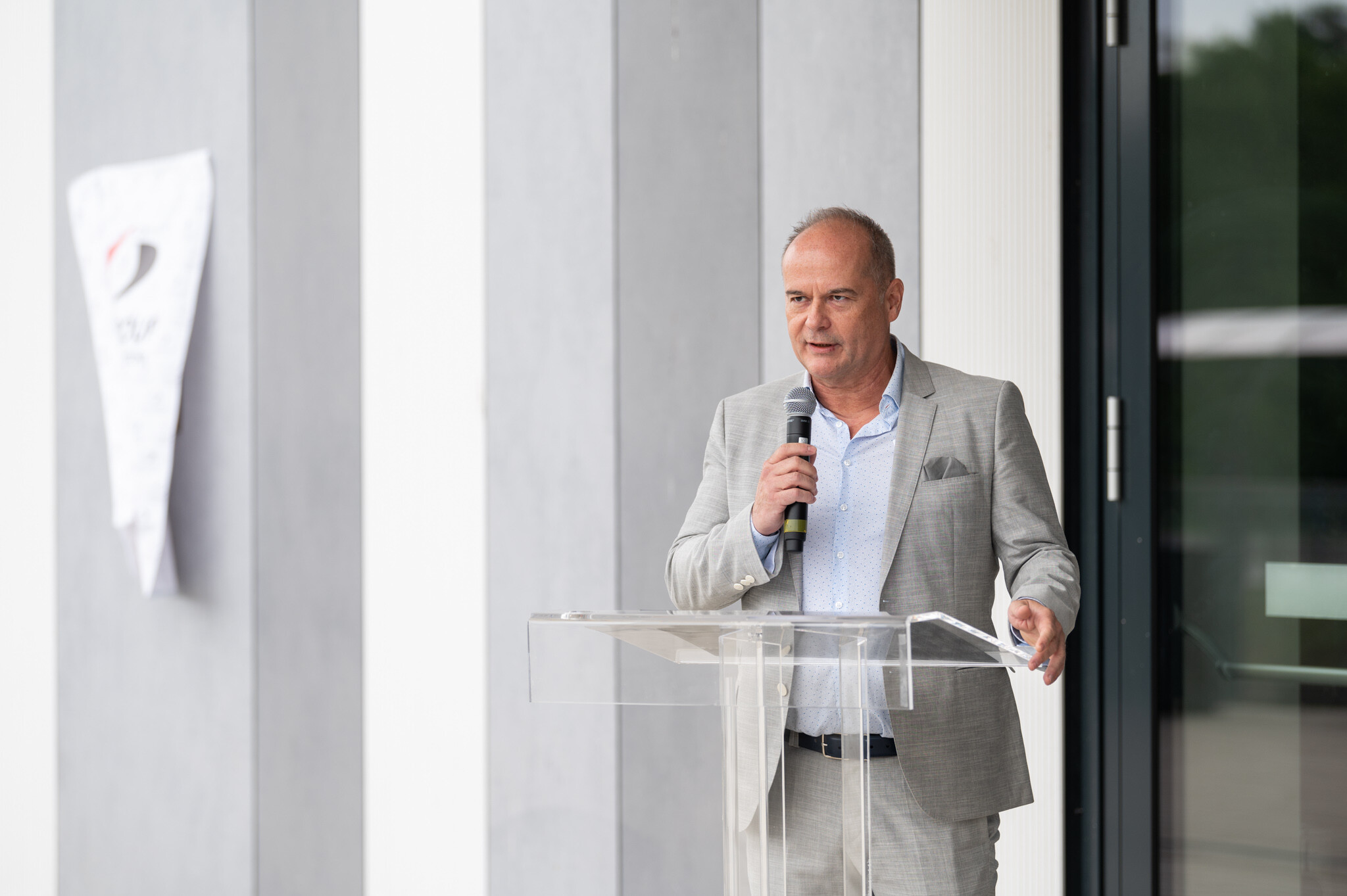 Beszédjében végig követte a Design & Build konstrukcióban elkészült komplexum kivitelezésének állomásait: megemlítette a 2019. november 29-én ünnepélyes keretek közti alapkőletételt, az előkészületek utáni, a következő év januárjában elrajtolt építkezés kezdetét, majd az első acél főtartó ezután egy évvel történt beemelését, valamint a 2021 decemberi teltházas BL mérkőzéssel egybekötött ünnepélyes átadás dátumát is.