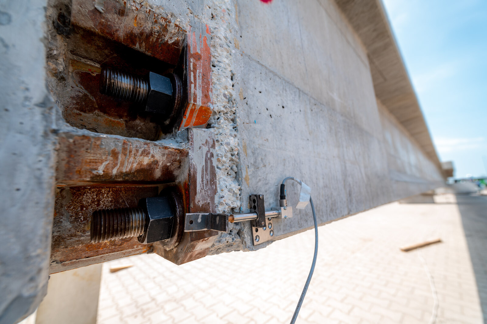 Ezt követte a terhelés, amelynek során precíziós elektronikus szenzorokkal mérték a gerenda lehajlását, a felső öv keresztirányú kitérését, illetve a toldási csomópontban mindkét oldalon a felső és az alsó toldóelemek vonalában fellépő hosszirányú alakváltozást.