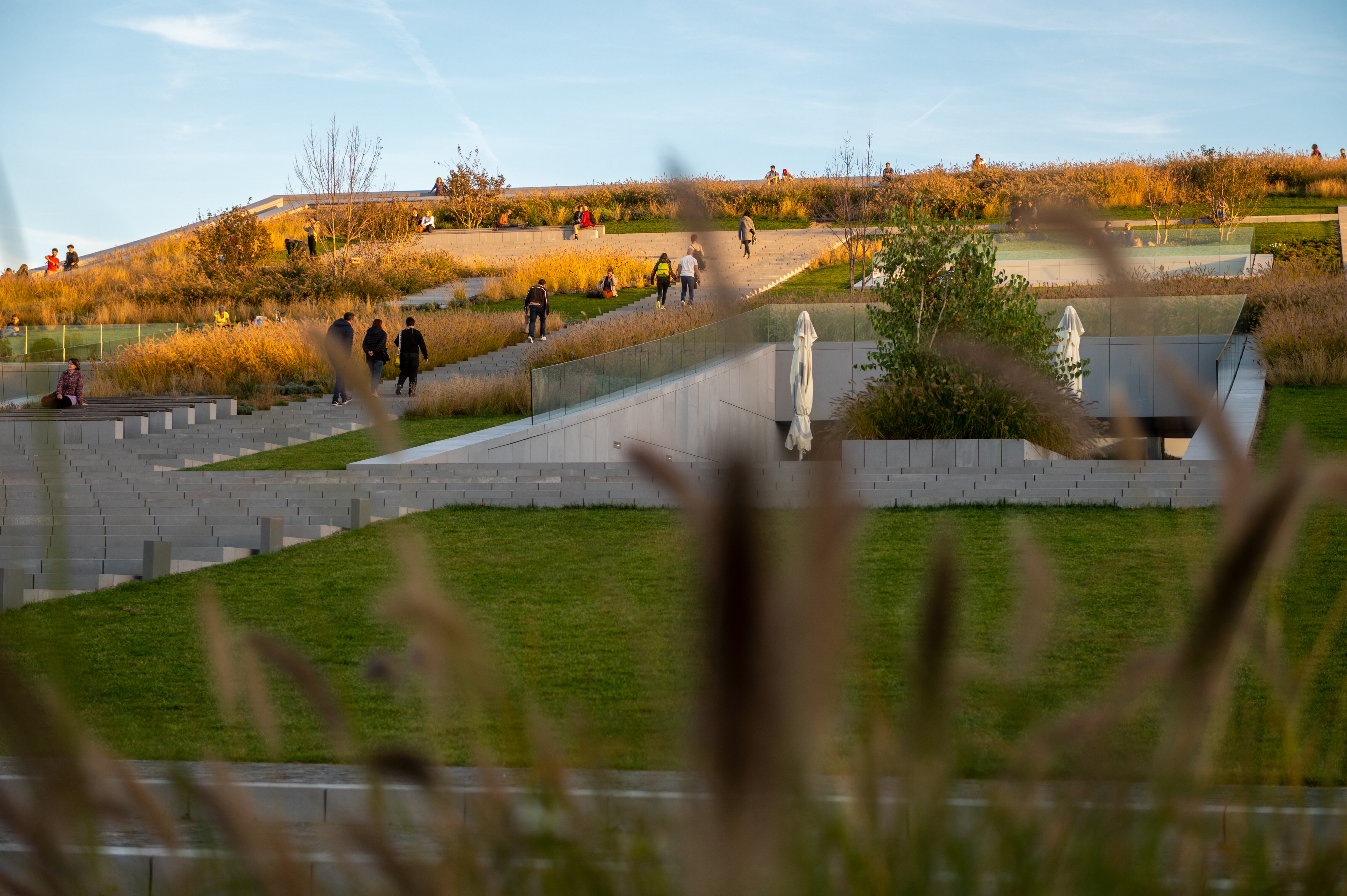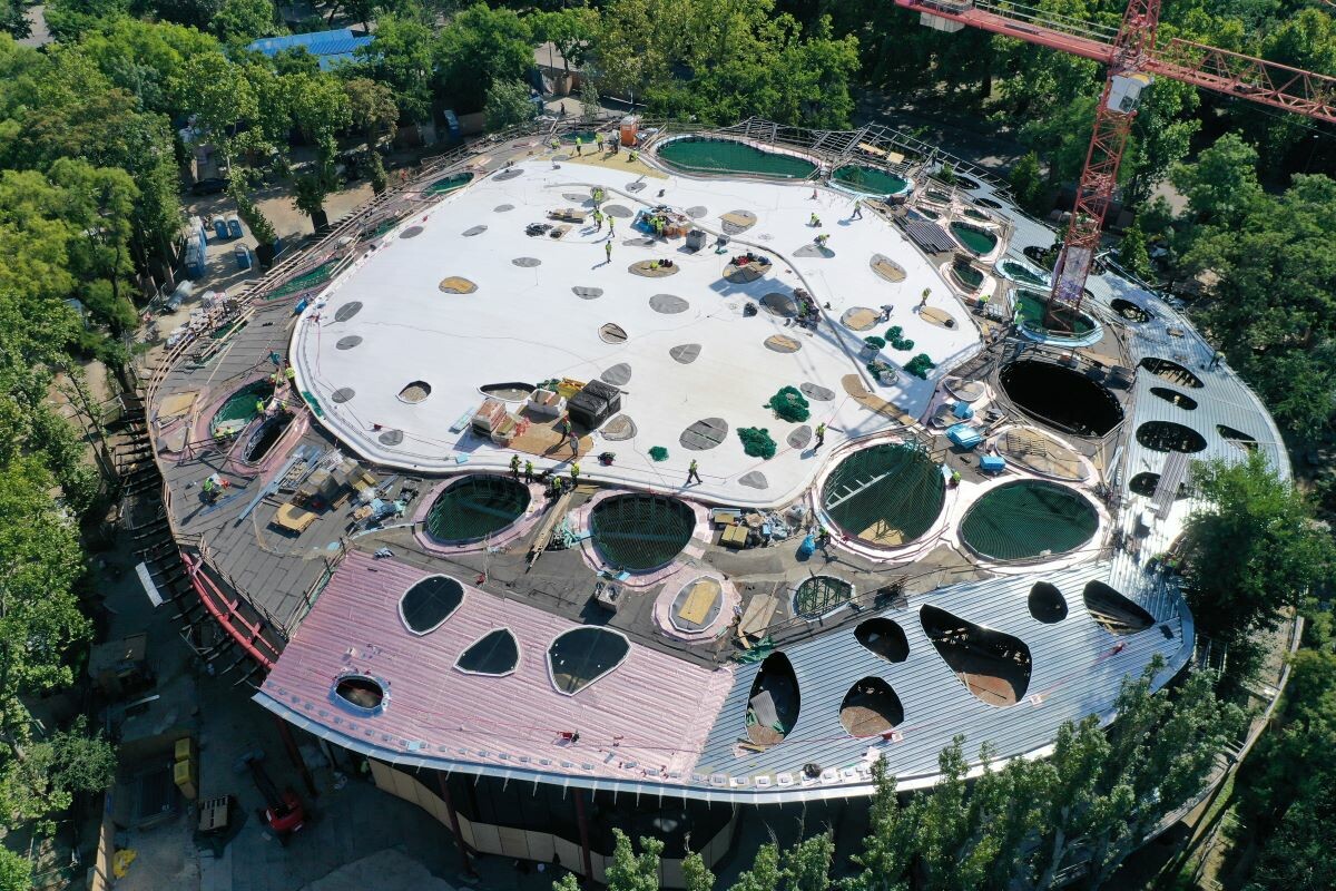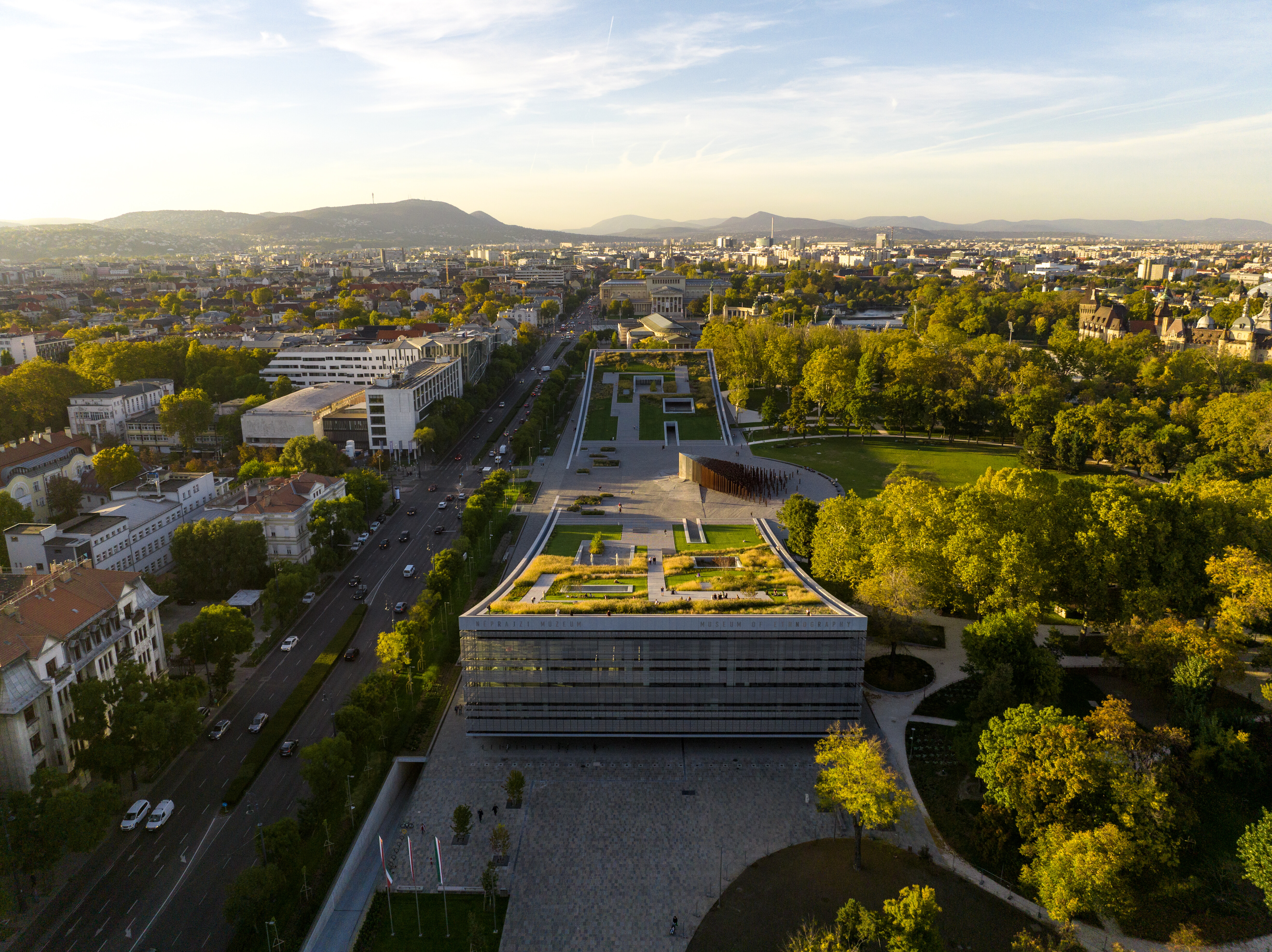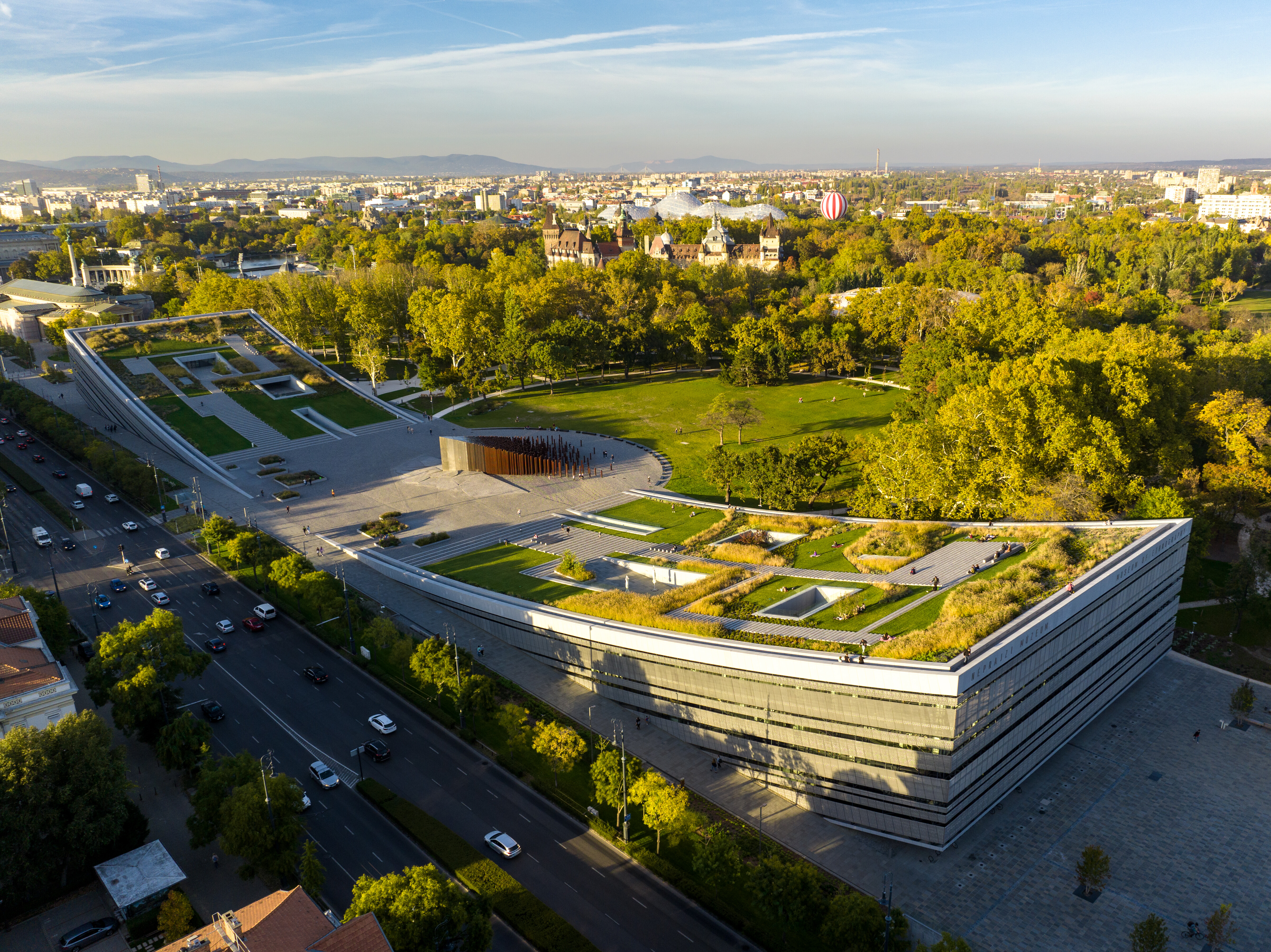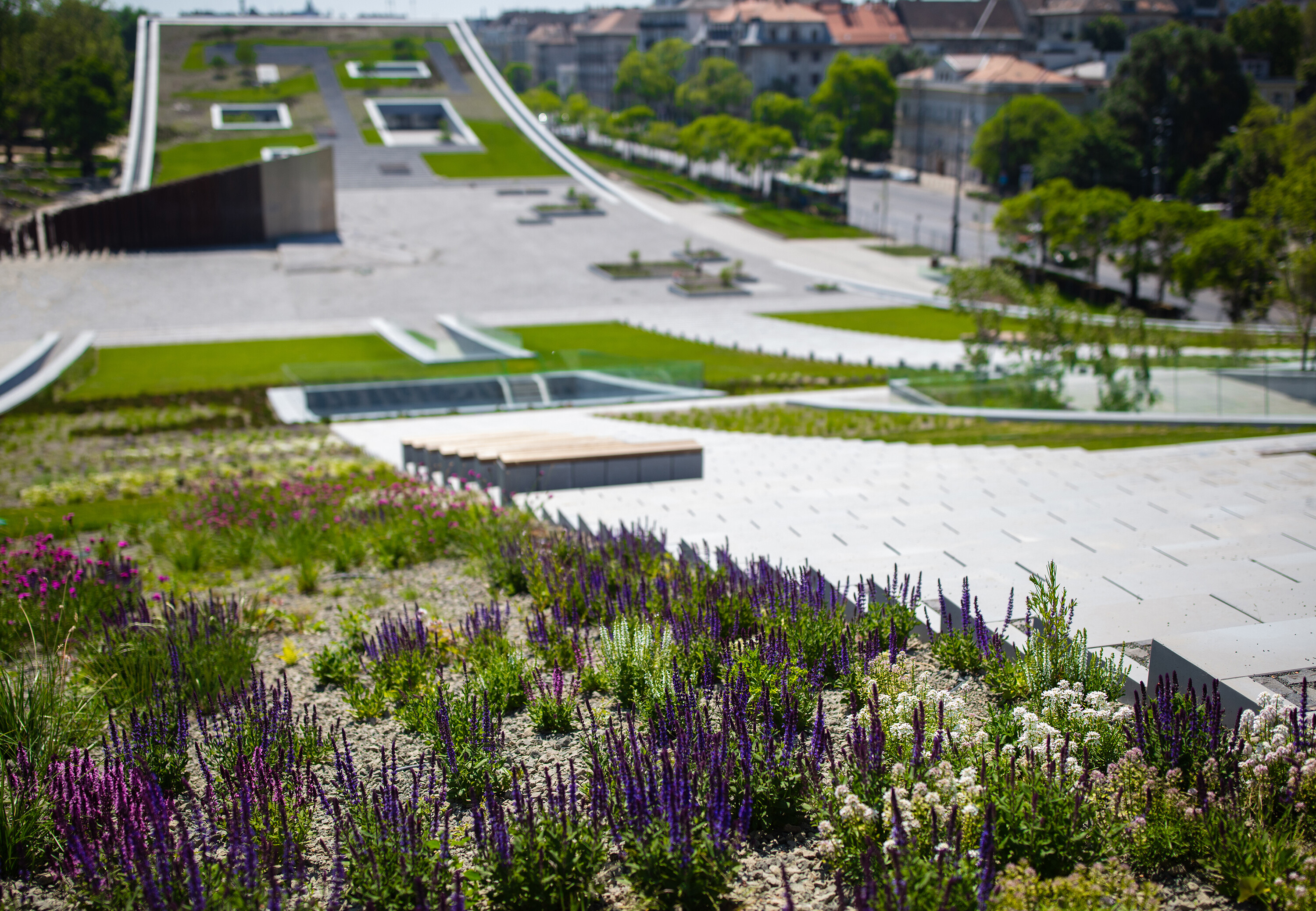 A Városliget zöld kiterjesztéseként funkcionáló tetőkertben több mint 3.000 köbméter, speciális tápanyagokkal dúsított termőtalajt terítettek el az épület domboldalain, melyekbe növényeket és fákat ültettek. Virágos és hagymás évelőkből mintegy 1.500, lombos cserjékből 7 db, örökzöldből közel 100 db, díszfűből mintegy 700 példányt ültettek el. Összességében 7.300 négyzetméternyi parkfelületet alakítottak ki az épület tetőívén, amely hangulatos közösségi térként várja a látogatókat, legmagasabb pontján pedig lenyűgöző panorámát nyújt a Városligetre és a fővárosra.