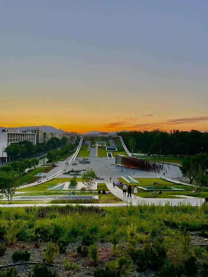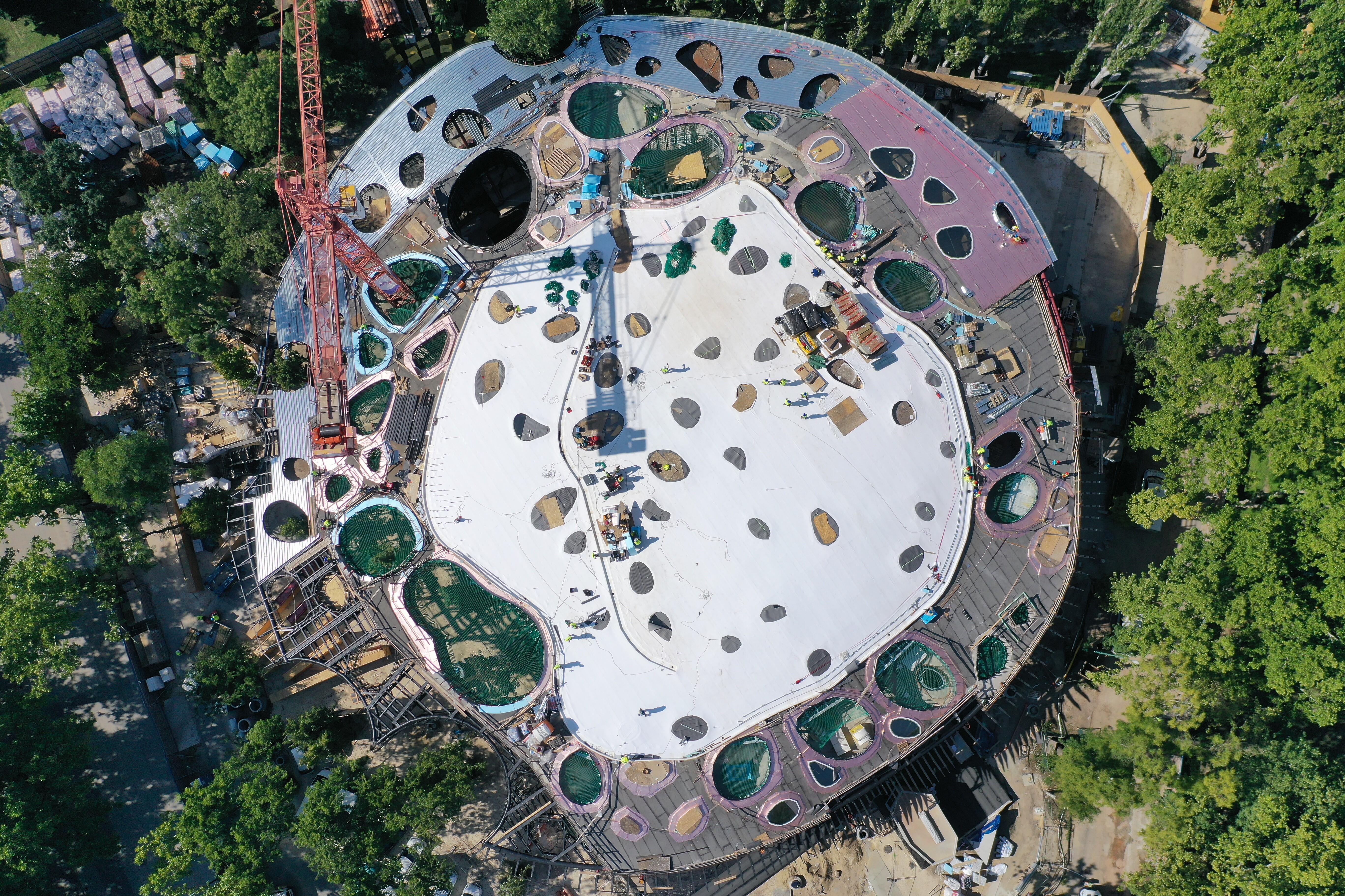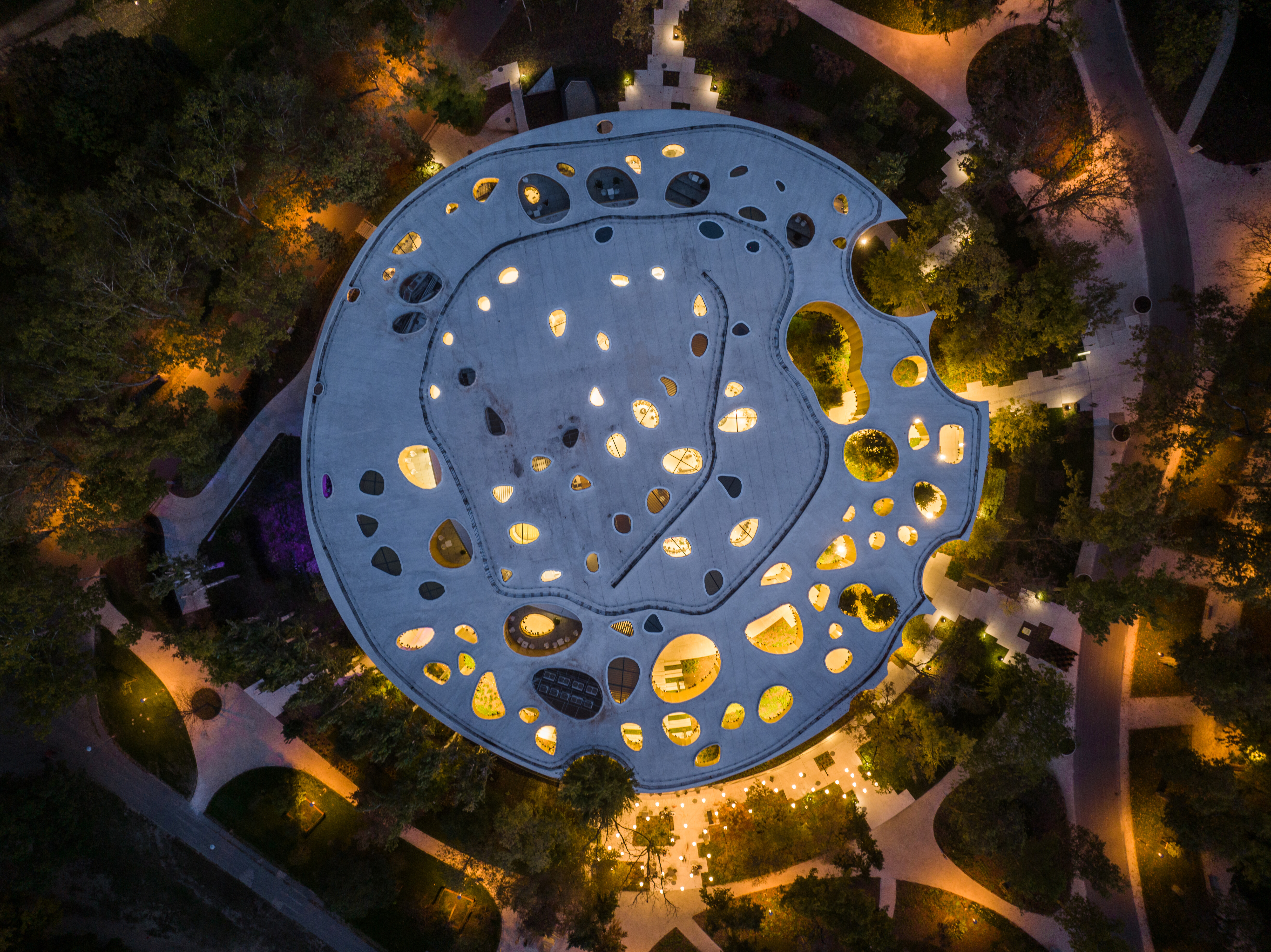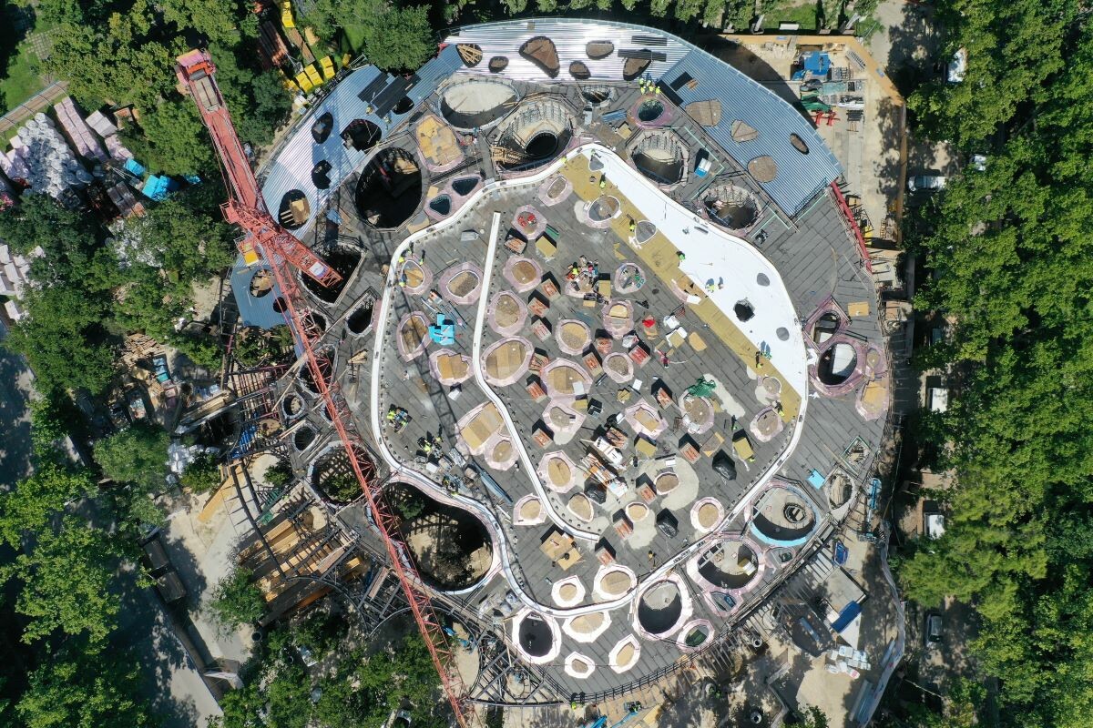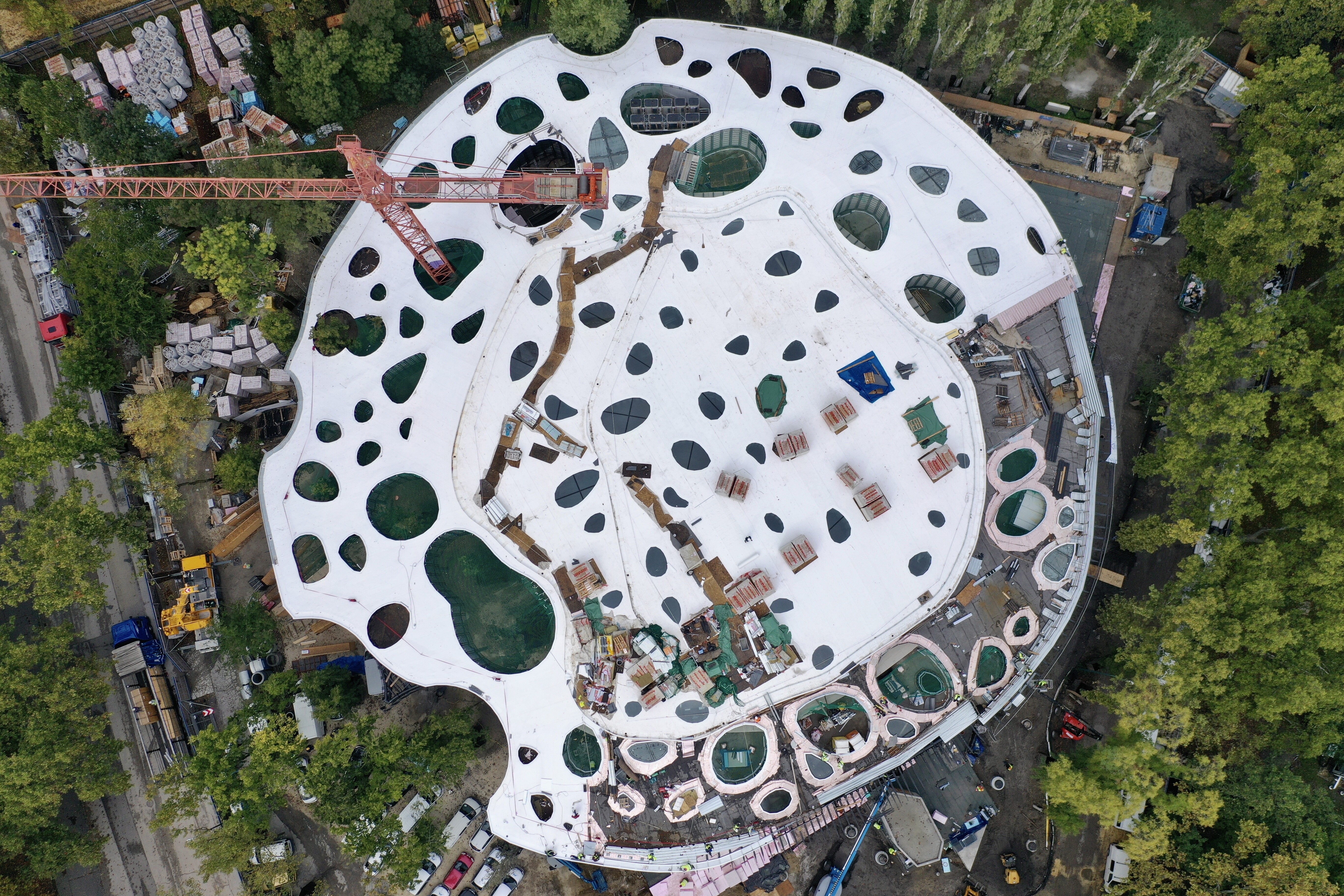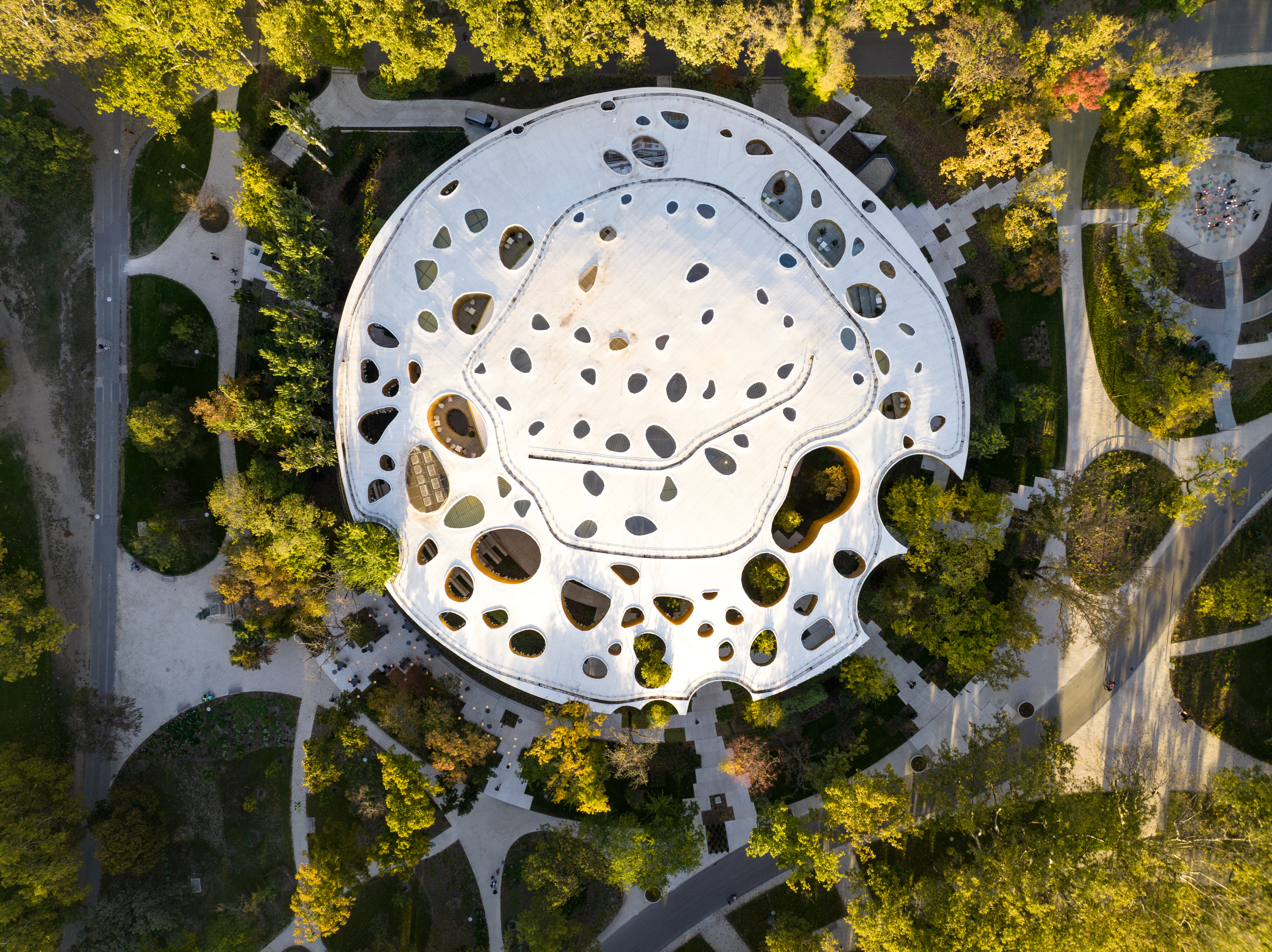A Városliget zöld kiterjesztéseként funkcionáló tetőkertben több mint 3.000 köbméter, speciális tápanyagokkal dúsított termőtalajt terítettek el az épület domboldalain, melyekbe növényeket és fákat ültettek. Virágos és hagymás évelőkből mintegy 1.500, lombos cserjékből 7 db, örökzöldből közel 100 db, díszfűből mintegy 700 példányt ültettek el. Összességében 7.300 négyzetméternyi parkfelületet alakítottak ki az épület tetőívén, amely hangulatos közösségi térként várja a látogatókat, legmagasabb pontján pedig lenyűgöző panorámát nyújt a Városligetre és a fővárosra.