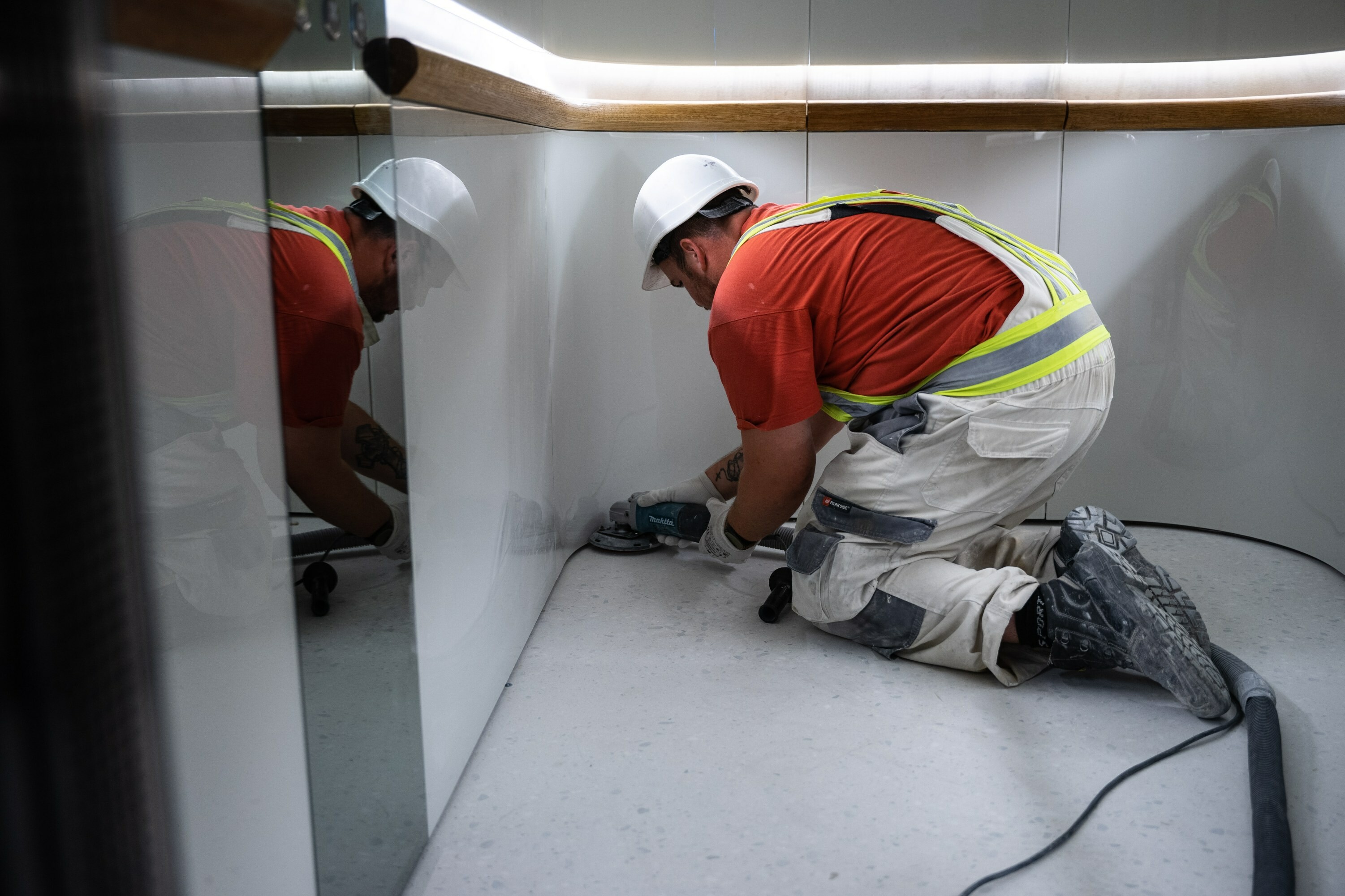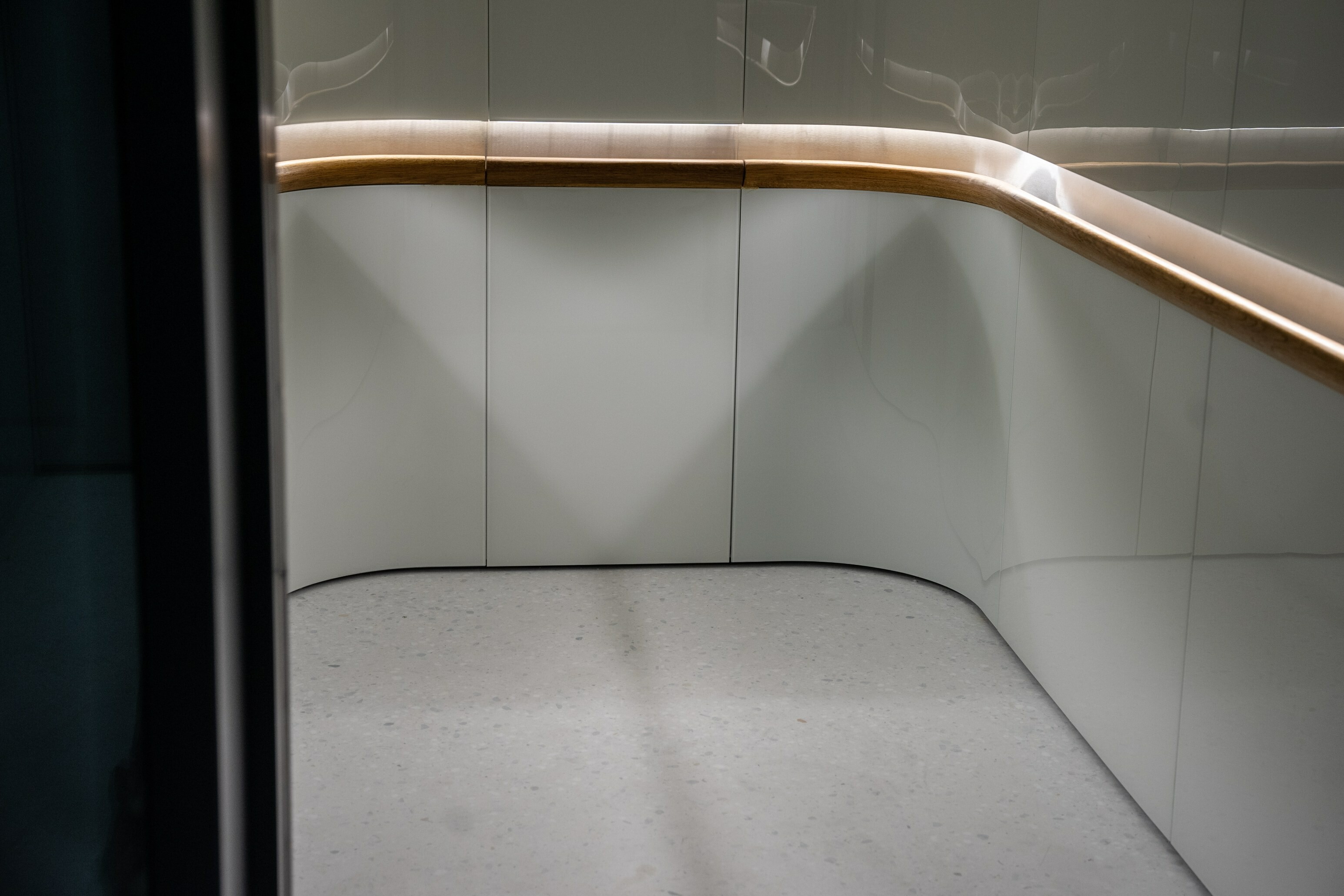 A lifteknél nagyon hasonlított a rétegrend az általános felületi rétegrendhez, annyiban tér el, hogy a liftek aljára egy acéllemez került. Minden egyes lift emiatt egy külön egyedi megoldást kapott. Tizedmilliméter pontosan kellett kialakítani a burkolatot, mert mindenhol üveggel burkolták körbe. Aprólékos, finom, nagyon átgondolt, precíz munka kellett hozzá. Nem minden részletében hasonlítható az általános felülethez.