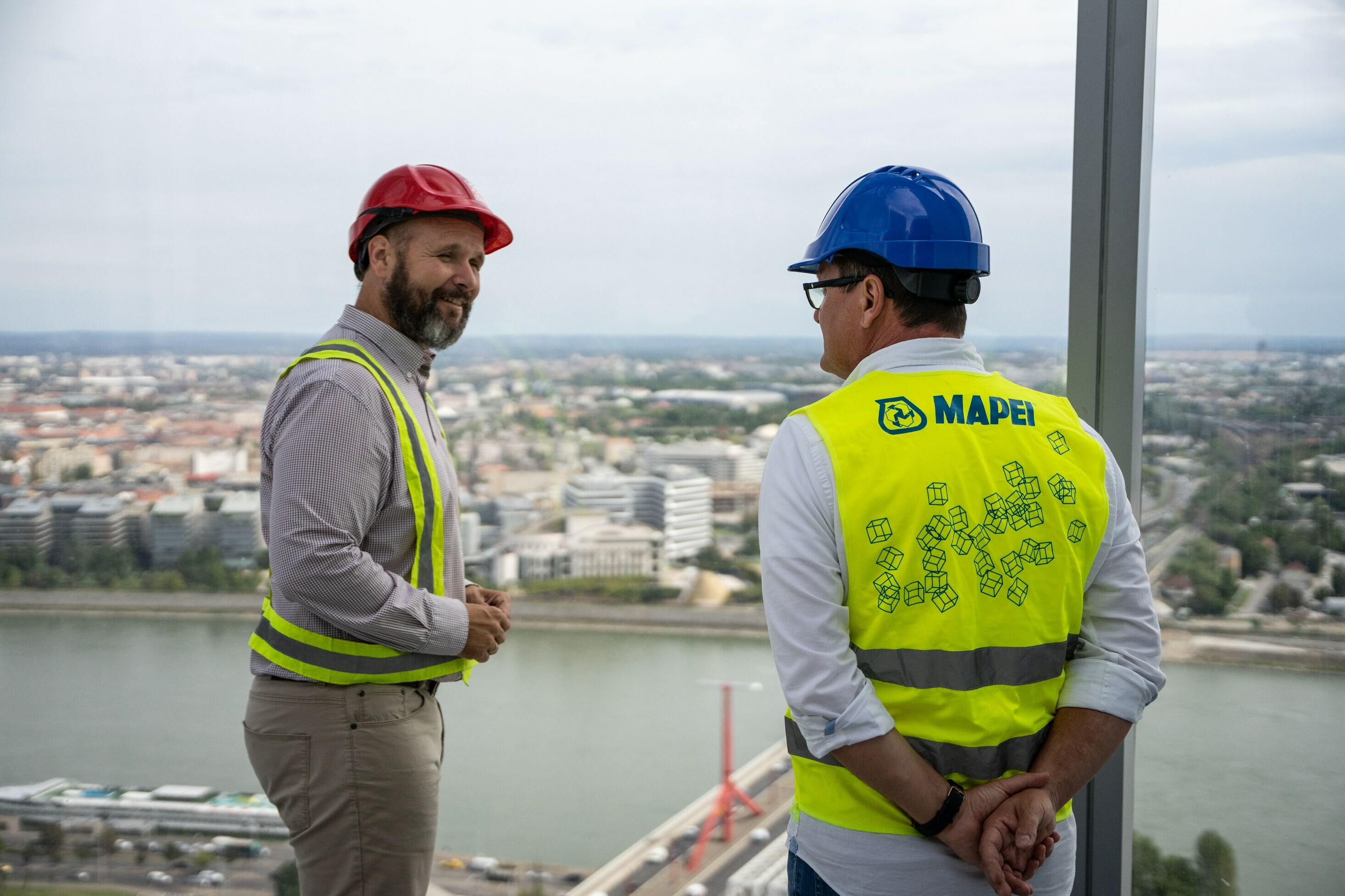 N.S.: Mapei részéről minden dimenziója kihívás volt. Az első komoly lépés egyáltalán elnyerni a munkát, és megtalálni azt a burkolatot, ami képes hozni azt az exkluzív felületet, ami passzol egy ilyen épülethez. Végül is ez az első felhőkarcoló Magyarországon. Továbbá össze kellett hangolni azzal, hogy a műszaki tartalom mellett megfeleljen a tűzvédelmi előírásoknak is. Az ULTRATOP képes ezt abszolválni, mégpedig a A2-es minősítésben, menekülési útvonalhoz lépcsőházba és liftelőterekben is lehet használni. Ezt más burkolat nem igazán tudná. Logisztikai szempontból fontos volt, hogy ne terheljük túl a raktárunkat, hiszen más feladataink is voltak. Manapság mikor az árak úgy mozognak, mint a nádszál a szélben, mi képesek voltunk tartani az árainkat az eredetileg kialkudott árszinten.