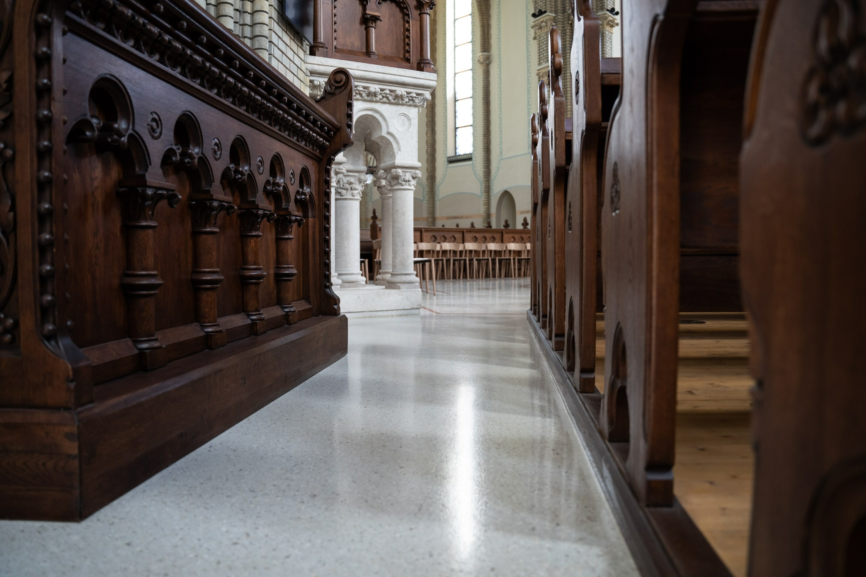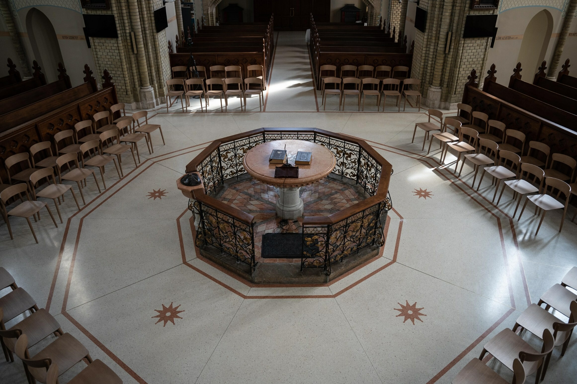 Így a szakkivitelező Palazzo Kft. a meglévő, tönkrement cement-terrazzo burkolatot a műemléki környezetbe szintén illeszkedő korszerű, padlófűtésre is alkalmas műgyantakötésű terrazzo díszburkolatra cserélte le.