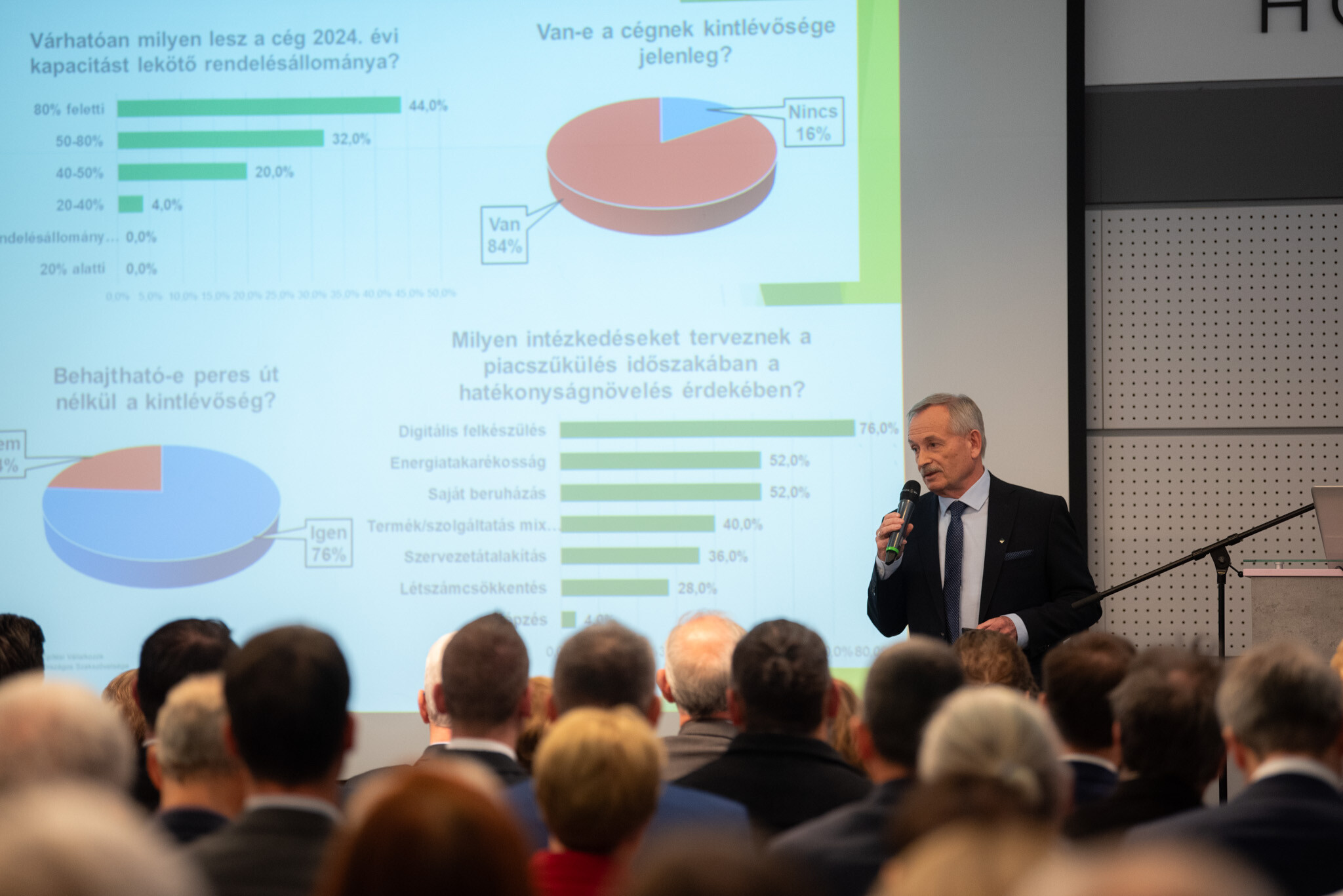 Amint Koji László elnök elmondta: 2023 a várakozások éve volt: várakozás szerződésmódosításokra, megrendelőkre – hiszen idén 30%-kal volt kisebb a megrendelés-állomány; de várakozni kellett az új szabályokra is. Az éves konjunktúra-felmérés ismertetése után felhívta a figyelmet arra,