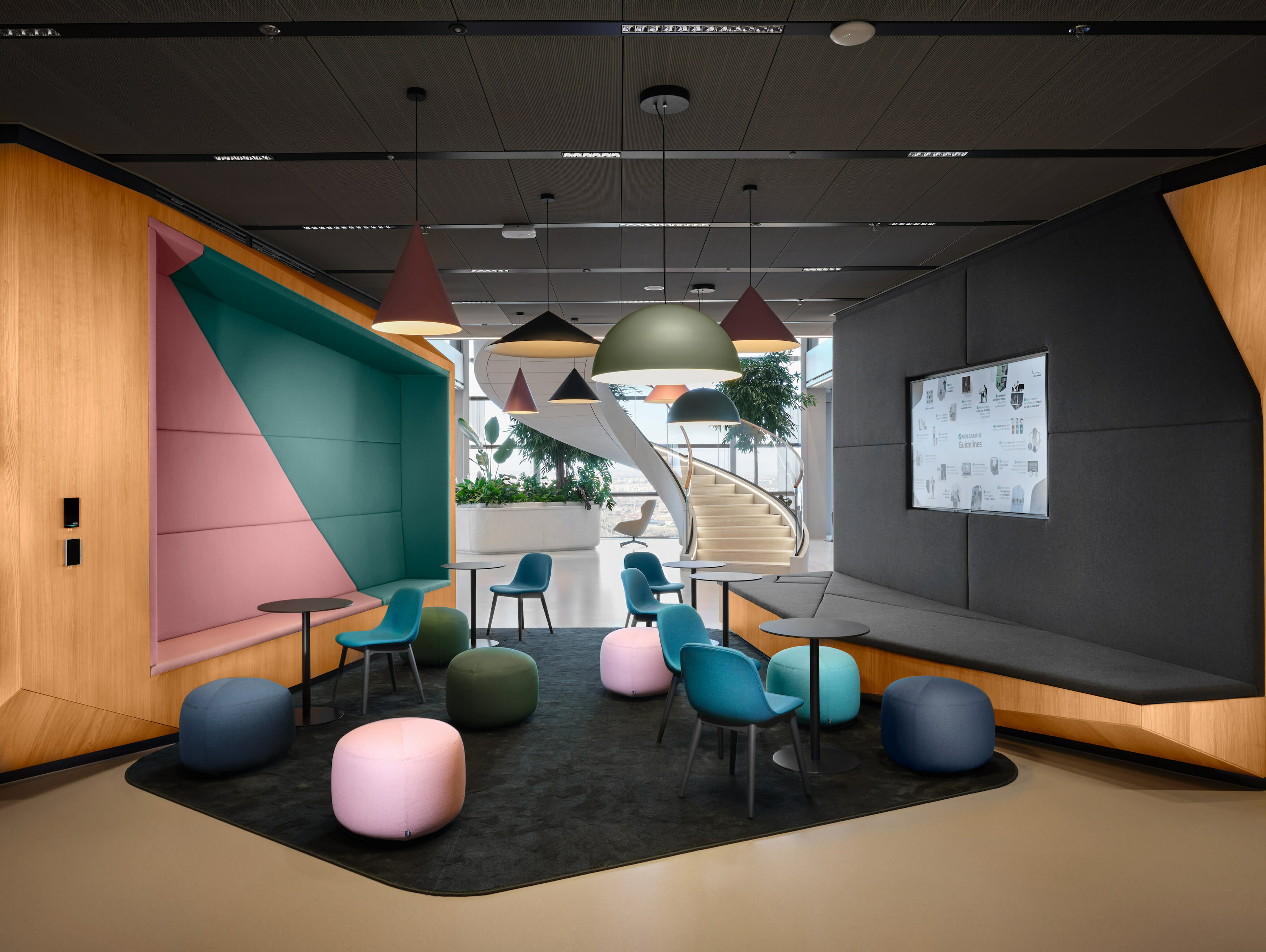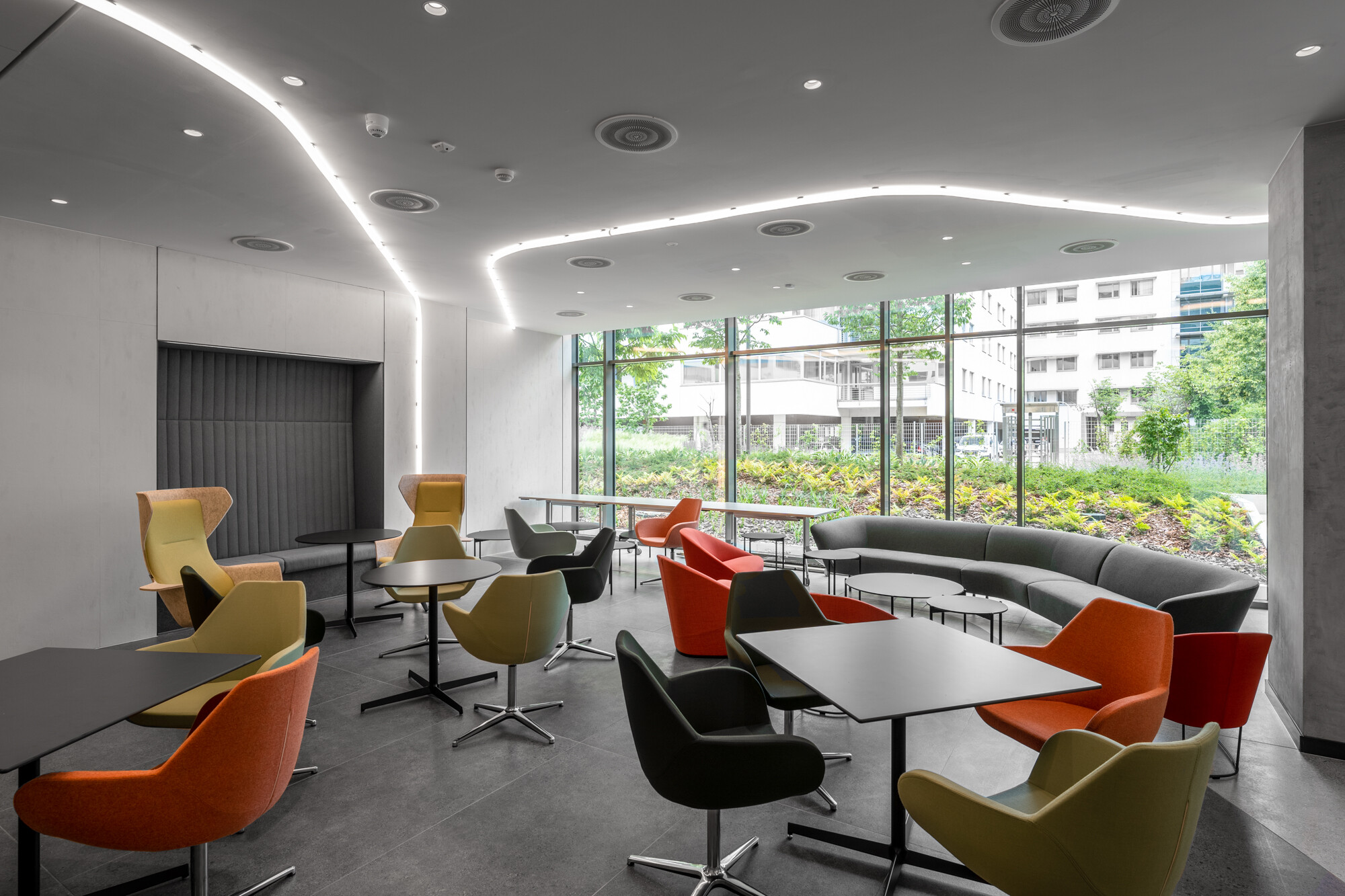 Az egyedi kerámia falburkolat kifejezetten ehhez az épülethez készült, így nagy fokú előre gondolkodásra volt szükség, pontosan meg kellett határozniuk, mennyi lapra lesz szükségük, mert csak 3000 m2 minimum mennyiség esetén tudnak újabb lapokat gyártani. A földszint hidegburkolatánál a tervezési koncepció része volt, hogy a beltéri burkolat vonalvezetése a kerti burkolatban folytatódjon, ennek érdekében a beltéri nagylapos hidegburkolat organikus színhatárait a kültéri terrraway burkolattal összhangba kellett hozni. Ezt végül folyamatos geodéziai kitűzésekkel oldották meg.