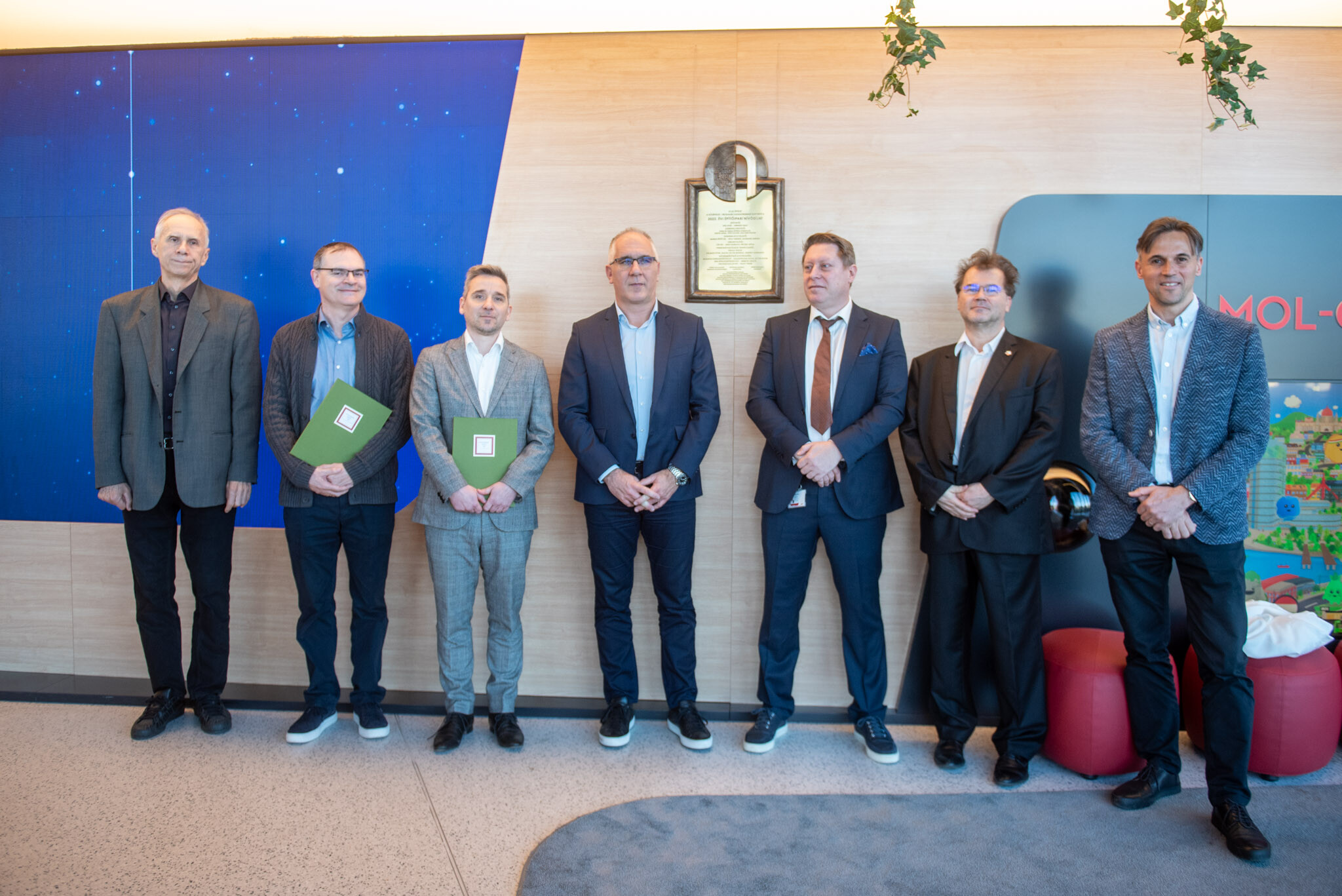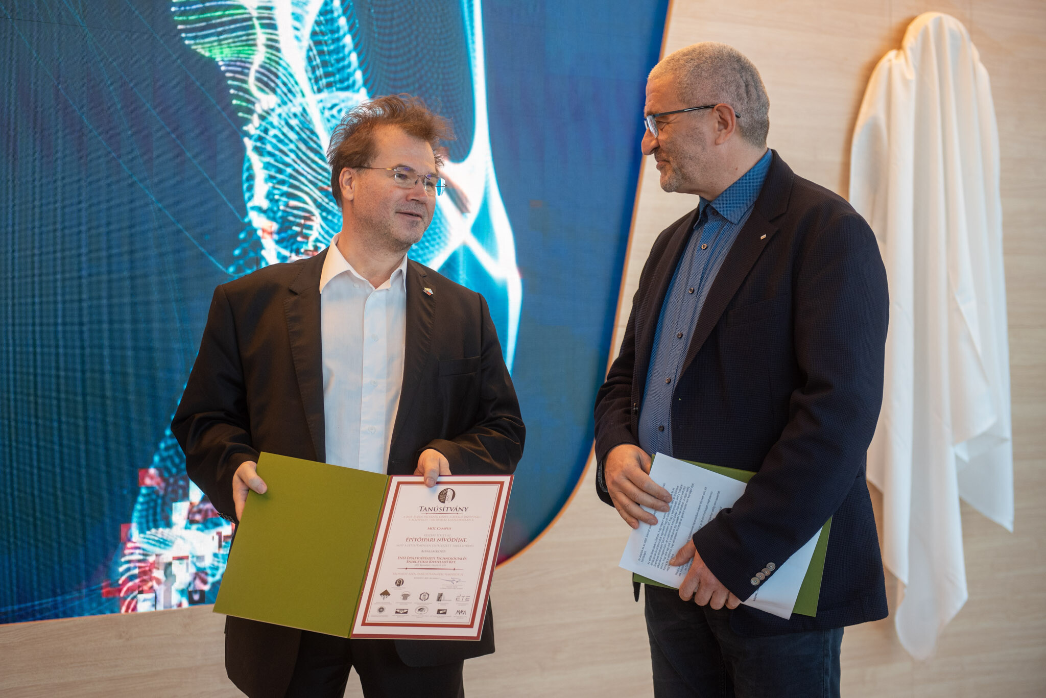 Az ünnepségen elismerő oklevelet adtak át a Mol Campus kivitelezésén dolgozó cégek közül a szerkezetépítő Moratus Kft-nek, az üvegszerkezetek kialakítását végző Orosháza Glas Kft.-nek, valamint az épületgépészeti feladatokat megvalósító ENSI Kft. képviselőjének.