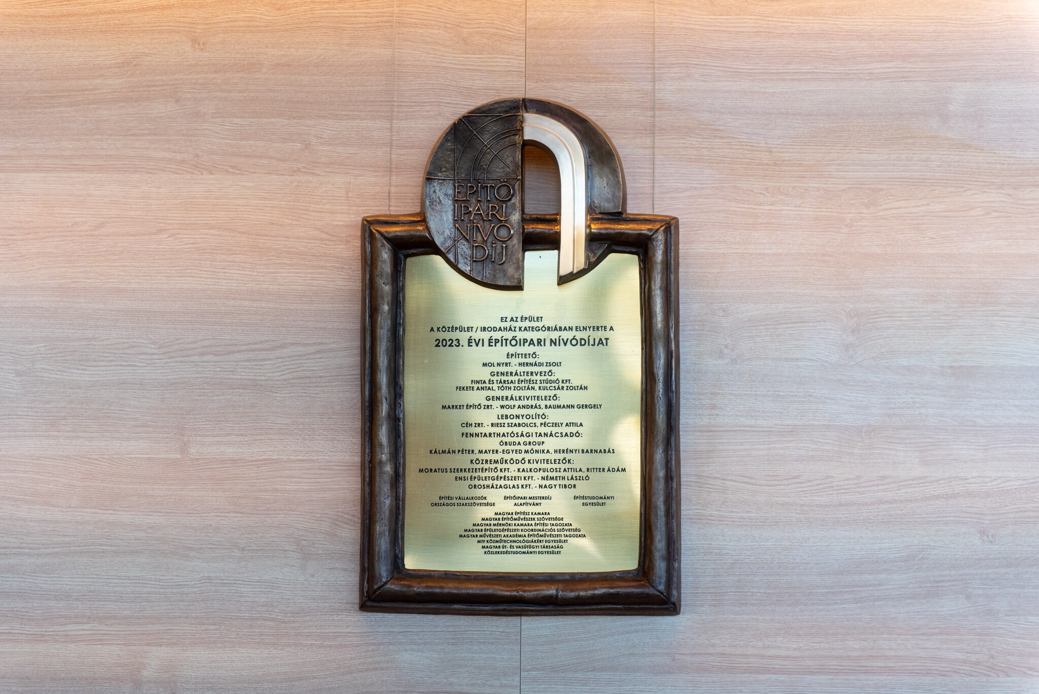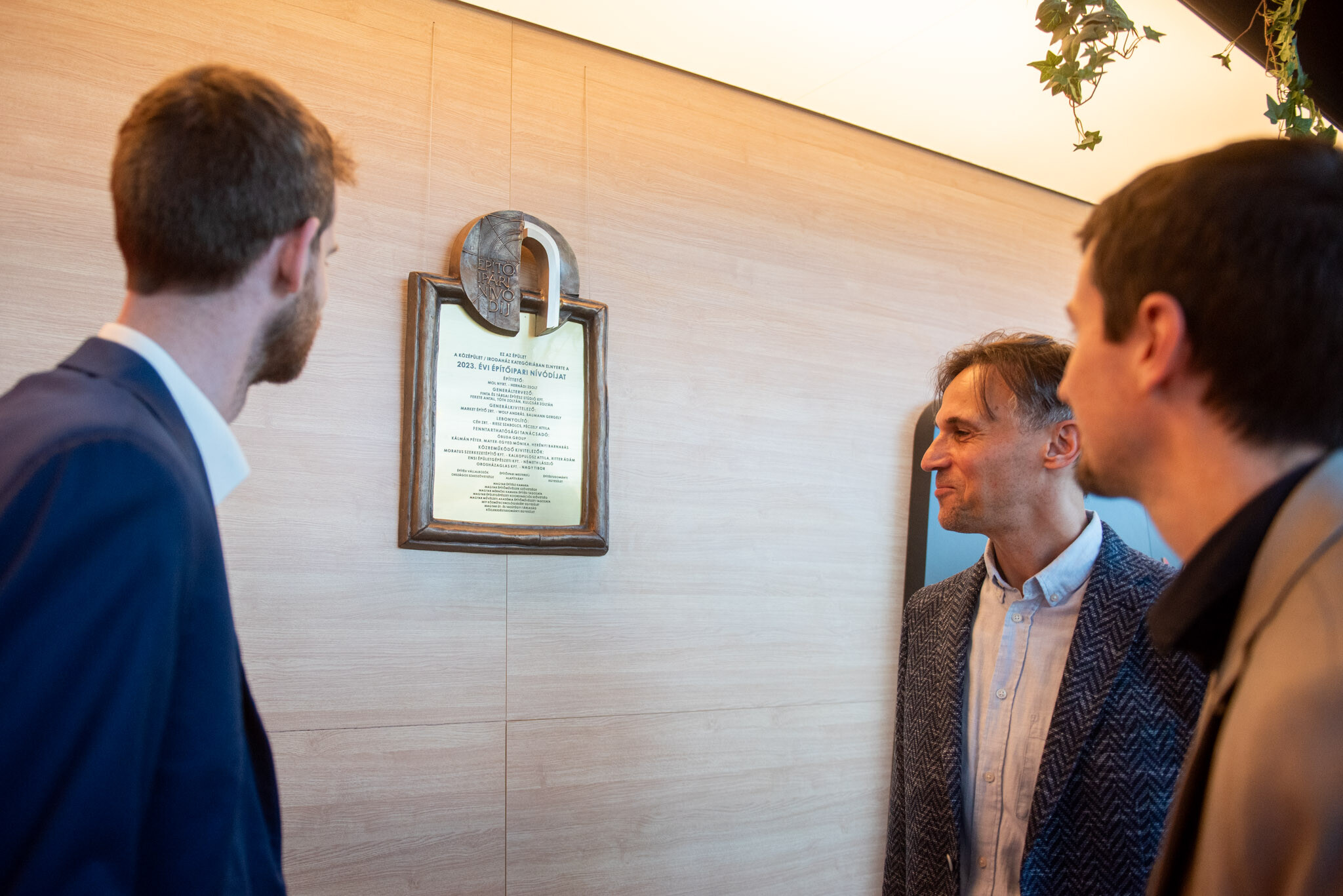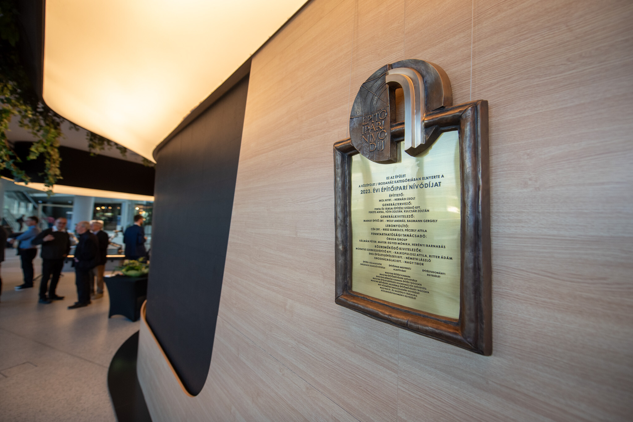 Ünnepség keretében leleplezték a bronztáblát, amely megörökíti, hogy középület és irodaház kategóriában 2023-ban a Mol Campusnak ítélték oda az Építőipari Nívódíjat.