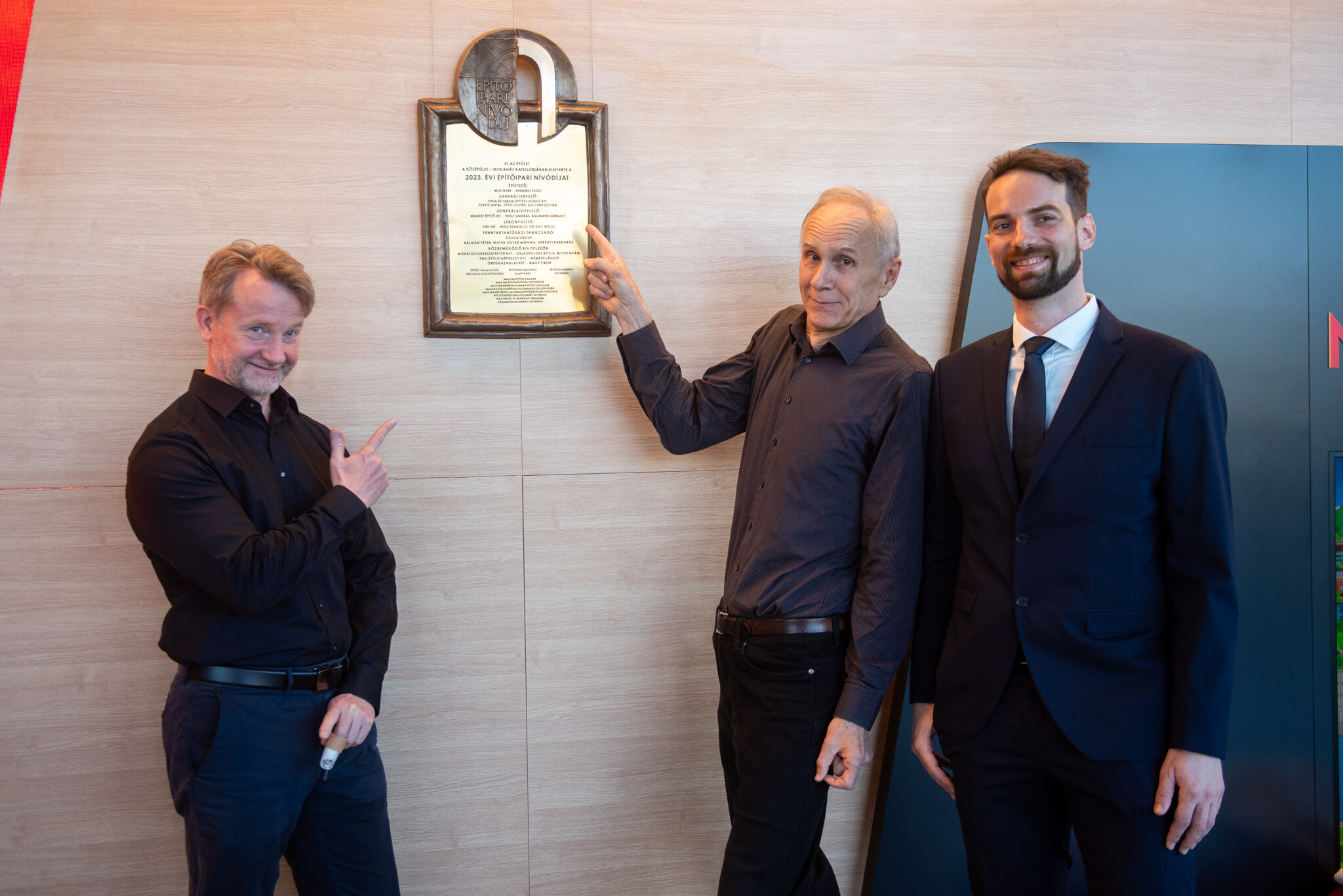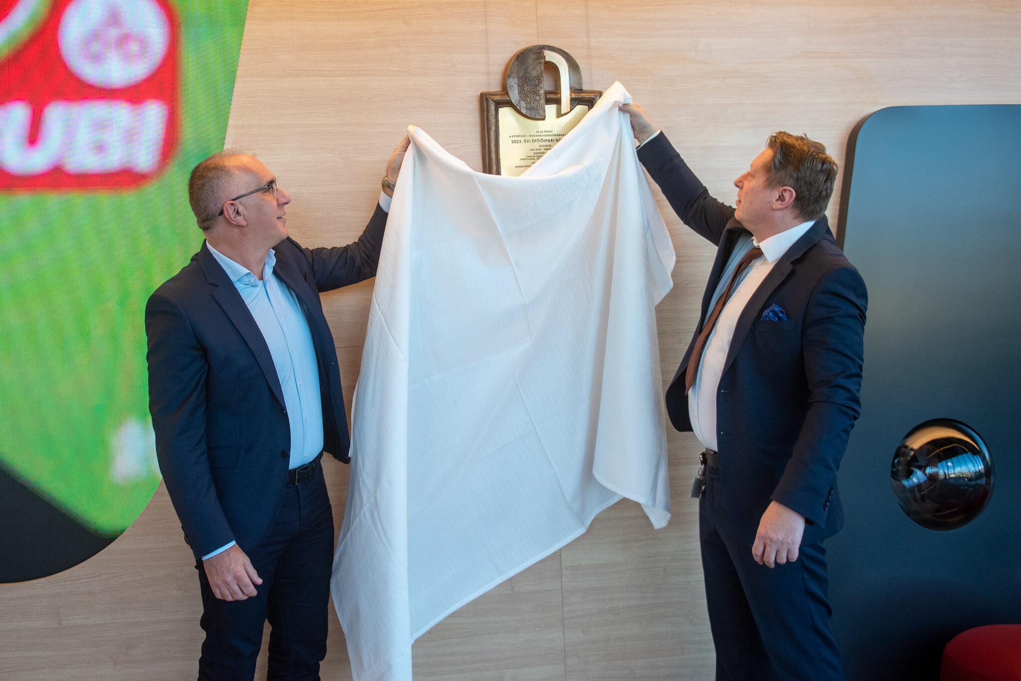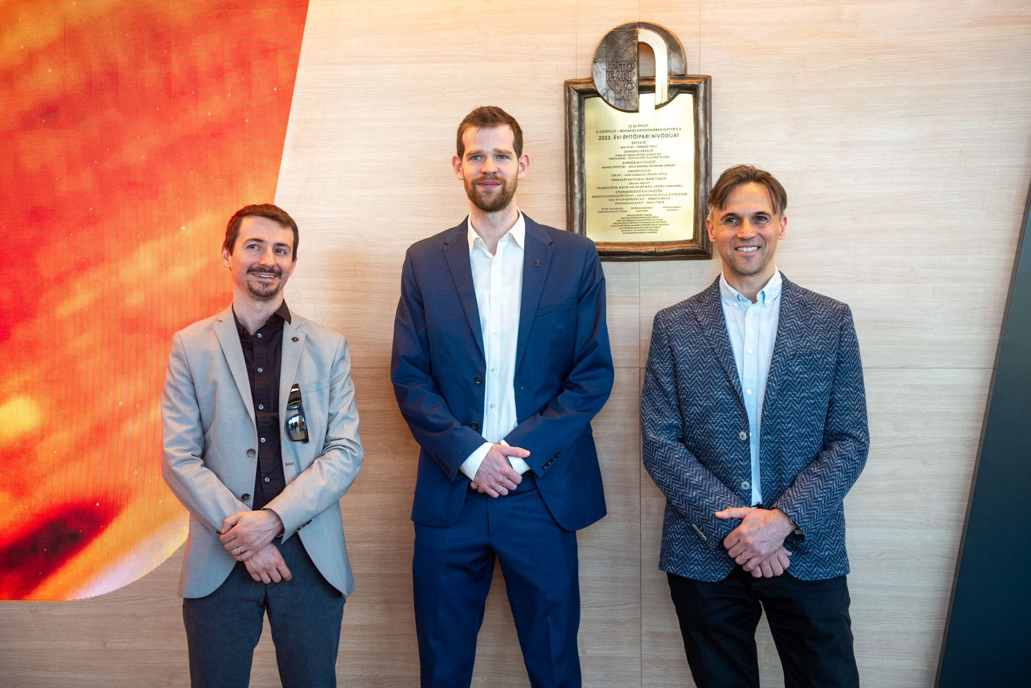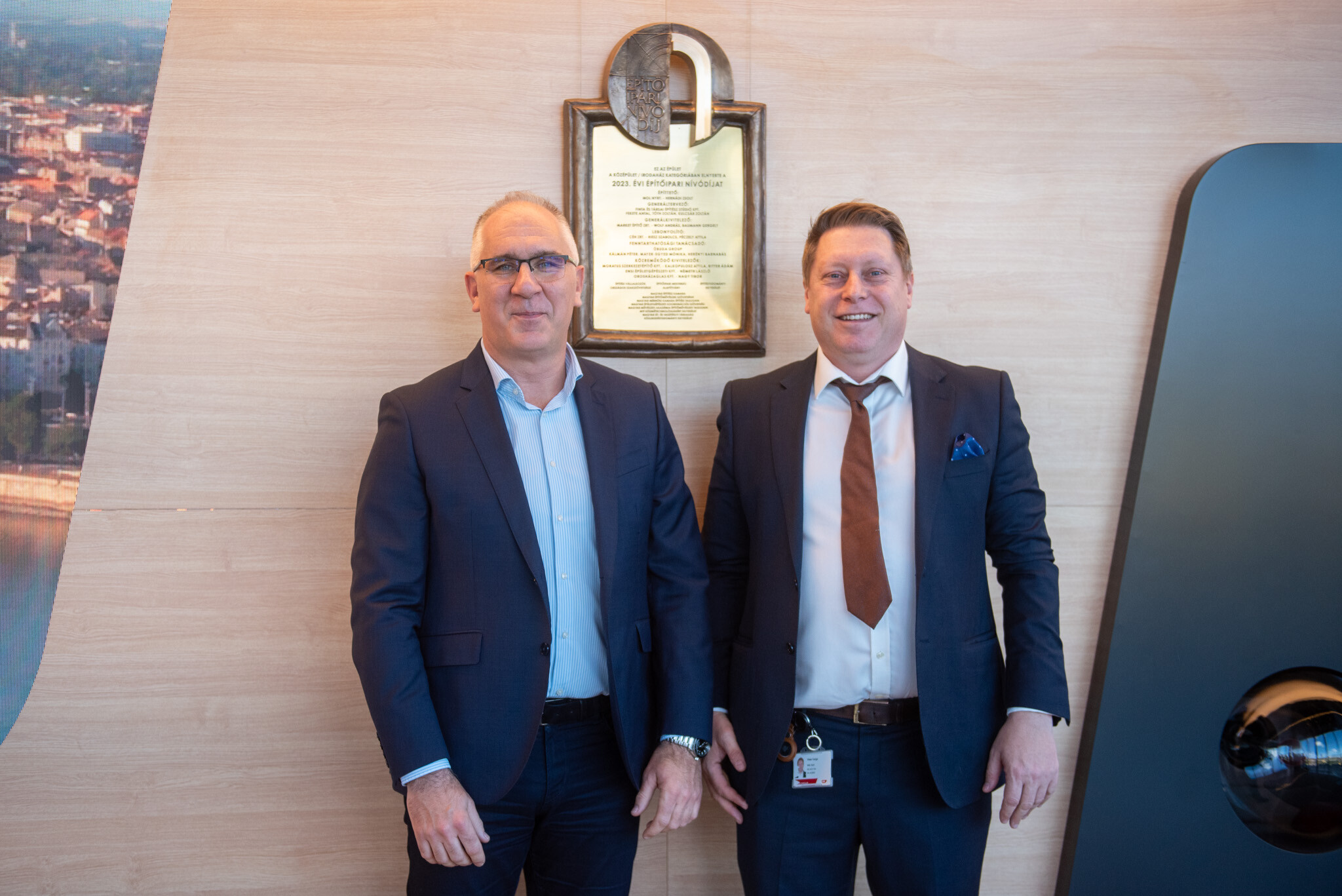 Ünnepség keretében leleplezték a bronztáblát, amely megörökíti, hogy középület és irodaház kategóriában 2023-ban a Mol Campusnak ítélték oda az Építőipari Nívódíjat.