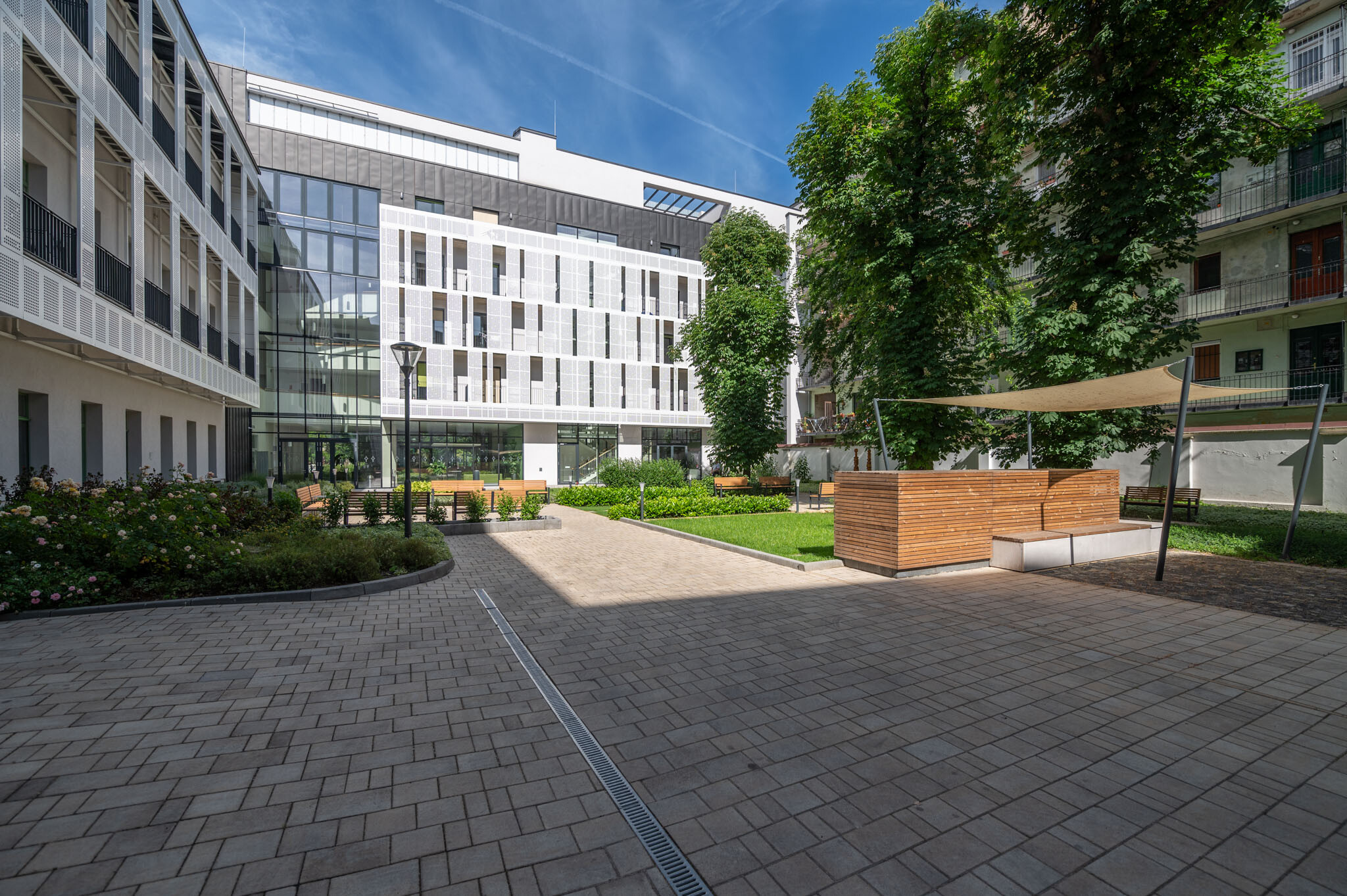 Mindemellett nem elhanyagolható szempont a kültéri területek kialakítása sem. Az épületegyüttes belső részén egy 530 m2 nagyságú zöldfelület és egy 45 férőhelyes kerékpártároló kapott helyet.
